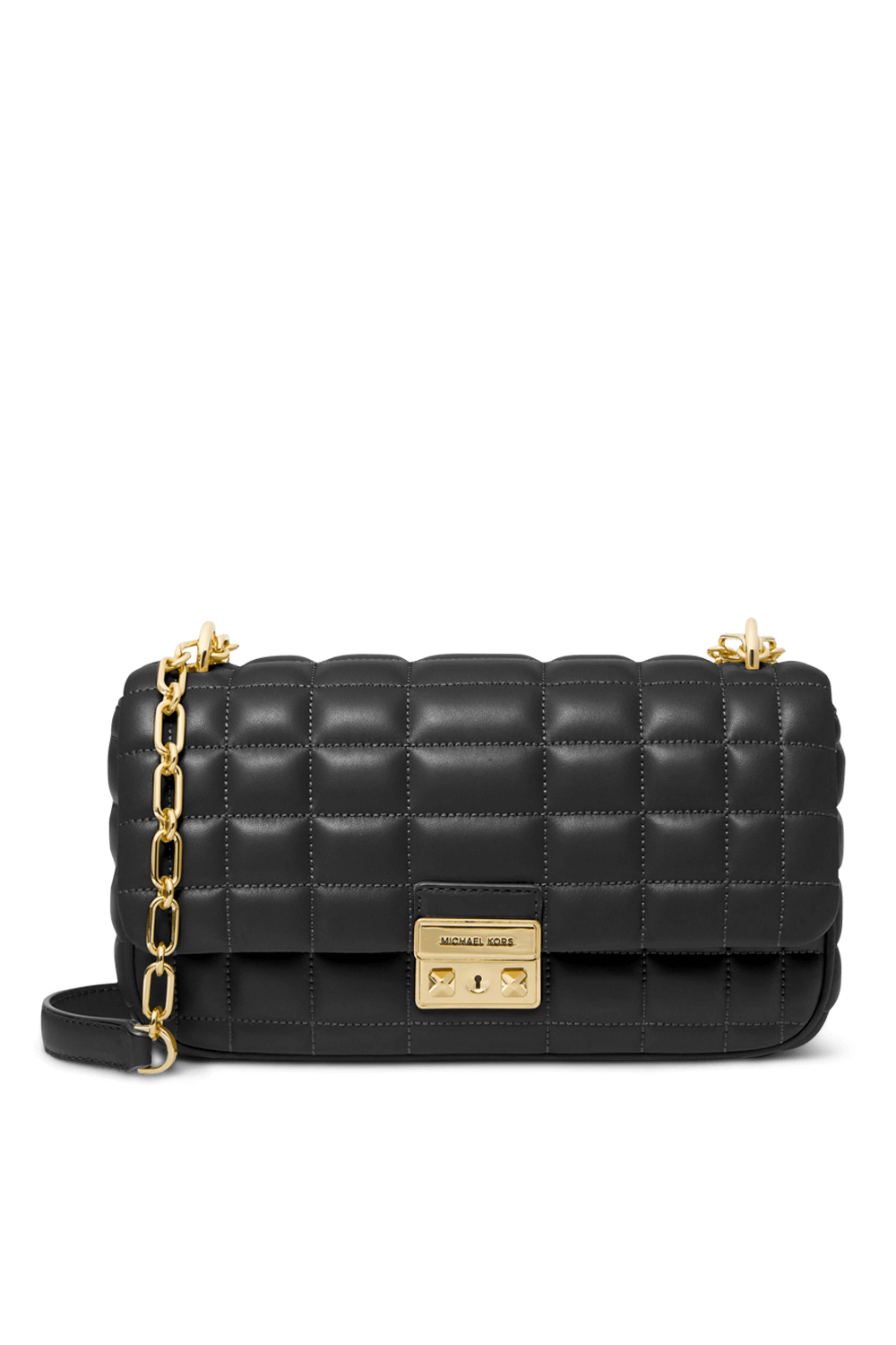 תיק כתף מדגם Tribeca בגודל לארג' מבית Michael Kors, עשוי עור בצבע שחור ובמראה קווילט. לתיק תא מרכזי עם כיס פנימי קטן בסגירת מגנט, והוא מגיע עם רצועת נשיאה המשלבת שתי שרשראות זהובות ועור, לנשיאה כתיק קרוסבודי או כתף.