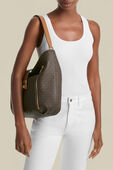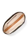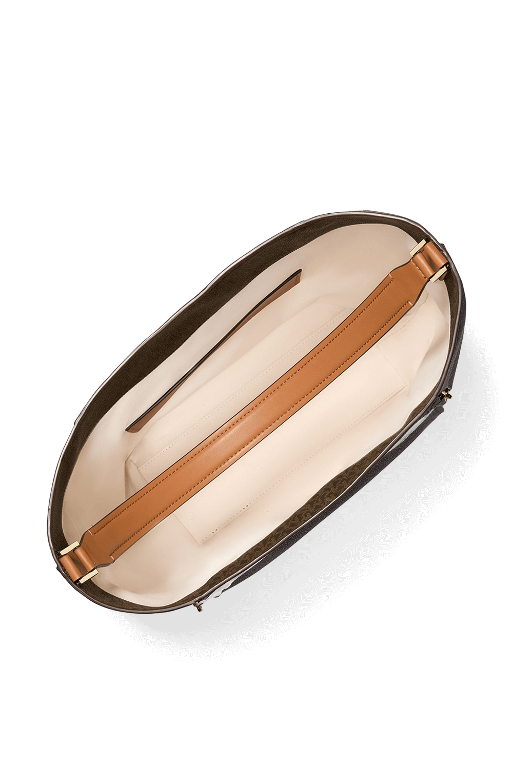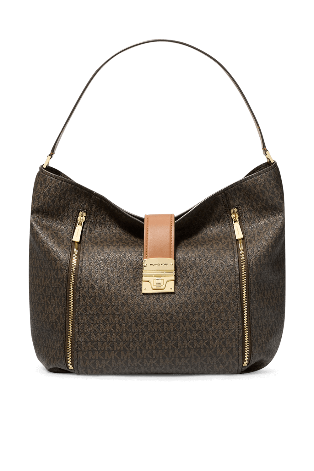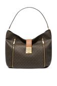תיק כתף Addison בגודל לארג' מבית Michael Kors, עשוי קנבס בצבע חום ובדוגמת לוגו MK, עם דיטיילים מעור בצבע חום. יש לו תא איחסון מרווח עם כיס פנימי ושני תאים חיצוניים בסגירת רוכסנים. יש לו רצועת כתף והוא נסגר במגנט.