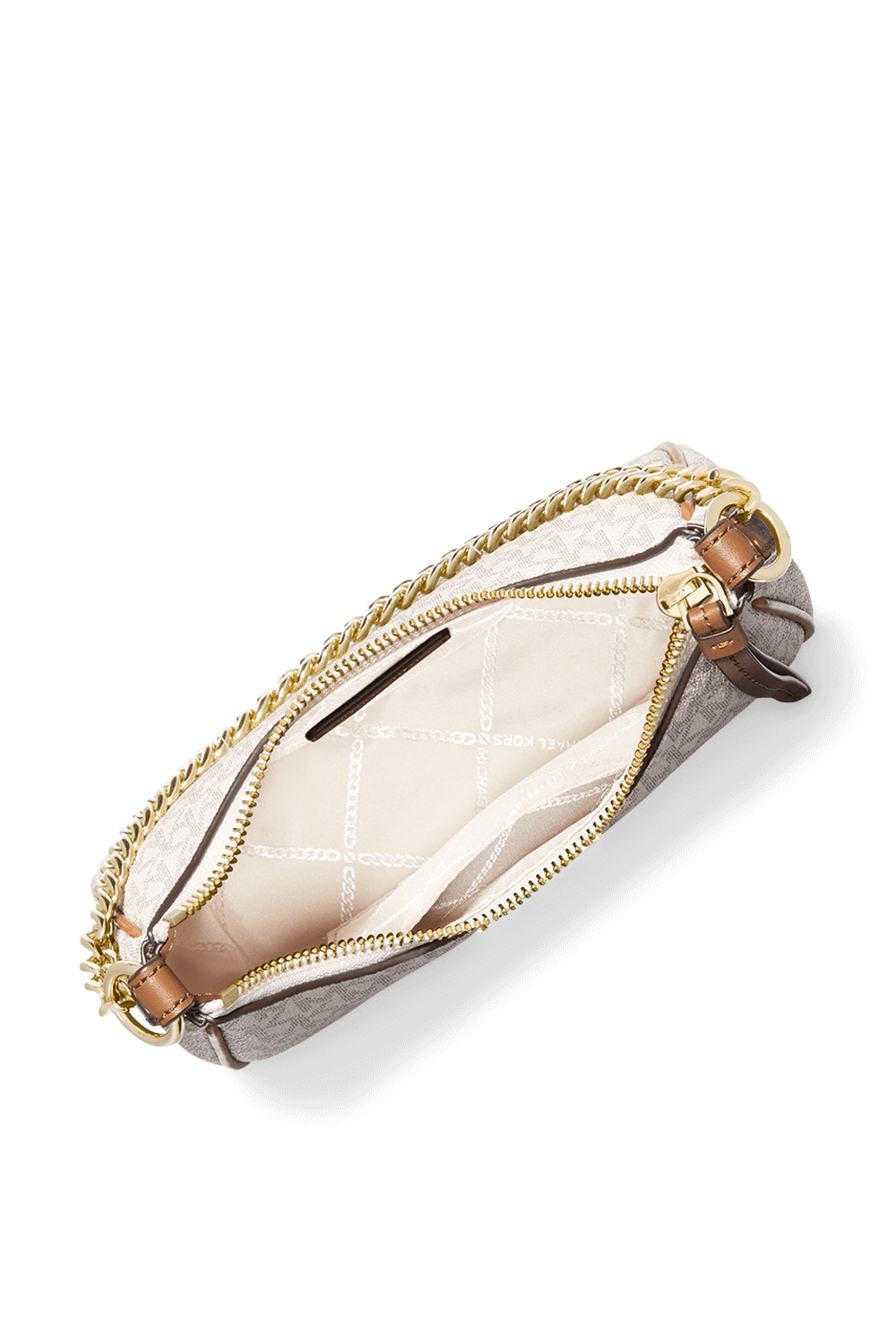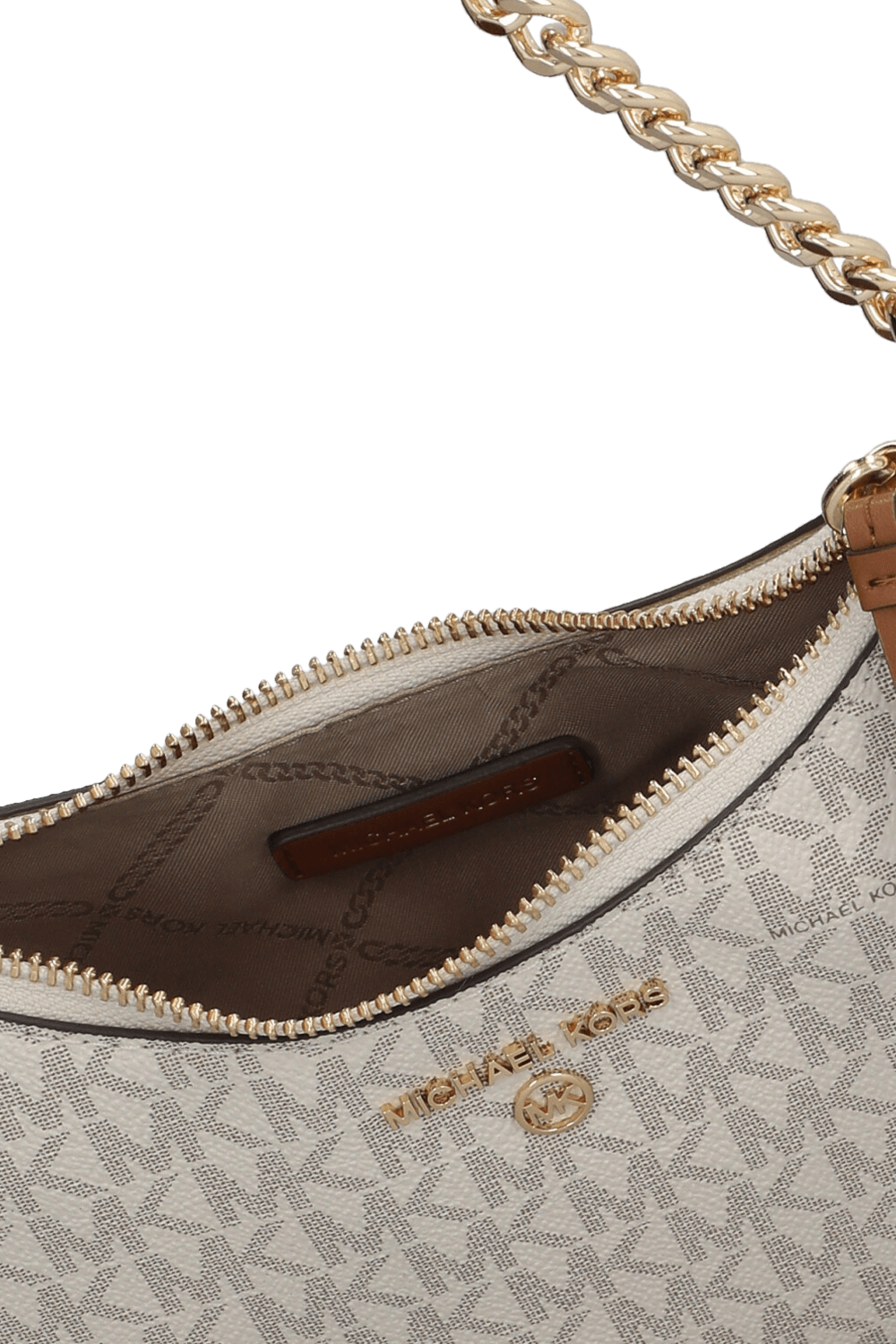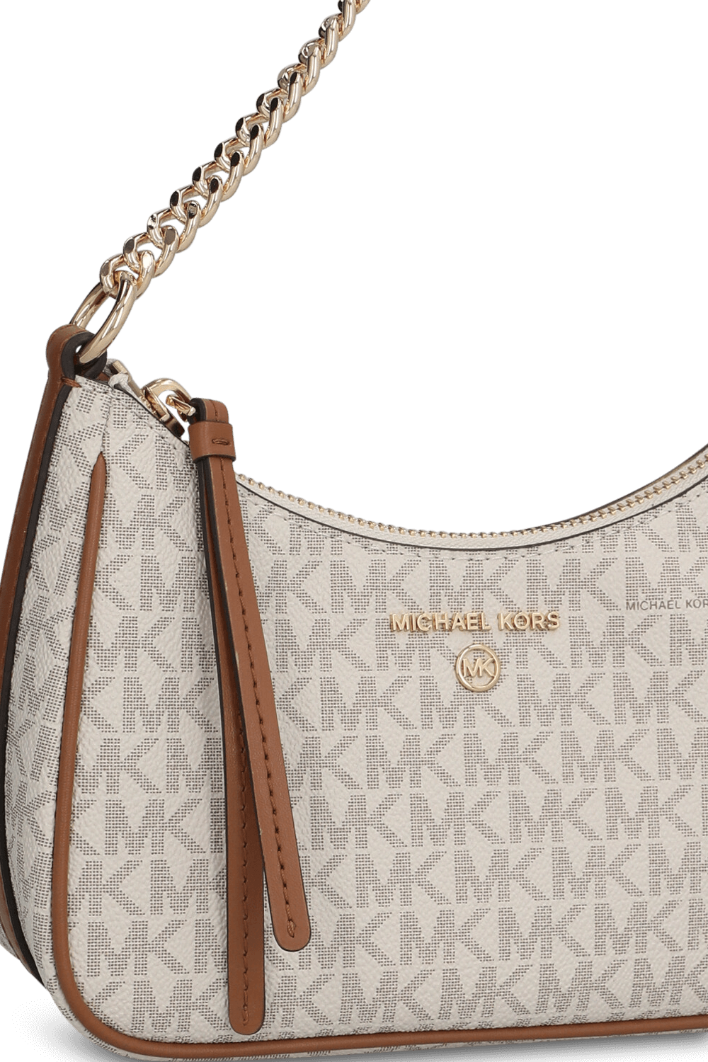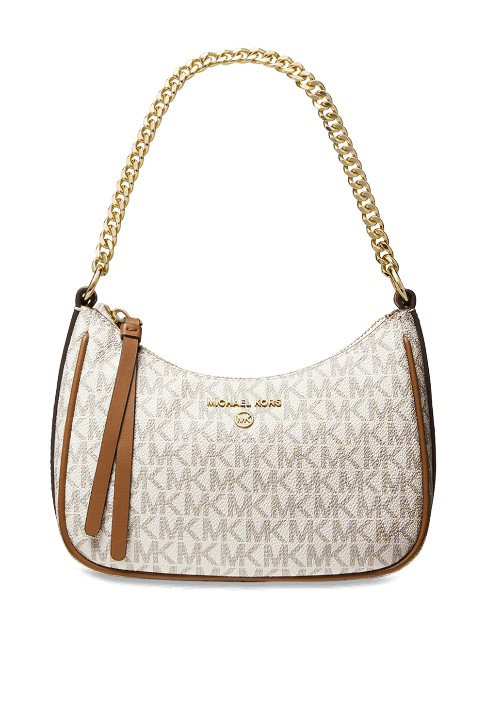 תיק ג'ט סט בגודל סמול מבית Michael Kors, עשוי קנבס בצבע לבן ובדוגמת מונוגרמת MK האהובה, עם גימורים מעור. לתיק ביטנת סאטן ושלושה חריצים לכרטיסים, יש לו שרשרת נשיאה זהובה והוא נסגר ברוכסן.