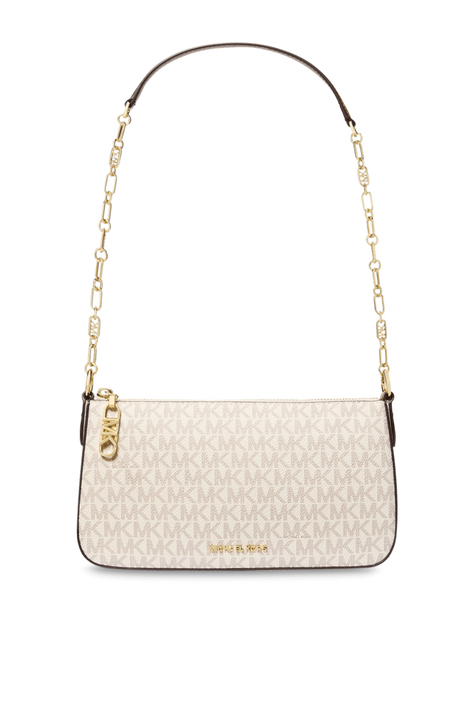 תיק כתף Jet Set בגודל סמול - מהדגמים הנמכרים ביותר שעיצב Michael Kors, עשוי קנבס בגימור עור טבעוני ובצבע לבן בשילוב דוגמת MK. לתיק תא מרכזי עם כיס פנימי קטן כשהוא נסגר על ידי רוכסן, בשילוב שרשרת נשיאה זהובה.