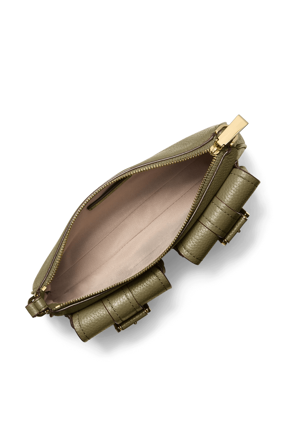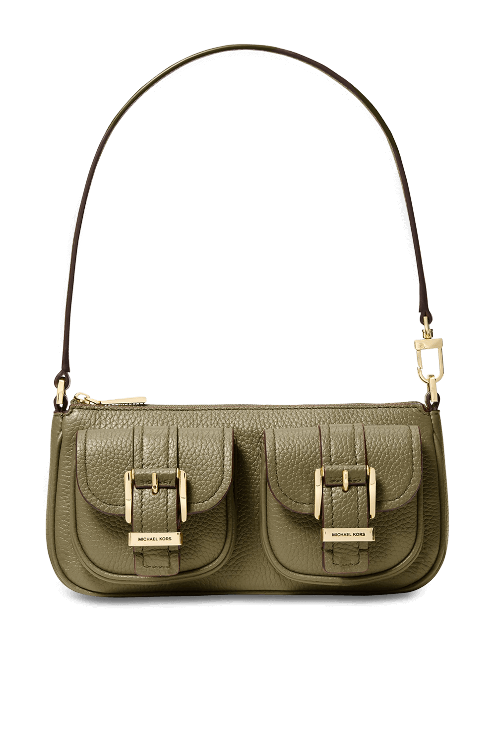תיק כתף Zoe בגודל סמול בעיצוב Michael Kors, עשוי עור מגורען בצבע ירוק. יש לו תא מרכזי בסגירת רוכסן עם בטנת בד, ושני תאים חיצוניים הנסגרים במגנט מעוצב כאבזם. יש לו רצועת נשיאה לכתף שניתן להפוך לידית אחיזה לפרק כף היד - ולשאת את התיק כקאלץ'.