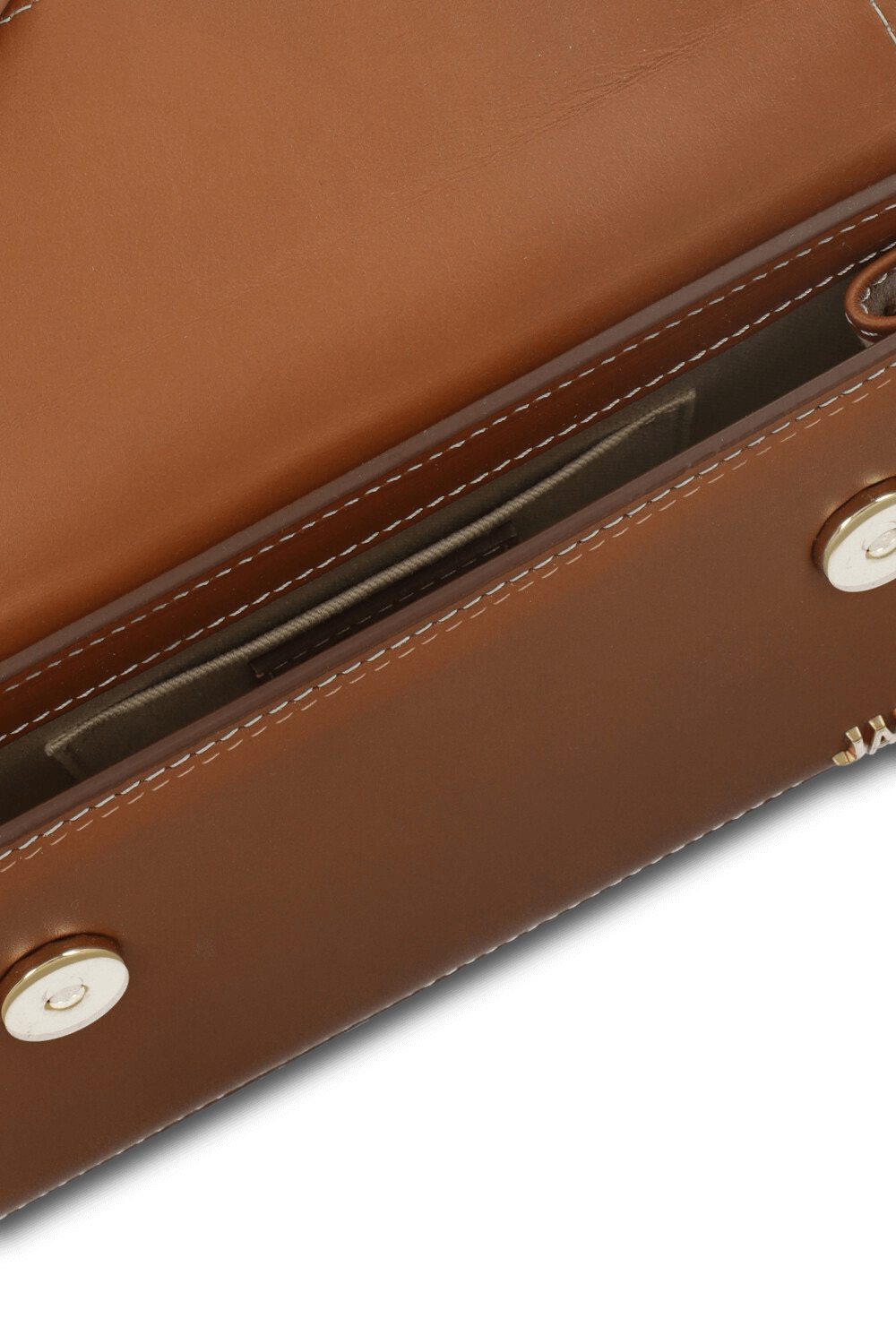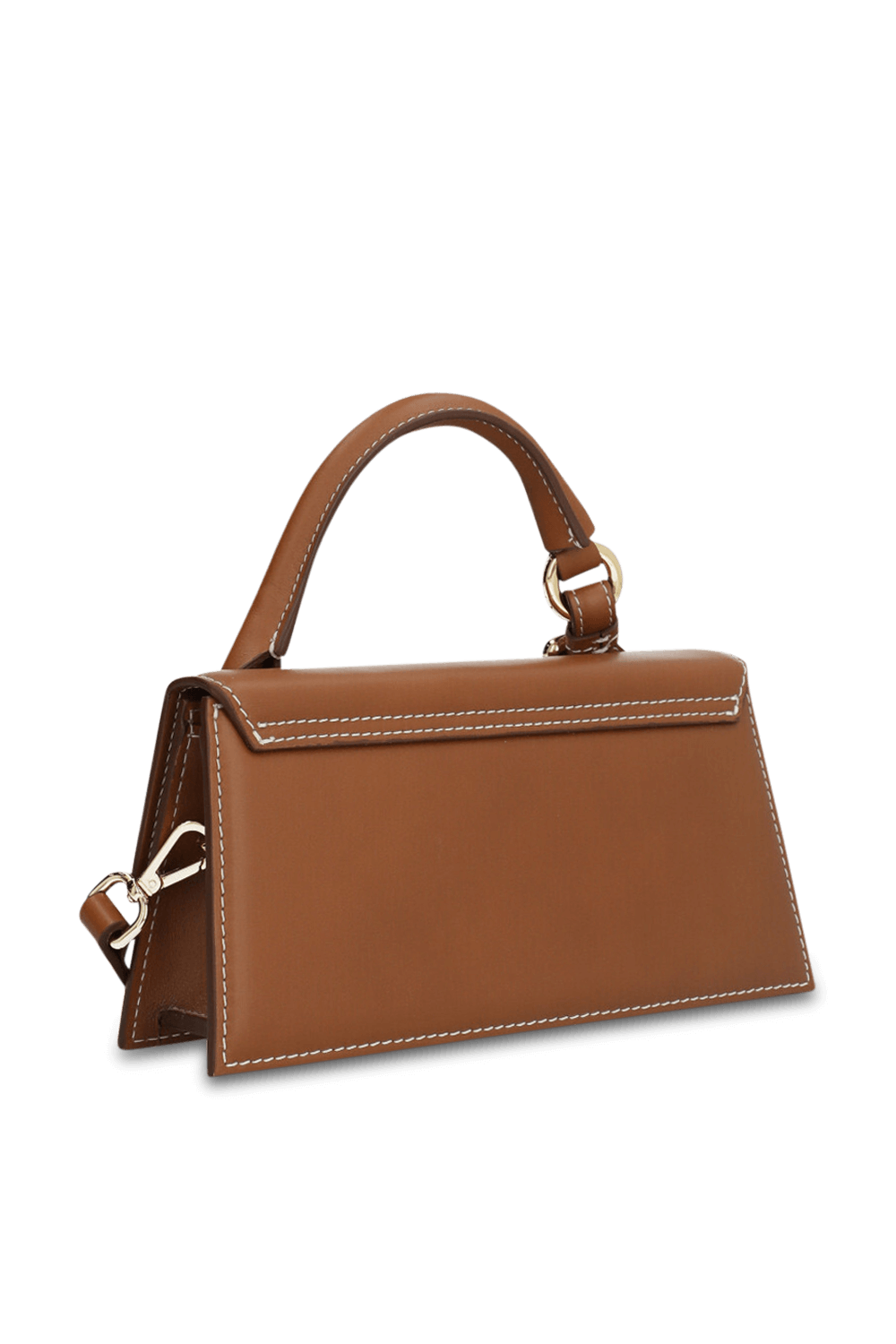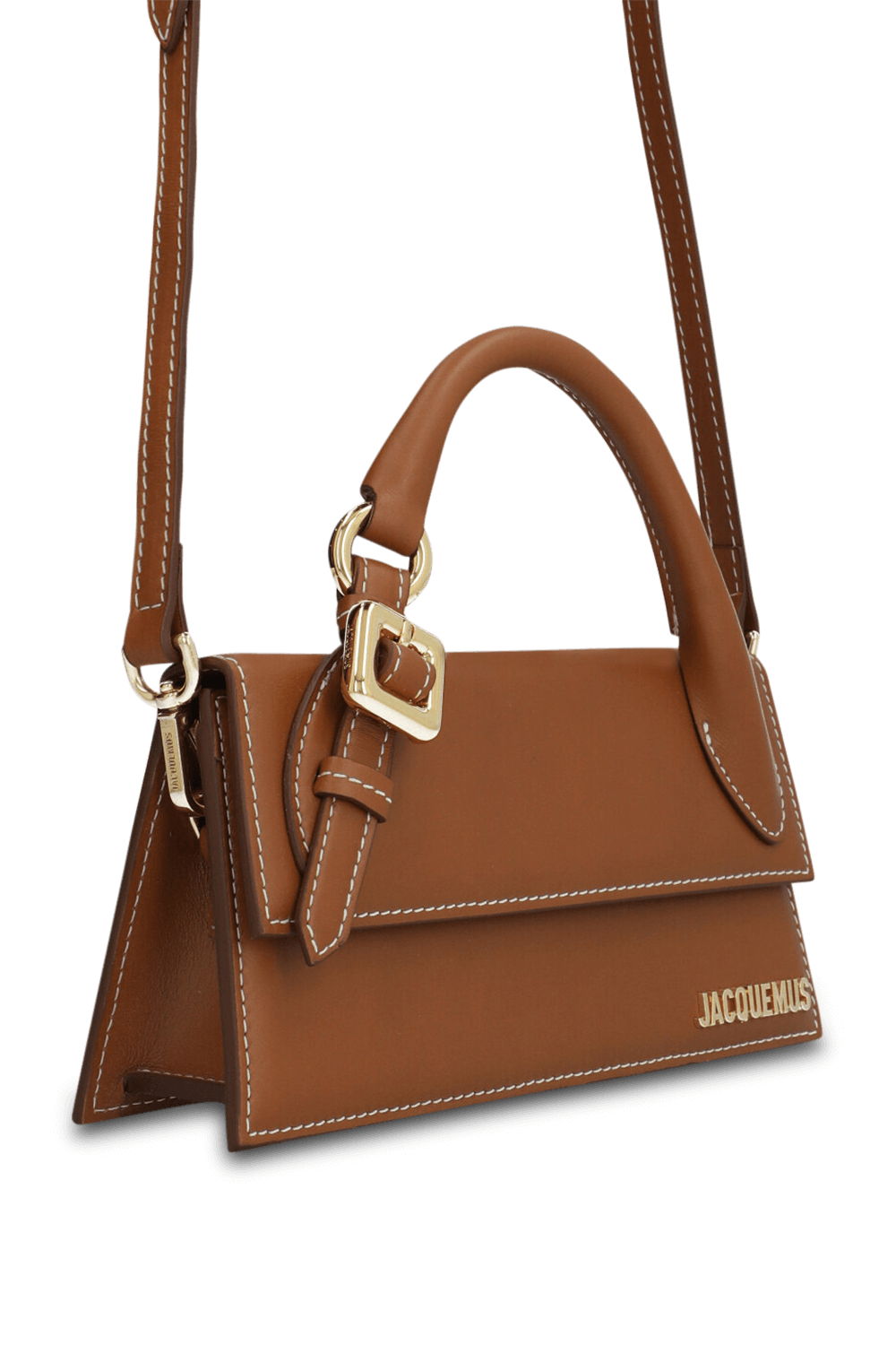 תיק כתף דגם Chiquito מבית Jacquemus, עשוי מעור בצבע חום עם לוגו מטאלי ומוזהב בחזית. התיק מגיע עם ידית אחיזה עגולה המאפשרת לשאתו כתיק יד ורצועת קרוס הניתנת להסרה.
