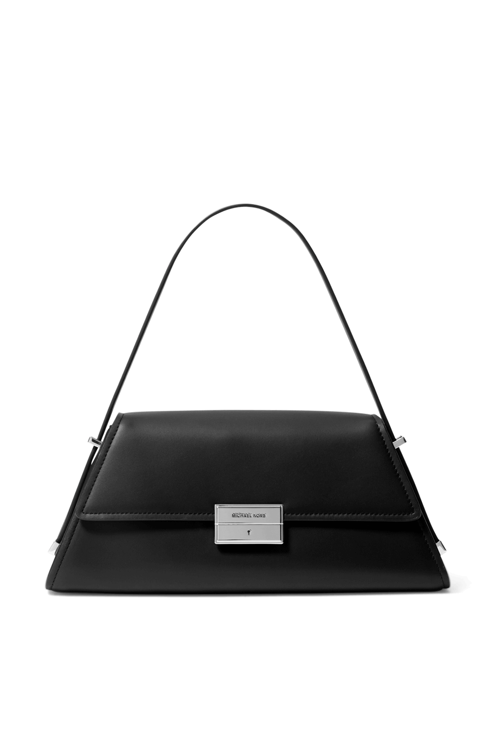 תיק כתף Ludlow בגודל מדיום מבית Michael Kors, עשוי עור בצבע שחור ובעיצוב טרפזי עם תא מרכזי בסגירת כפתור כסוף במראה מנעול.