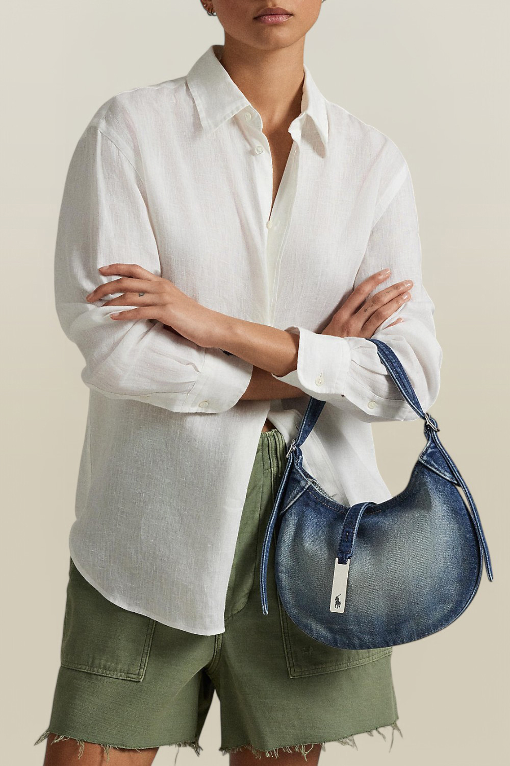 תיק כתף Polo ID בגודל סמול מבית Polo Ralph Lauren, המעוצב בצורת אוכף ובהשראת חיים הרפתקנים, רומנטיים ואופטימיים. הוא עשוי כותנת דנים בצבע כחול ויש לו שני תאי איחסון. התיק מגיע עם שתי רצועות - כתף וקרוסבודי. הוא נסגר במגנט וברצועת דנים המשלבת לוגו מטאלי של המותג.