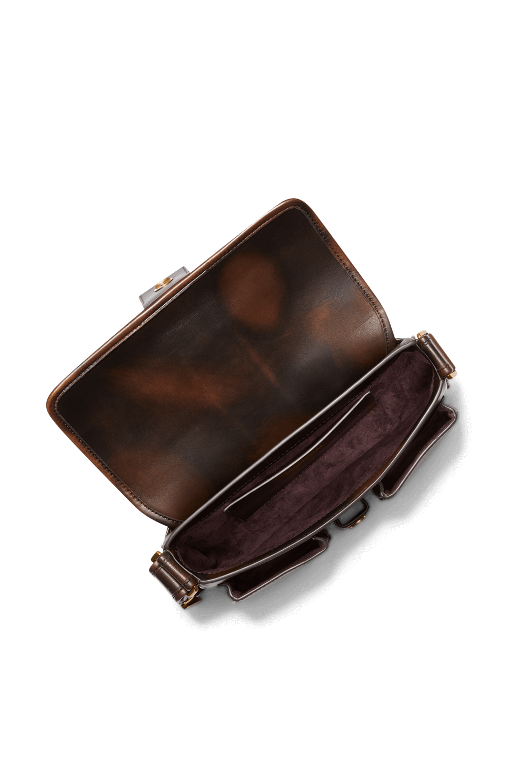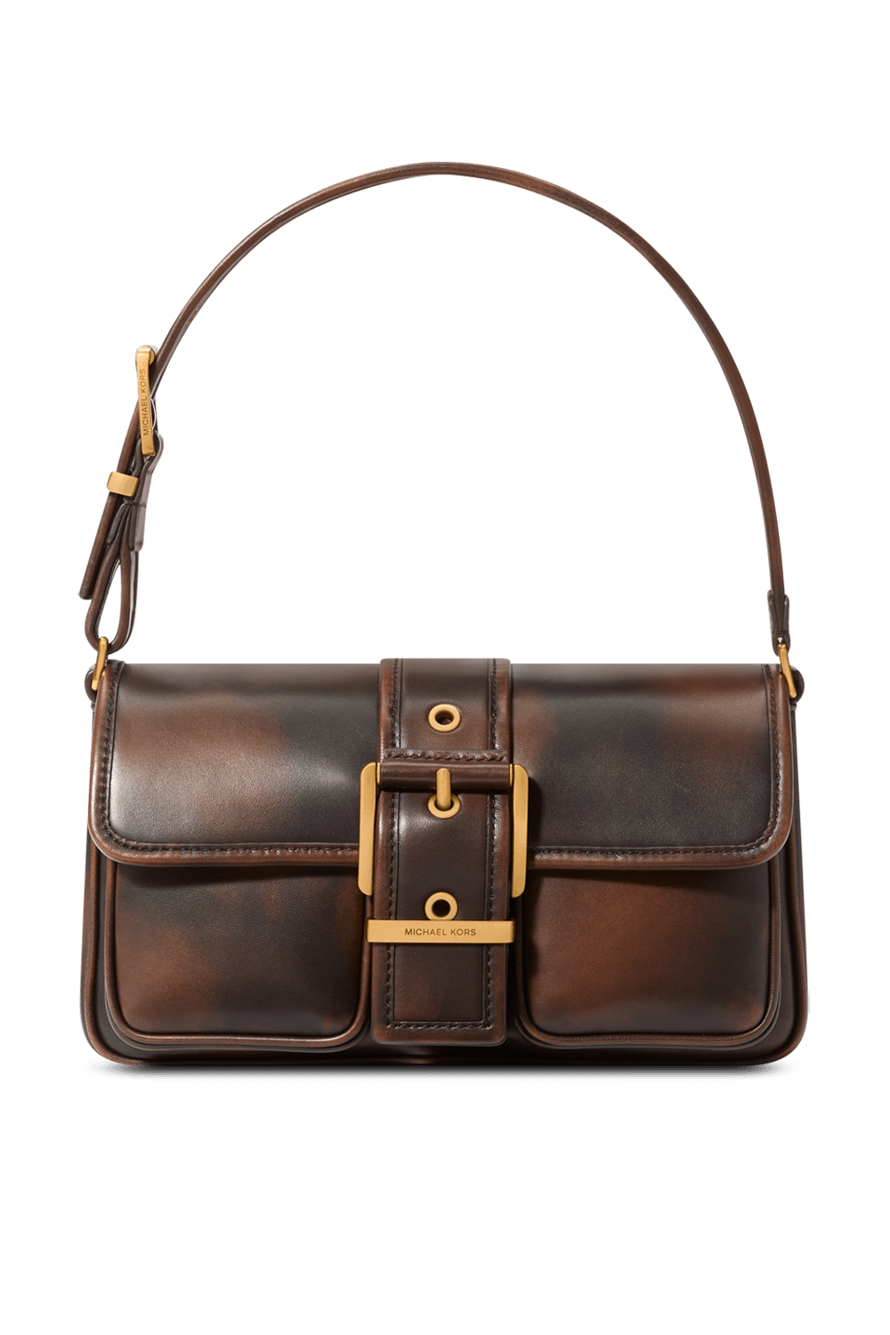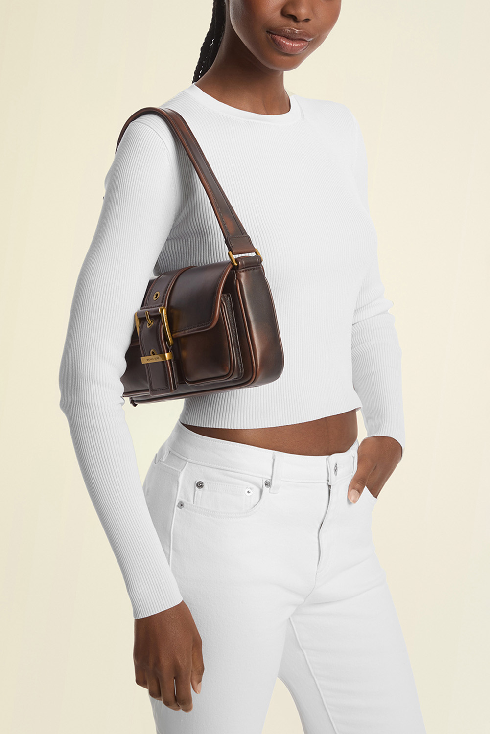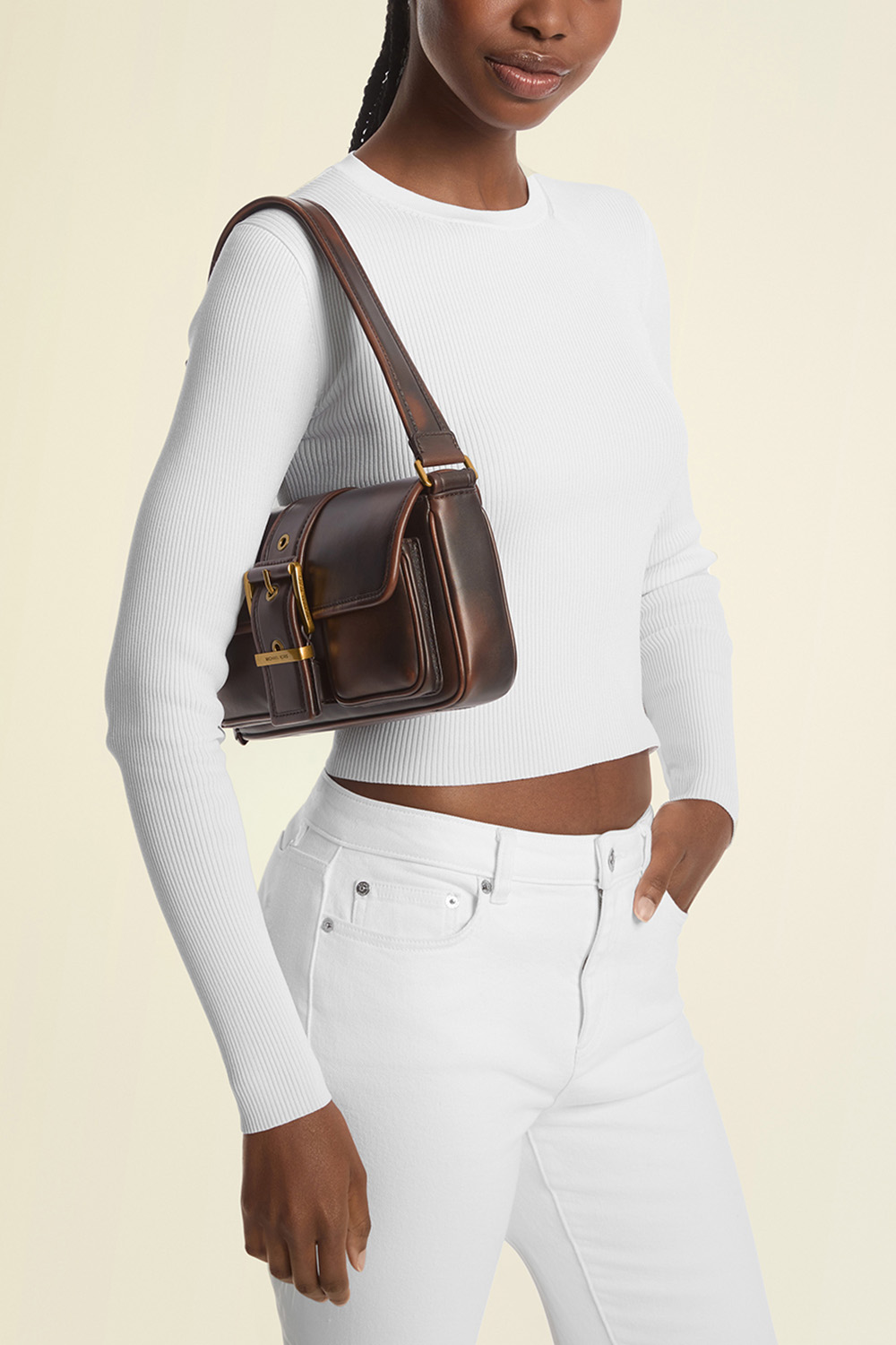 תיק כתף Colby בגודל מדיום מבית Michael Kors, עשוי עור בצבע חום שוקולדי ובמראה וינטג'. התא המרכזי נסגר באבזם מטאלי זהוב, ויש בו כיס פנימי קטן, בשילוב רצועת נשיאה מתכווננת.