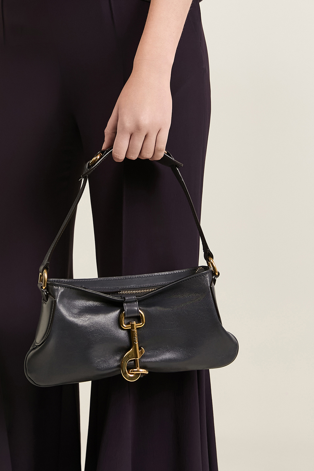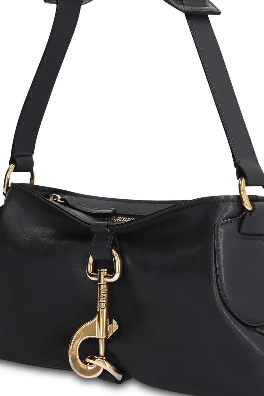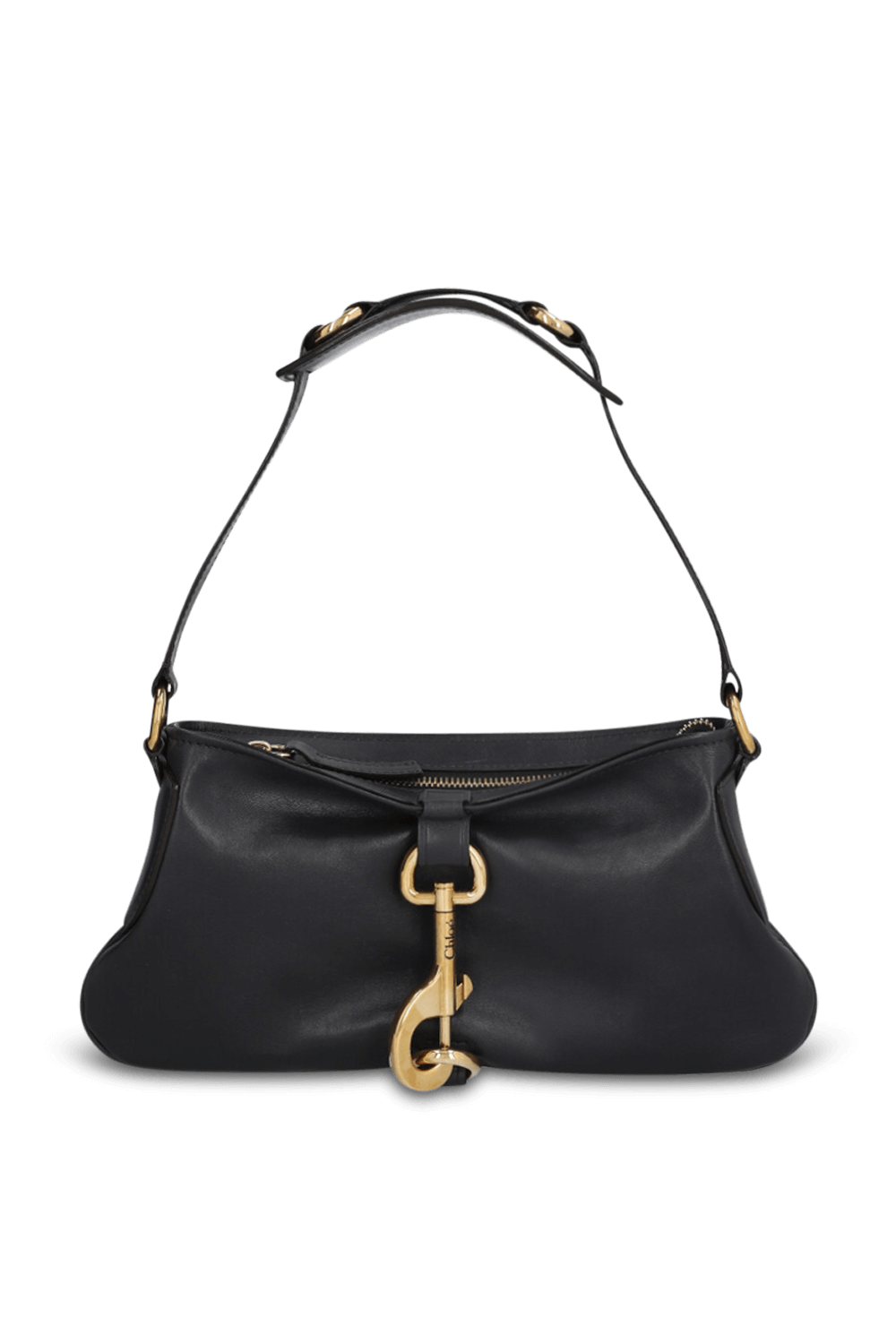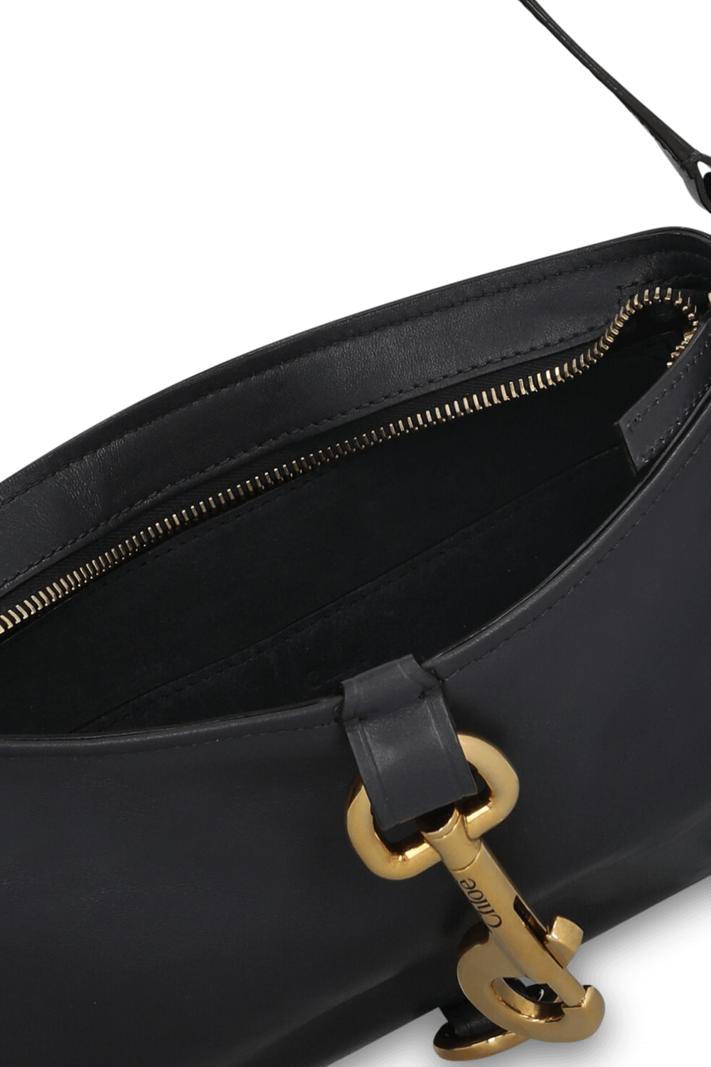 תיק כתף Kerala 25 מבית Chloe בעיצוב רטרו. הוא עשוי עור בצבע שחור בשילוב סוגר מטאלי בעיצוב אוברסייז. יש לו תא איחסון עם ביטנת זמש וכיס פנימי והוא נסגר ברוכסן.