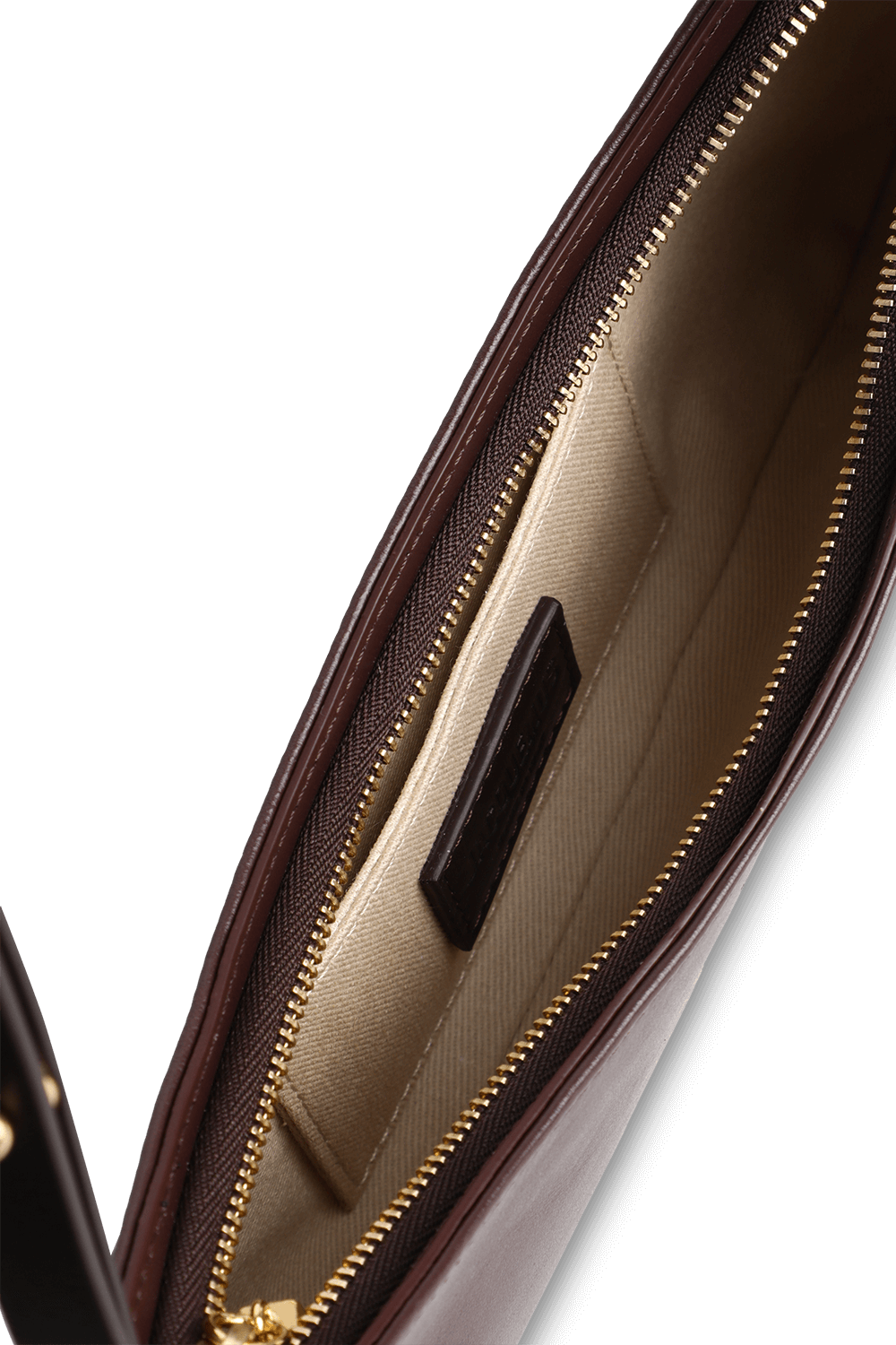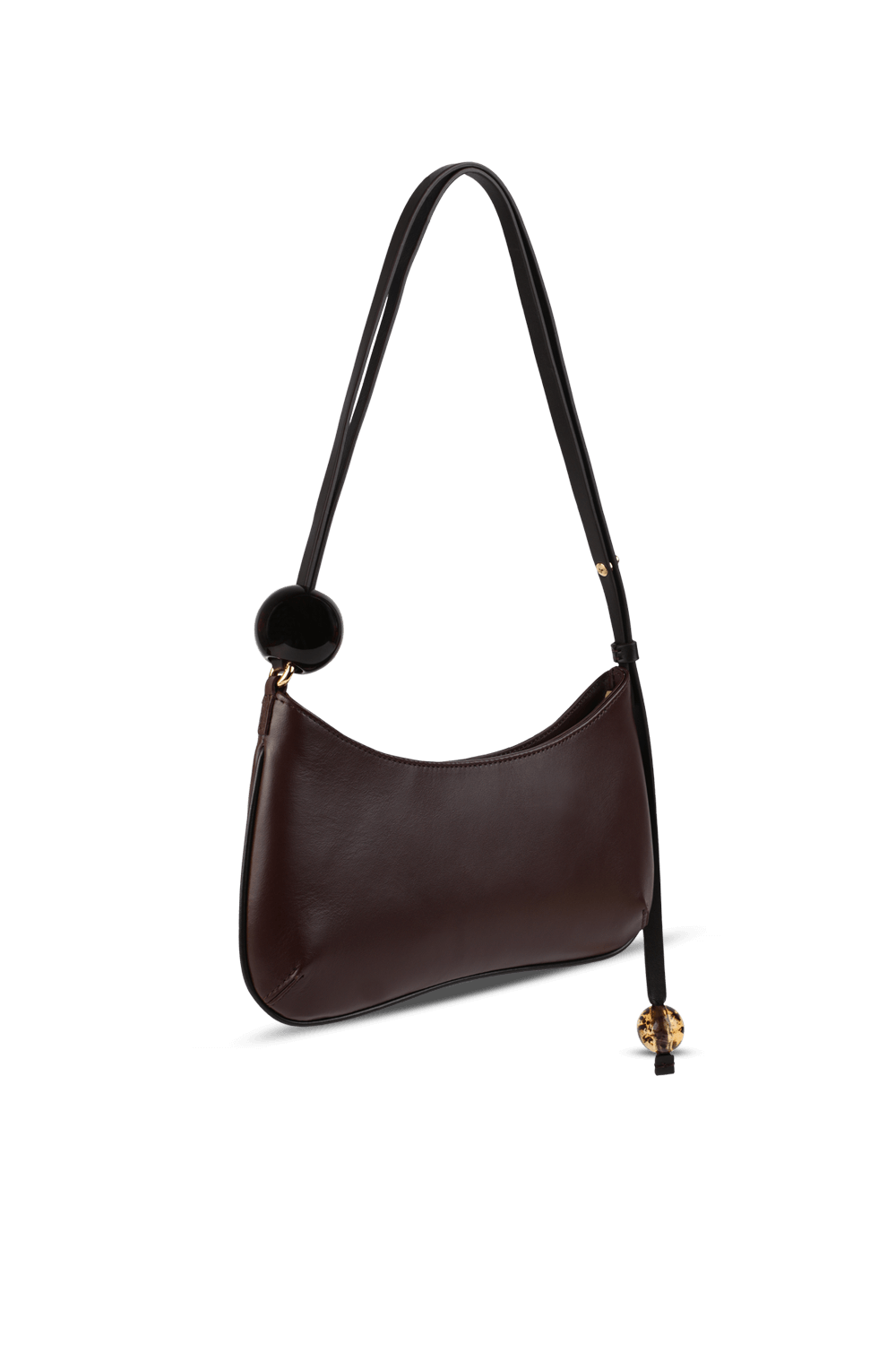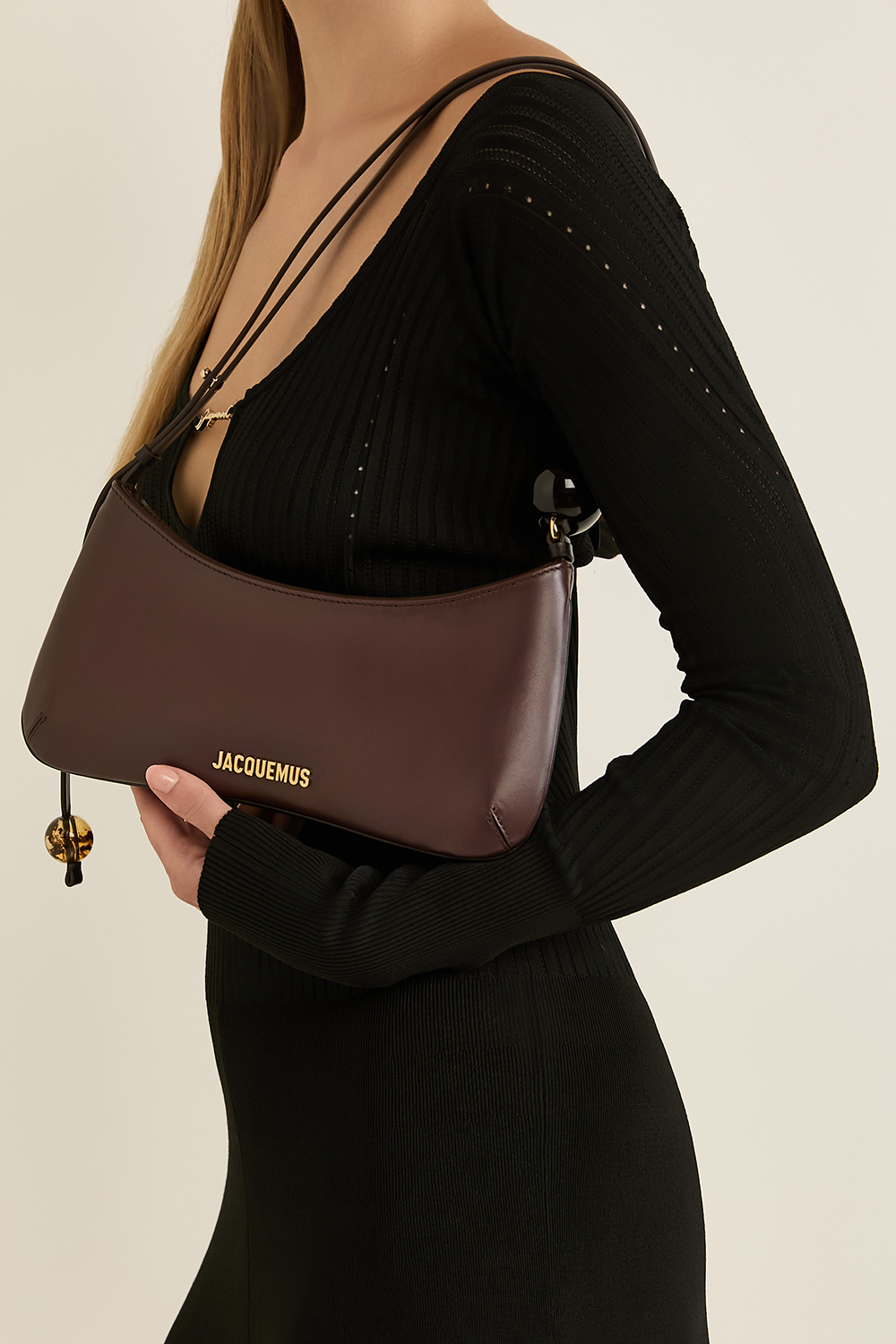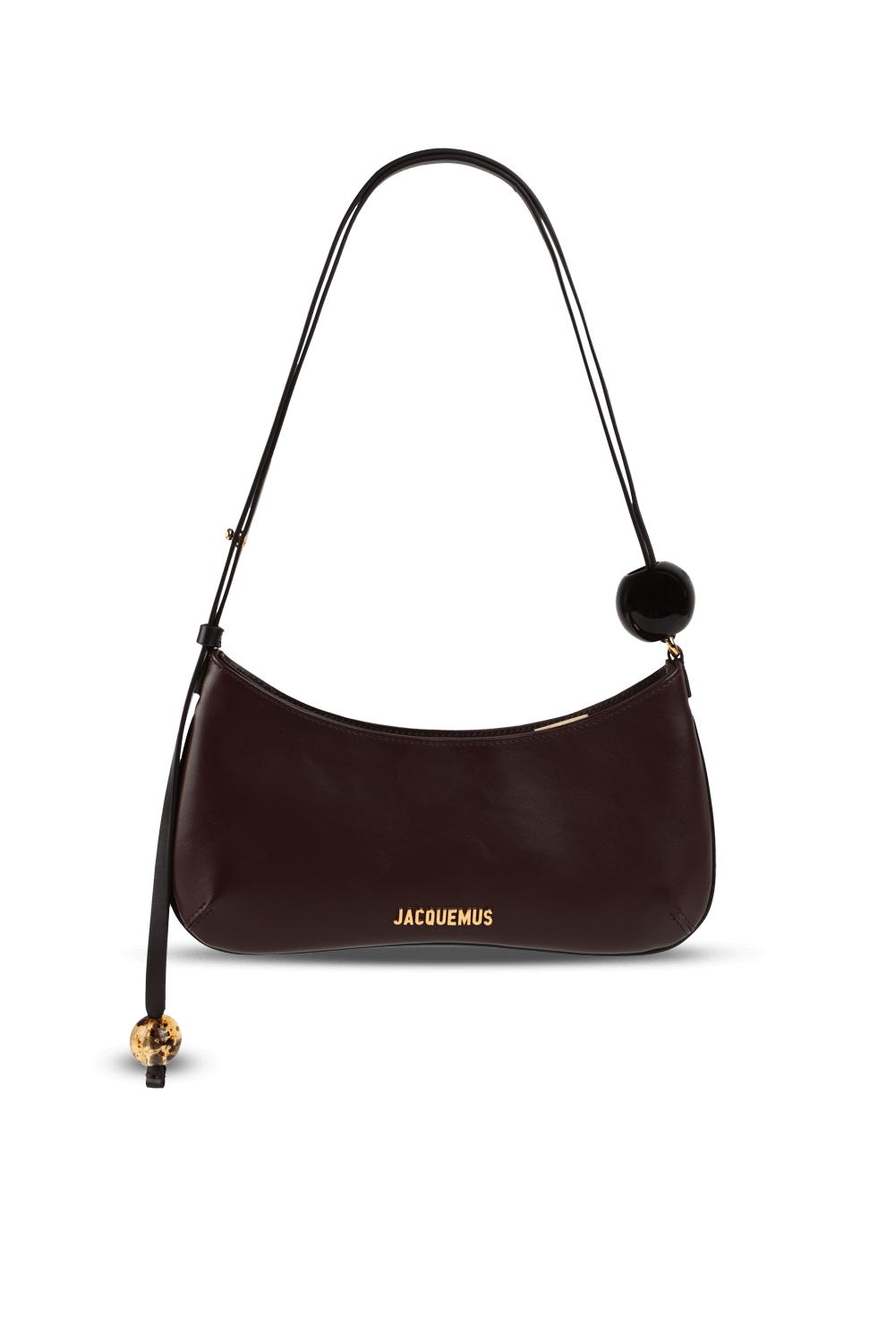 הדגם הידוע Le Bisou מבית Jacquemus הרותח בצבע חום עם חרוזים. תיק צד זה עשוי מ-100% עור ובטנה מכותנה איכותית. לפריט צורה מוארכת עם סגירה חזיתית לצד לוגו מטאלי מוזהב בחזית ורצועת אחיזה מעור עם שני חרוזים למראה עכשווי ושיקי.
