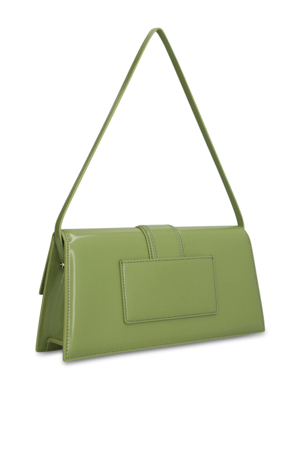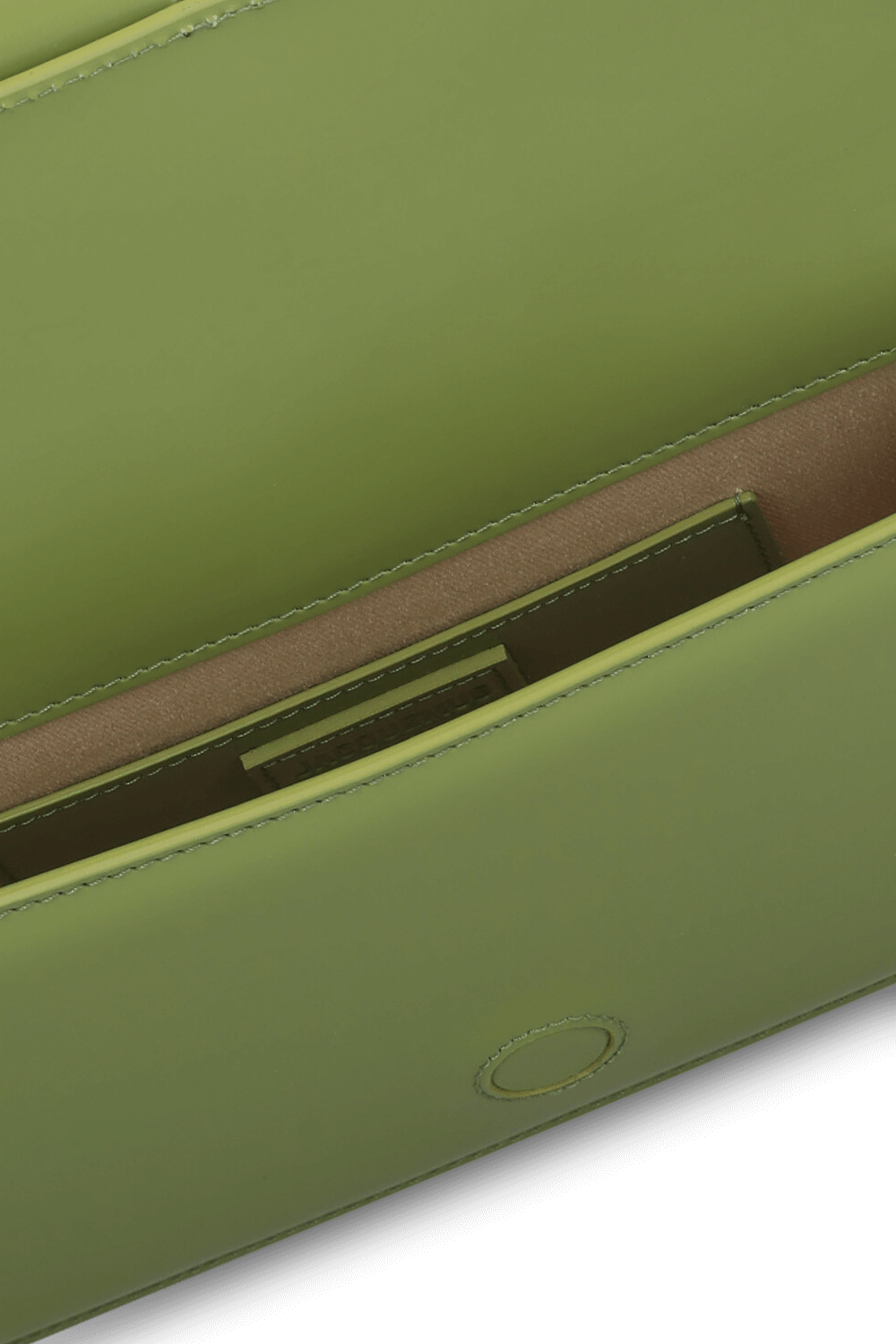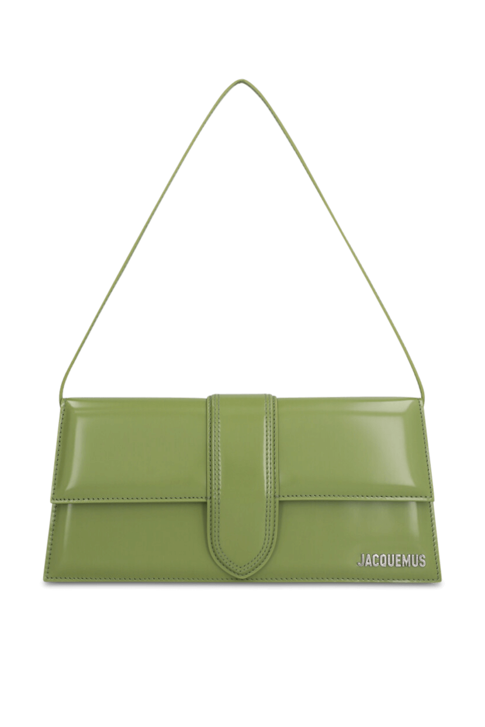 תיק כתף דגם Le Bambino Long מבית Jacquemus, תוצרת איטליה. התיק צד העשוי מ-100% עור מבריק בצבע ירוק עם בטנה מכותנה וכיס פנימי לכרטיס. הוא נסגר במגנט ויש לו רצועת כתף מתכווננת.