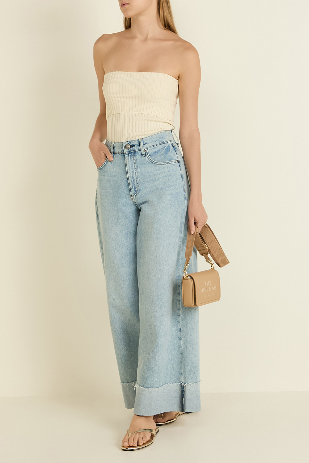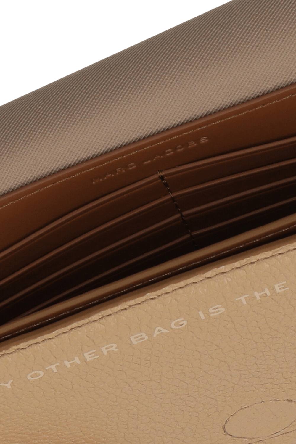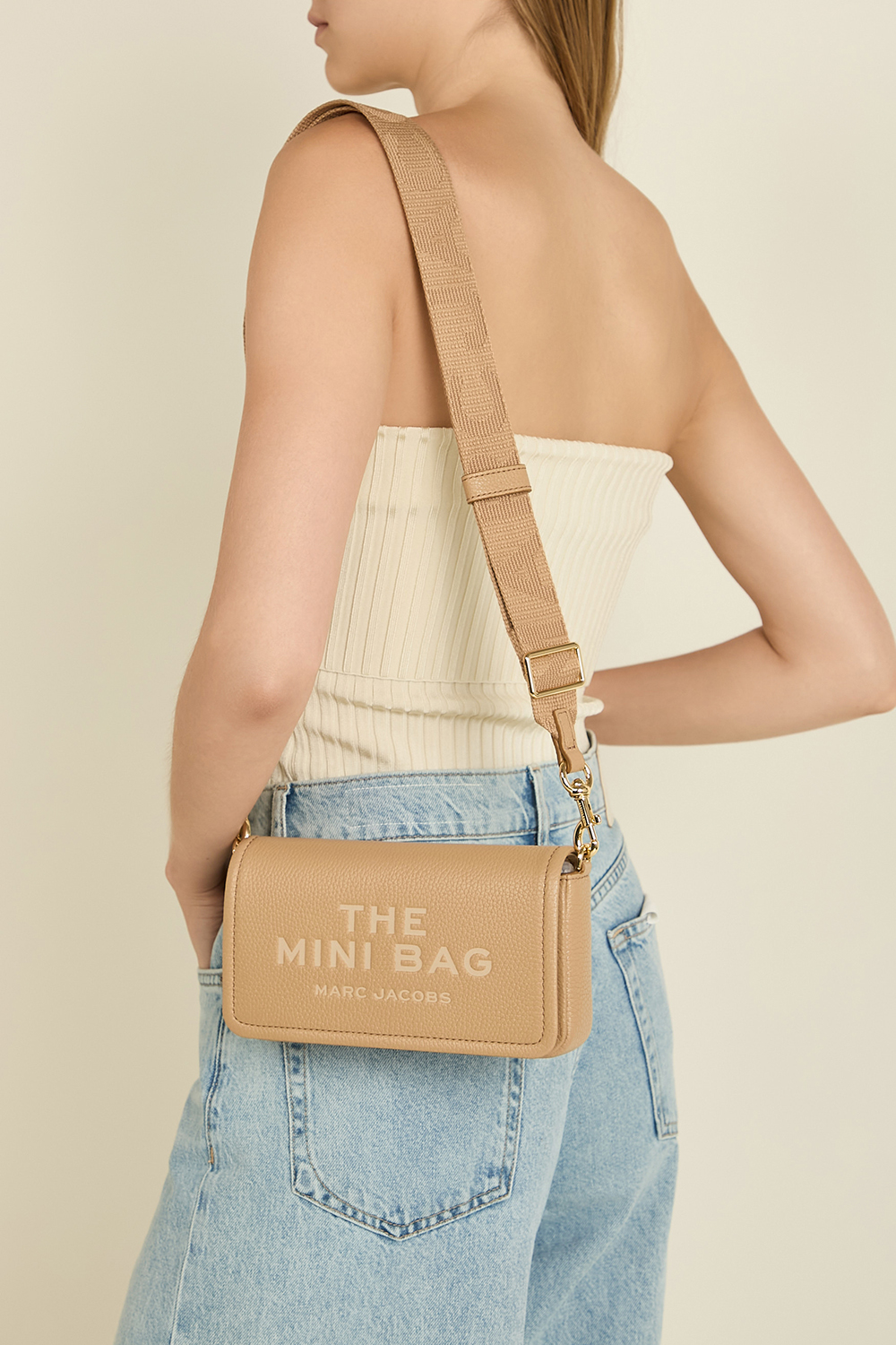 תיק The Mini Bag מבית Marc Jacobs המעוצב בהשראת ה-Tote Bag האייקוני של המותג. הוא עשוי עור מגורען בצבע בז' ויש לו תא מרכזי עם שמונה חריצים לכרטיסים. לתיק רצועת נשיאה מתכווננת ונשלפת ואפשר להפוך אותו גם לתיק קלאץ'. בחלקו הפנימי מוטבע הכיתוב My Other Bag is the Tote Bag והוא נסגר במגנט.
