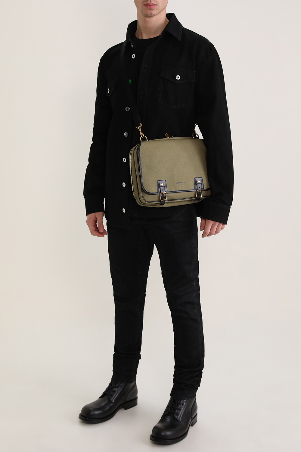 תיק מדגם MESSENGER מבית האופנה הצרפתי Saint Lauren. התיק בגודל מדיום העשוי מכותנת קנבס איכותית בגוון ירוק ובגימור עור משובח וחלק בגוון שחור. לפריט צללית מלבנית מתקפלת עם רצועת קרוס ארוכה ומתכווננת כך שתוכל לשאת אותו על הכתף או בקרוס, בעוד שחללוקתו כוללת תא מרכזי עם כיס מרוכסן פנימי וכיס נוסף אחורי. לוגו המותג ודיטיילס מוזהבים משלימים את סגנונו.