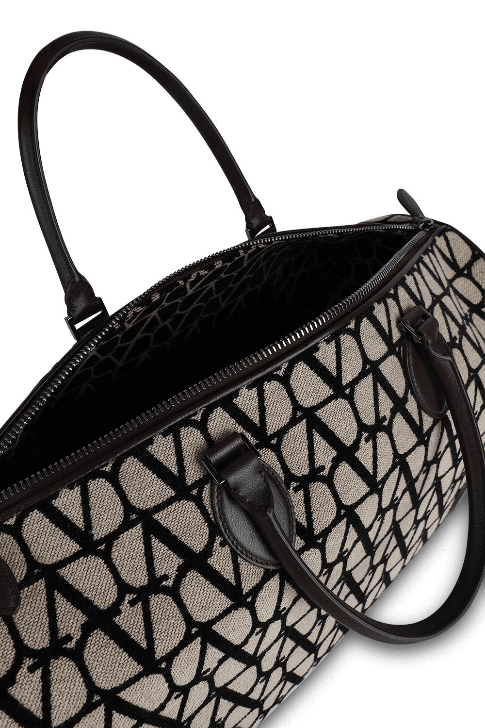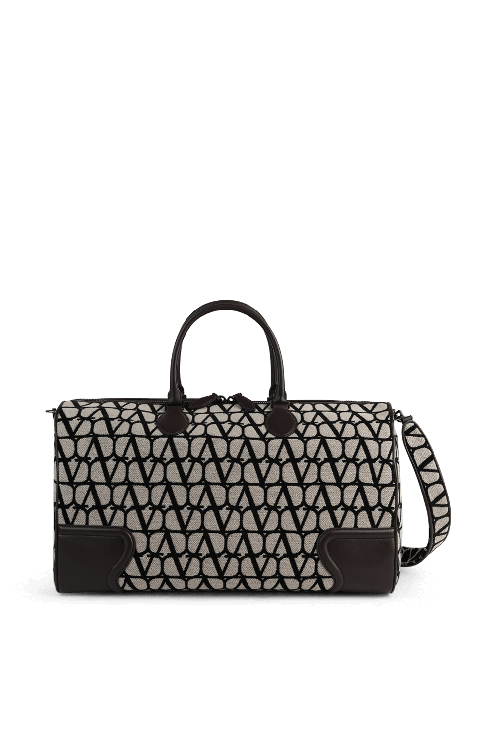 תיק נסיעות מבית Valentino, עשוי בד קאנבס קטיפתי בצבע בז` עם הדפס לוגו חזרתי שחור. לתיק תא אחסון מרכזי עם שלושה תאים פנימיים - אחד מהם בסגירת רוכסן. הוא מגיע עם זוג ידיות מעור חום ורצועת נשיאה הניתנת להסרה.
