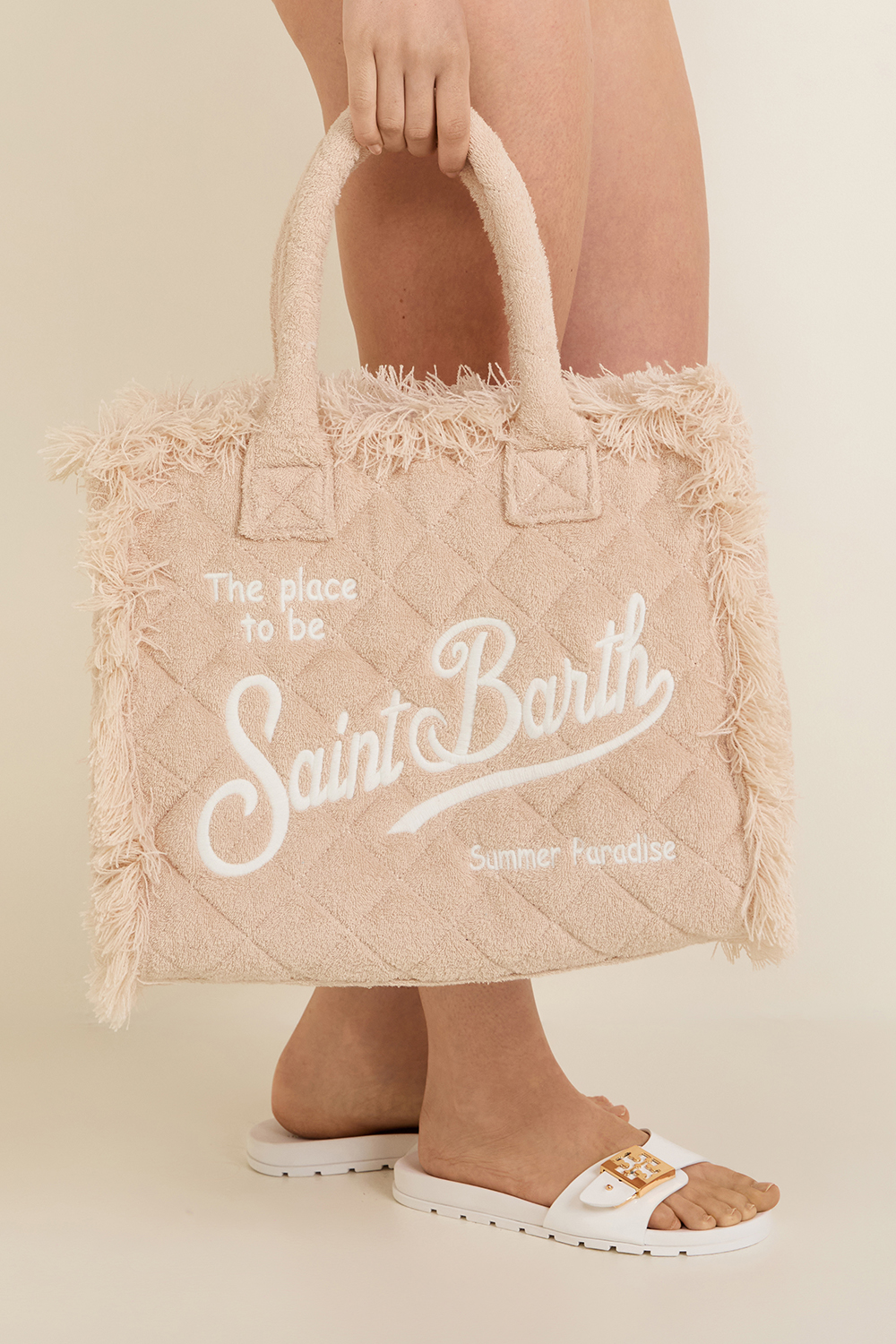 תיק נשיאה Vanity Sponge מבית MC2 Saint Bart, עשוי בד מגבת בטקסטורת מעויינים בצבע בז' עם רקמת לוגו וסיומת פרנזים. הוא כולל תא מרכזי מרווח ועמיד, עם בטנת פסים אדום-לבן, כיס פנימי רחב בסגירת רוכסן וכיס פנימי נוסף לטלפון. יש לו שתי ידיות נשיאה והוא נסגר ברוכסן - תיק מרווח בעיצוב מדוייק לחופשה המושלמת.
