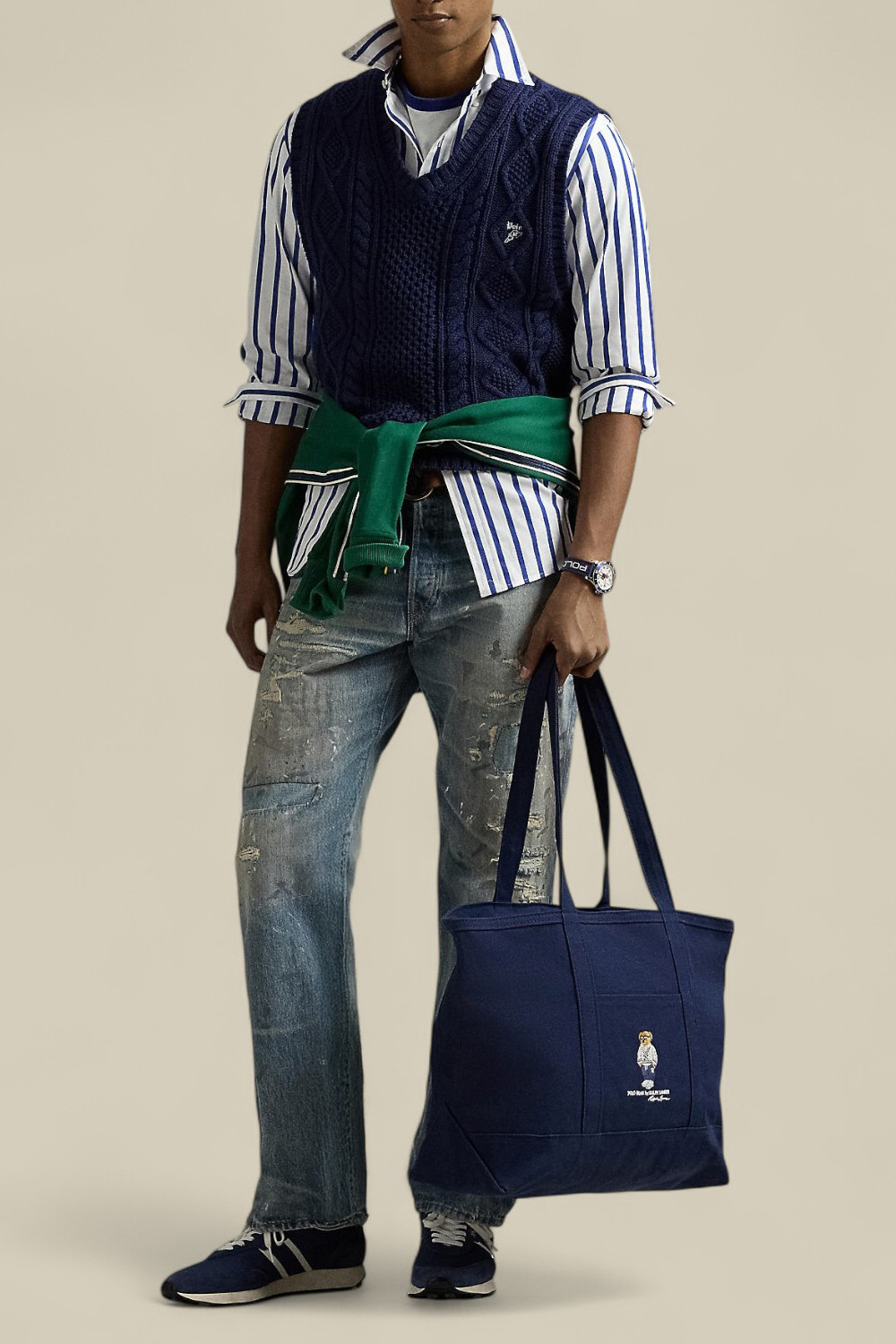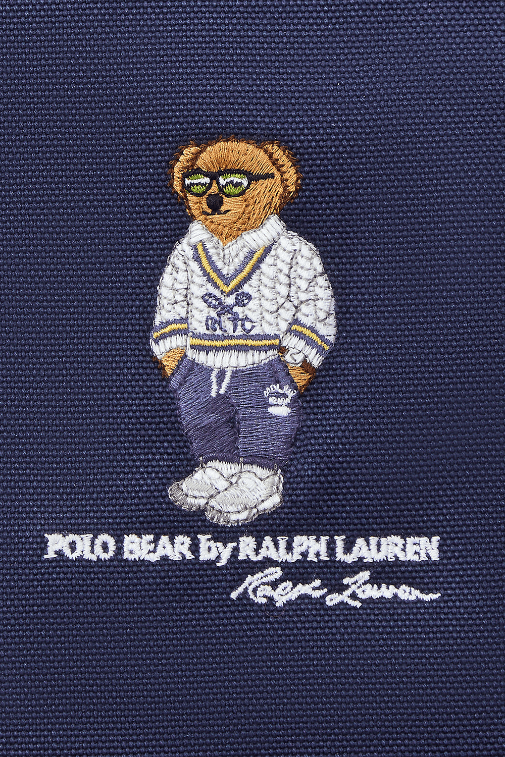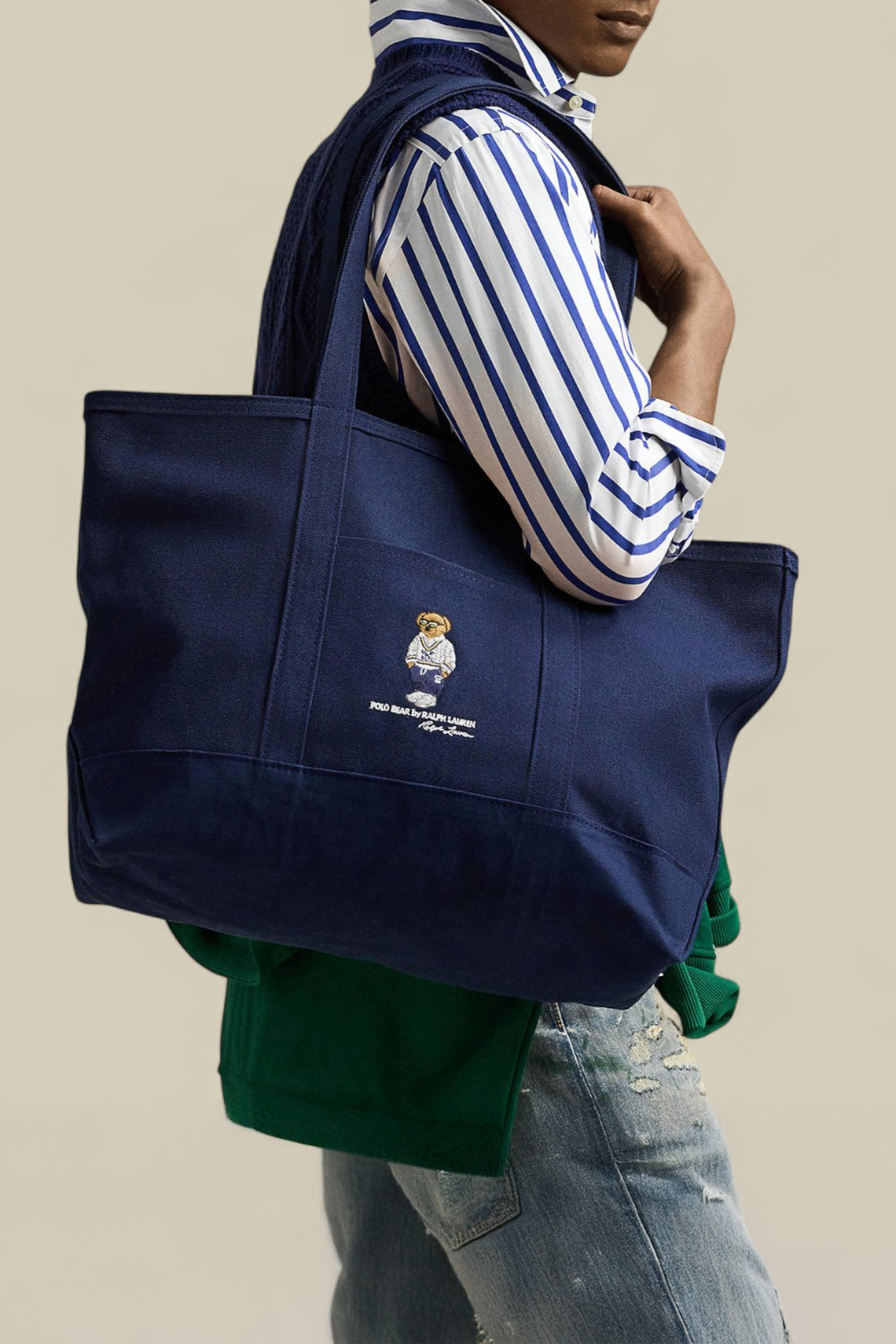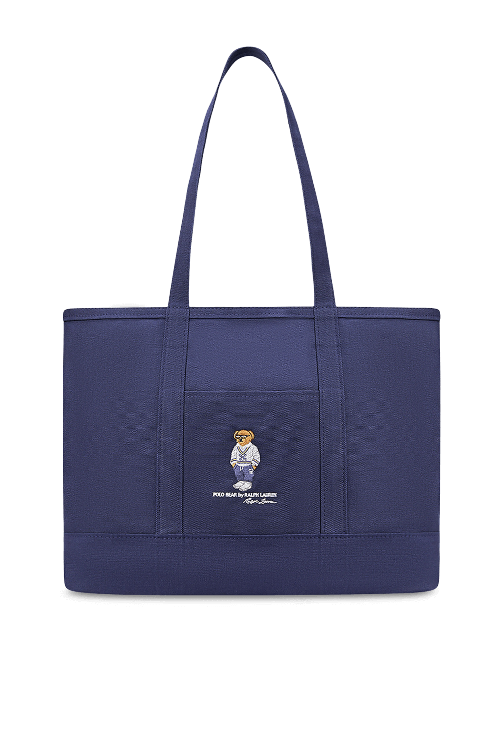 תיק נשיאה Tote בגודל לארג' מבית Polo Ralph Lauren, עשוי כותנת קנבס בצבע כחול, עם פאץ' דמות דובי הפולו האהוב במרכז. לתיק תא מרכזי עם כיס פנימי, תא חיצוני בגודל נוח לטלפון וזוג ידיות נשיאה. נסגר ברוכסן.