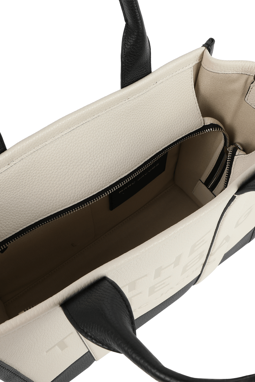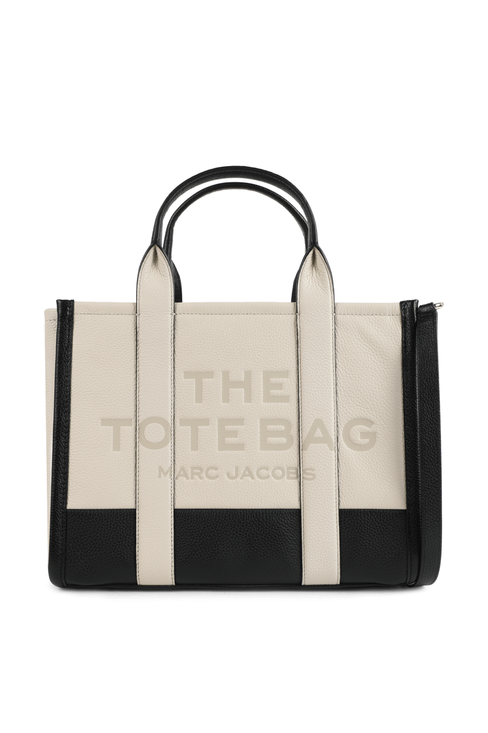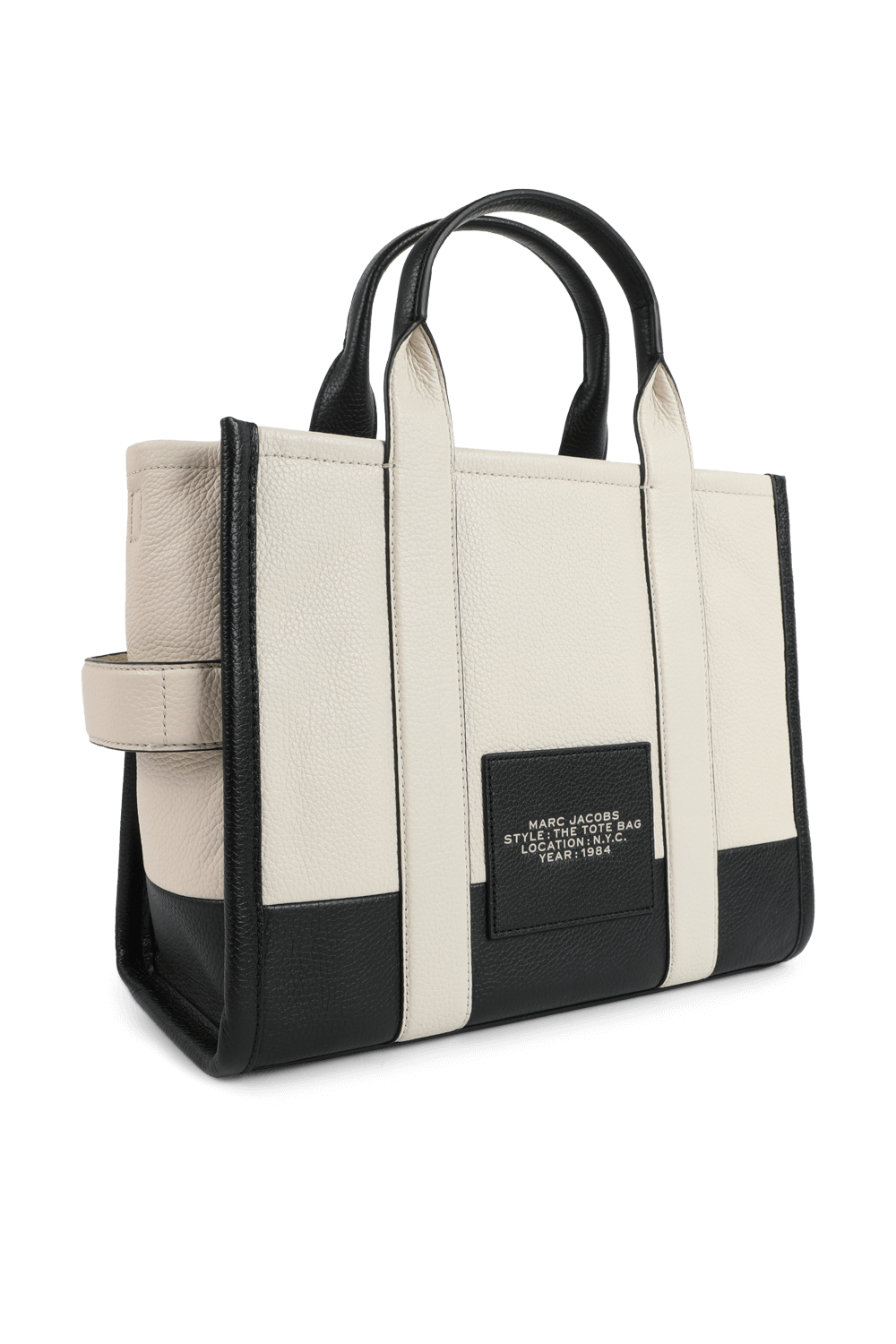 תיק נשיאה בגודל מדיום בעיצוב המותג Marc Jacobs, העשוי מעור מגורען בצבעי לבן ושחור. לתיק צללית מרובעת עם ידיות מעוגלות, רצועת נשיאה מתכווננת ונשלפת, ותא מרווח עם כיס פנימי עם רוכסן