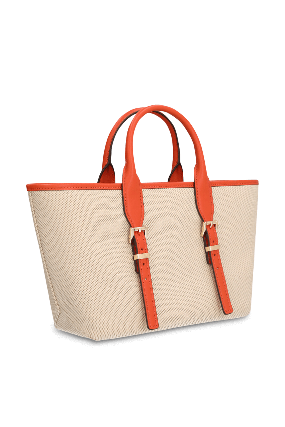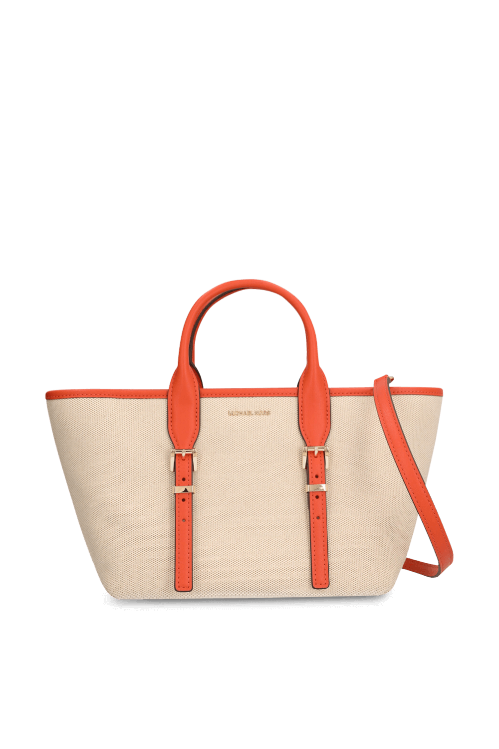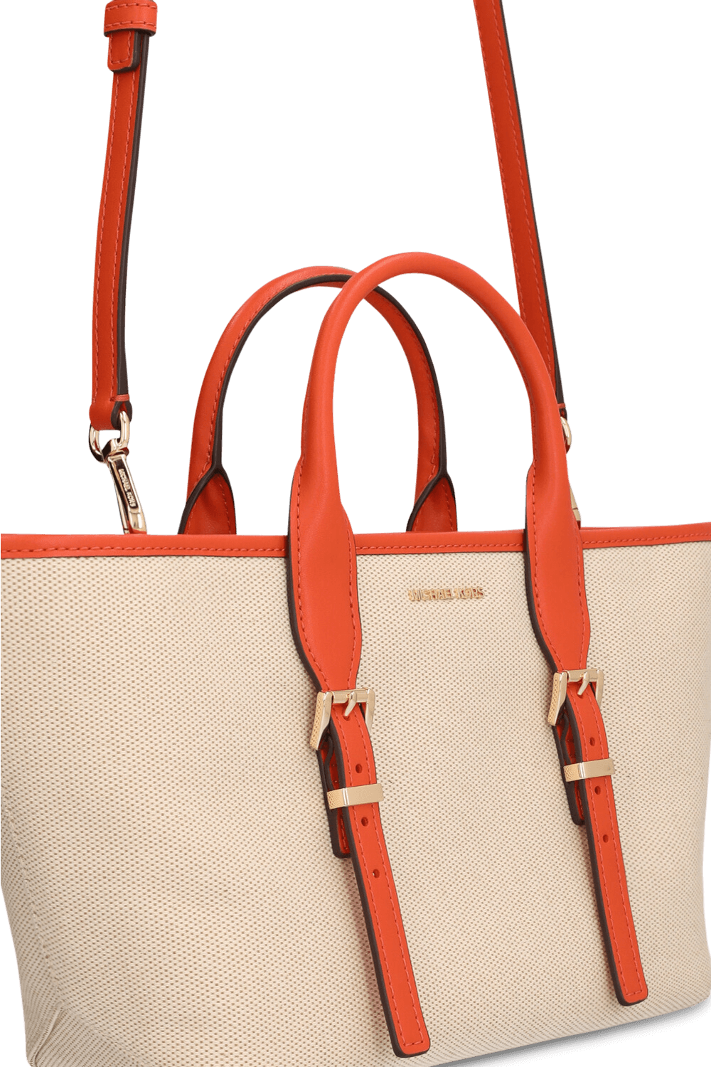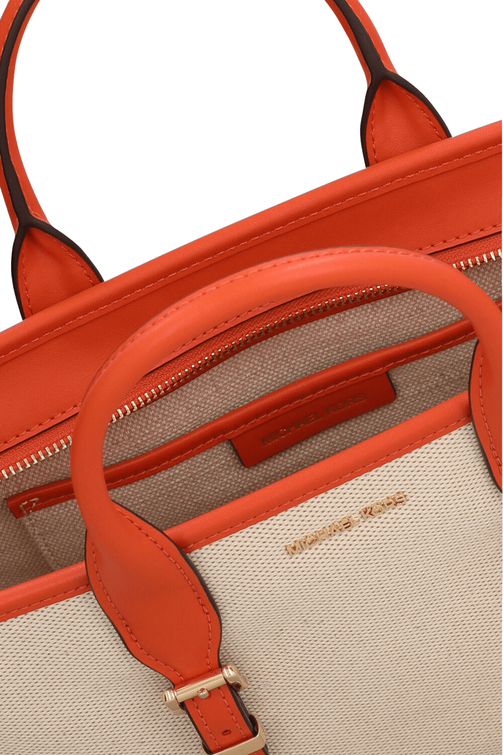תיק נשיאה Moore בגודל סמול בעיצוב Michael Kors, בצורת תיק באקט רחב. הוא עשוי קנבס בצבע טבעי עם דיטיילים בכתום. יש לו כיס פנימי והוא נסגר ברוכסן. מגיע עם זוג ידיות אחיזה ורצועת נשיאה ארוכה.