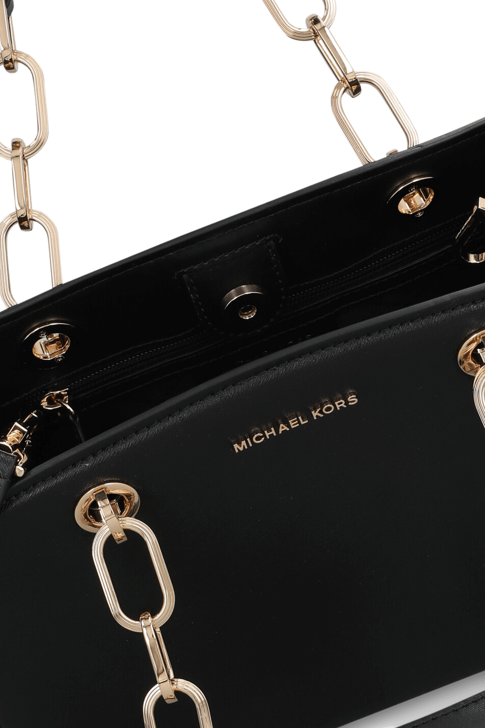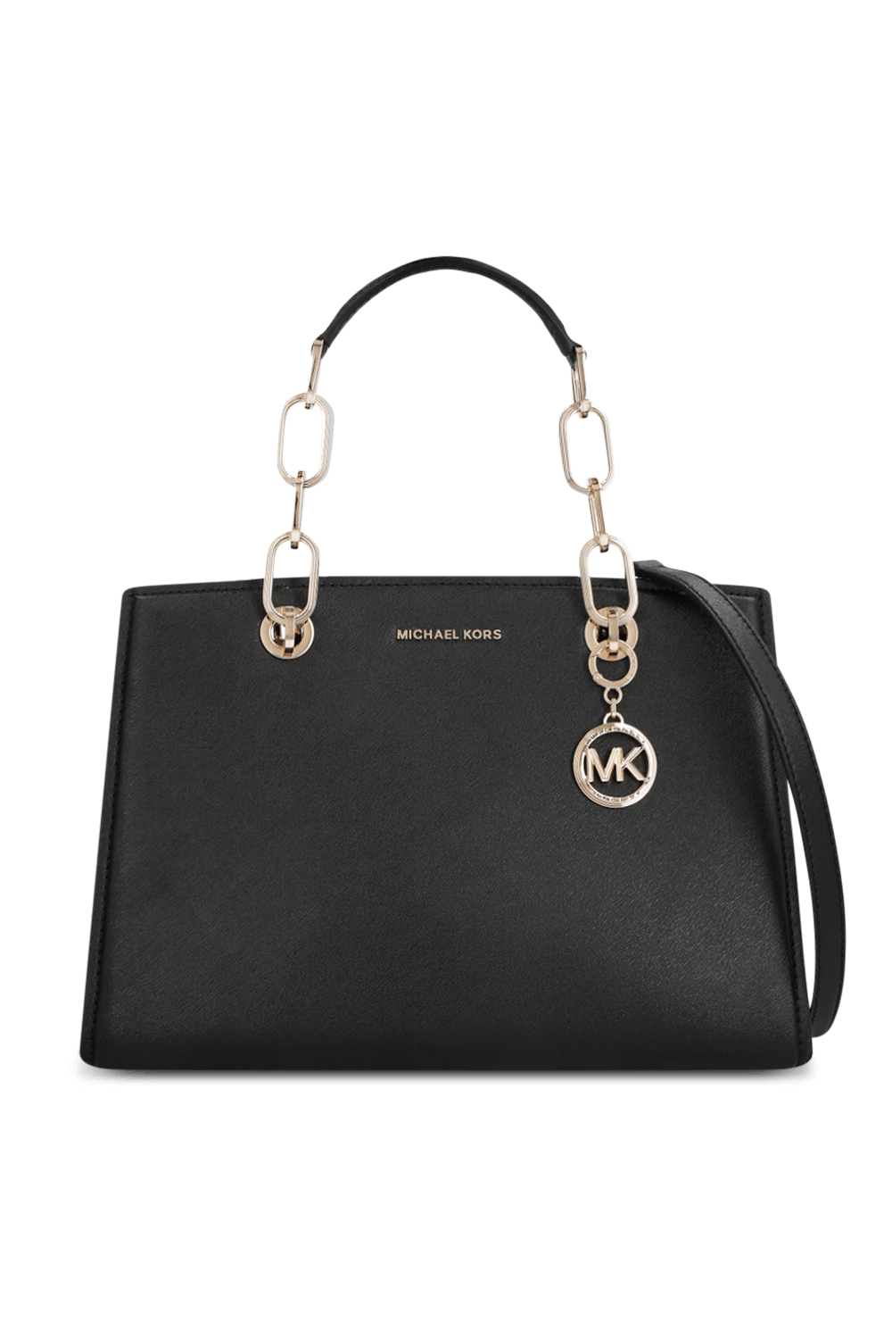 תיק נשיאה מדגם Cynthia בגודל מדיום מבית Michael Kors, עשוי עור בצבע שחור. יש לו תא איחסון מרווח ונוח, עם שני כיסים פנימיים - אחד מהם נסגר ברוכסן. מגיע עם זוג ידיות אחיזה עשויות שרשרת מטאלית זהובה ואלגנטית, צ'ארם MK ורצועת נשיאה מתכווננת הניתנת להסרה. נסגר במגנט.