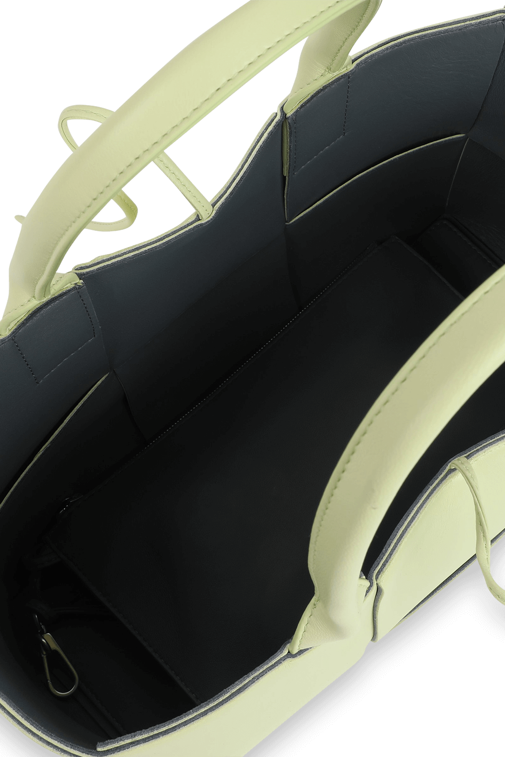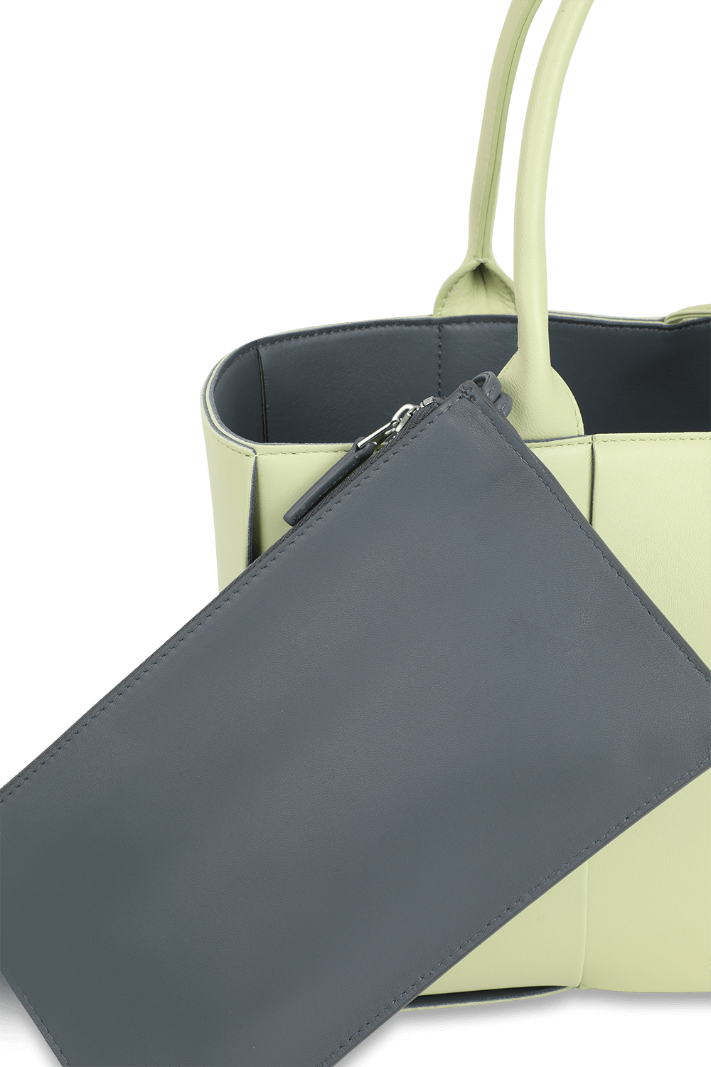 תיק נשיאה מבית האופנה היוקרתי והמדובר Bottega Veneta. דגם זה עשוי מ- 100% עור איכותי בגוון לימון עדין ומציג צללית קלועה שתי וערב המעניקה לו לוק טרנדי שישאר שיקי לאורך עונות רבות. לתיק צללית מלבנית ידיות עגולות וחלוקתו מציעה תא מרכזי שיכיל את חפצייך האישיים.