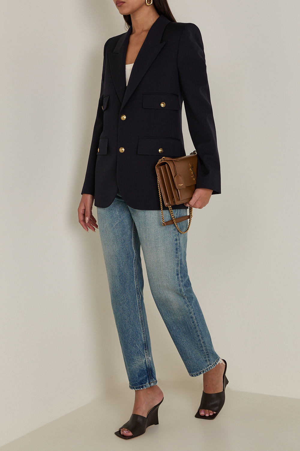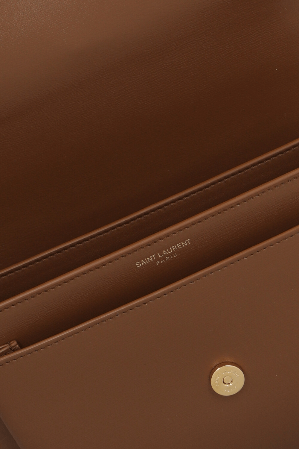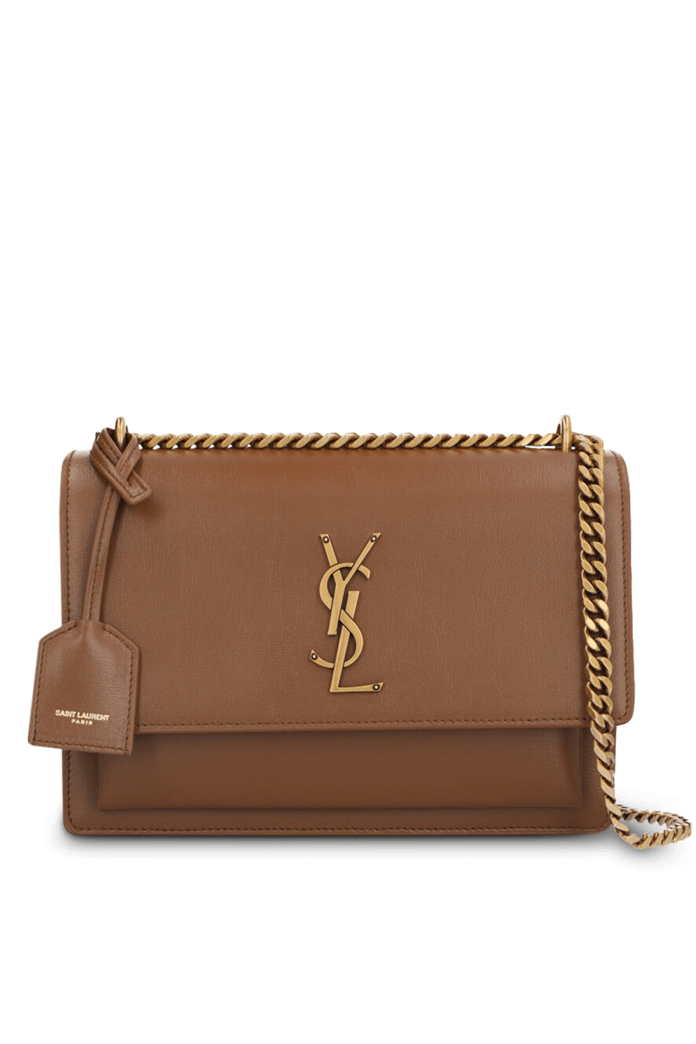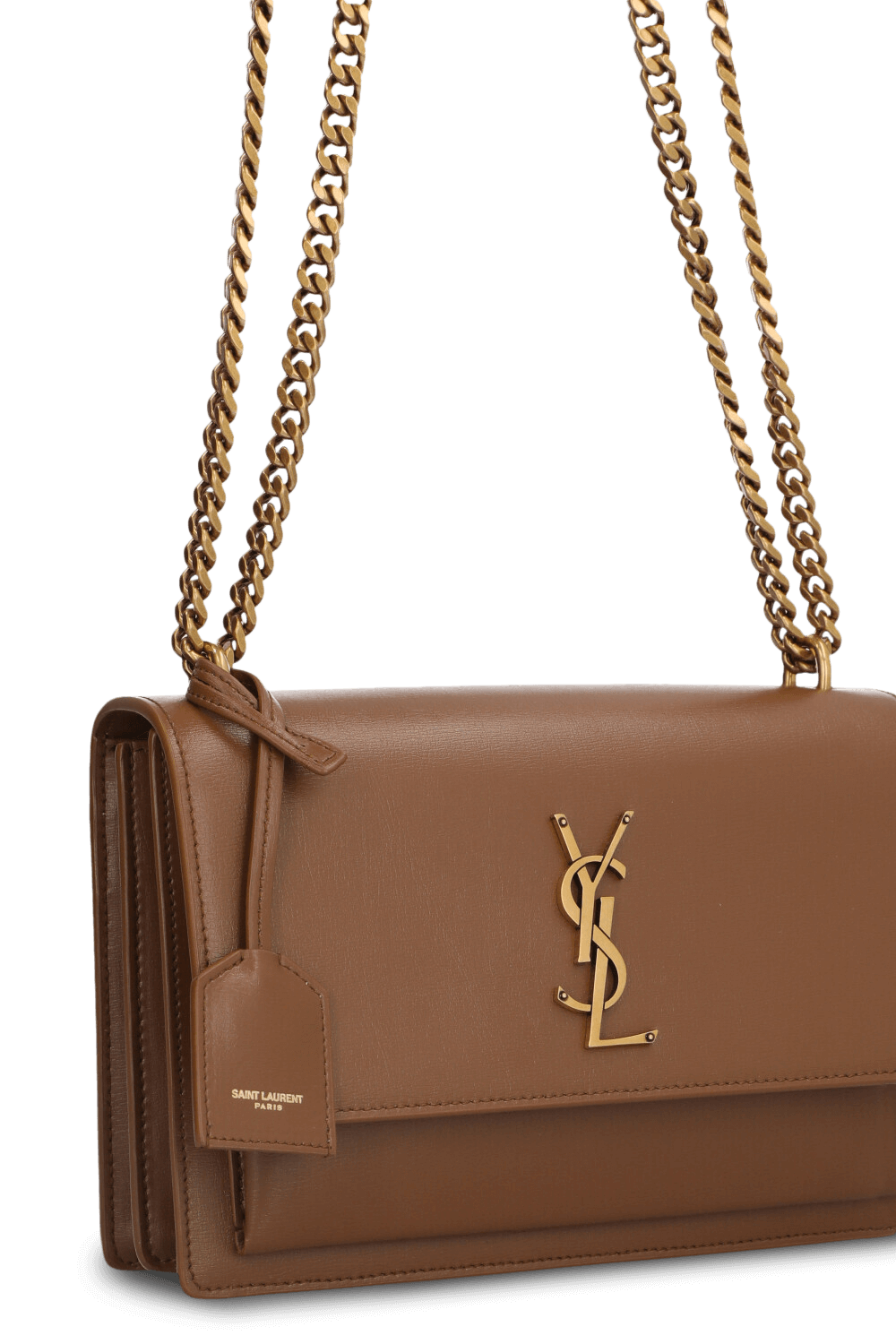 תיק Sunset מבית Saint Laurent, עשוי עור מגורען בצבע חום, עם מקום ל-6 כרטיסי אשראי, נרתיק פנימי, תא נוסף בסגירת רוכסן, תא חיצוני בסגירת מגנט ותא אחורי. מגיע עם ידית אחיזה ורצועת נשיאה הניתנת להסרה, עשויה שרשרת זהובה שניתן לשאת כתיק צד, כקרוס וגם כתיק נשיאה מסוגנן.