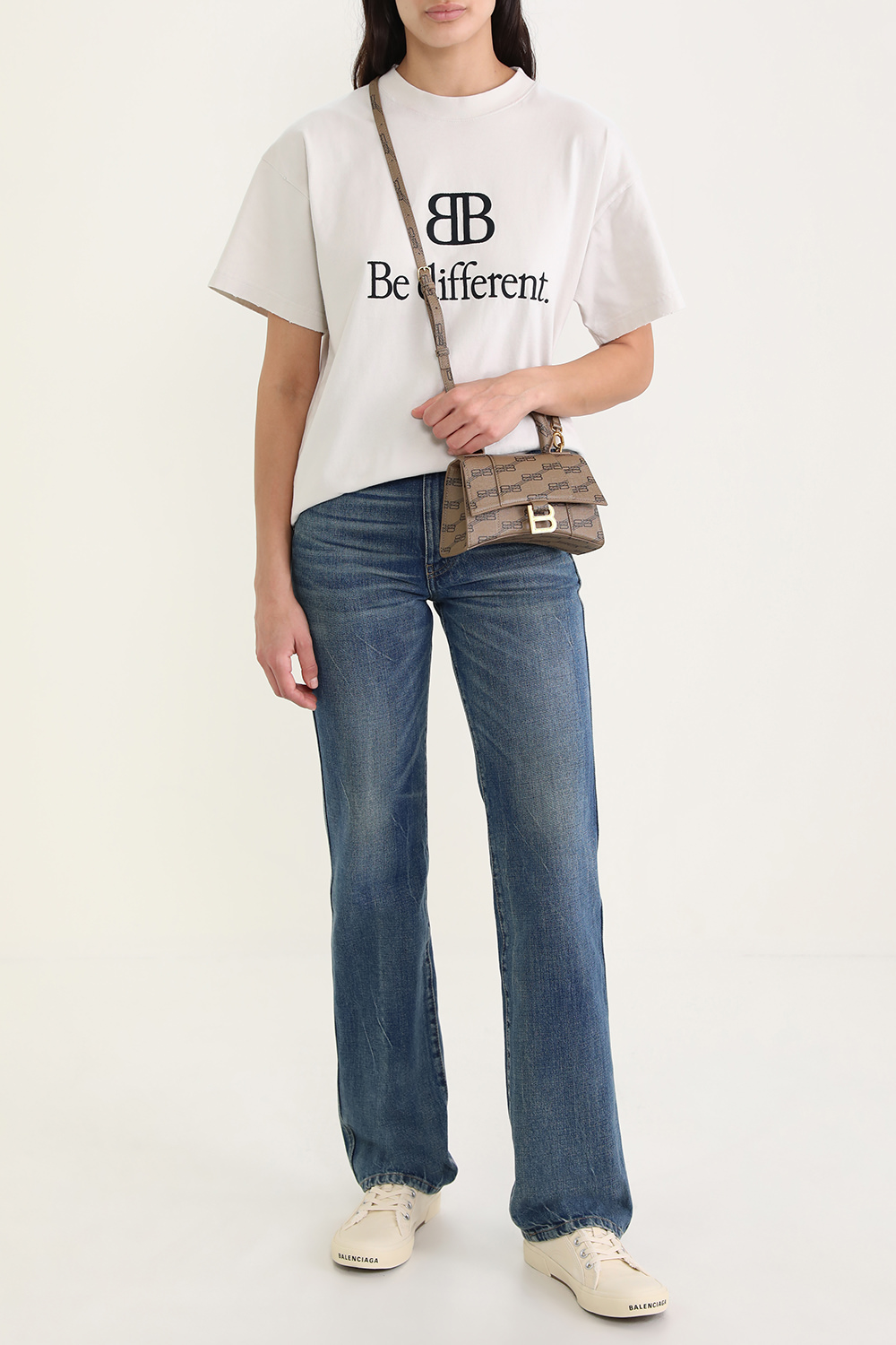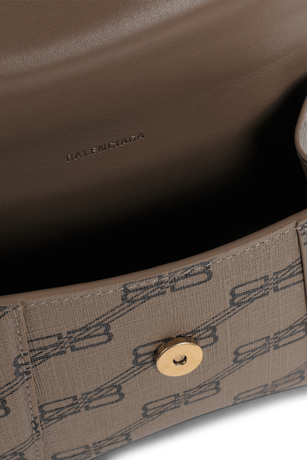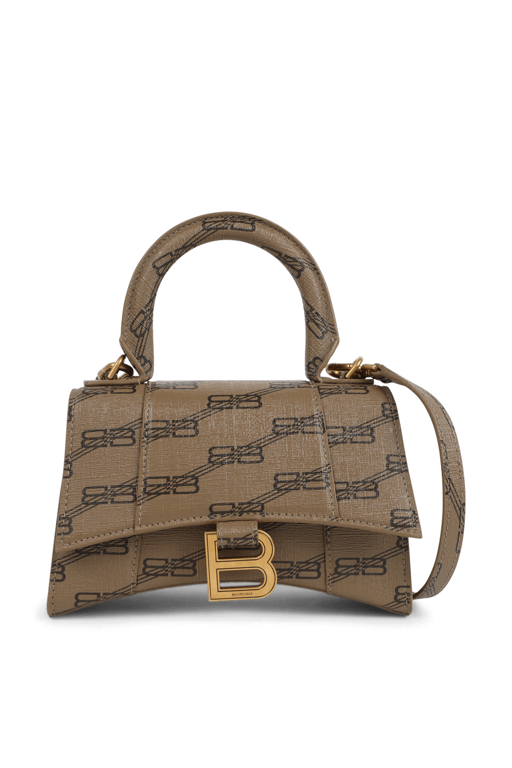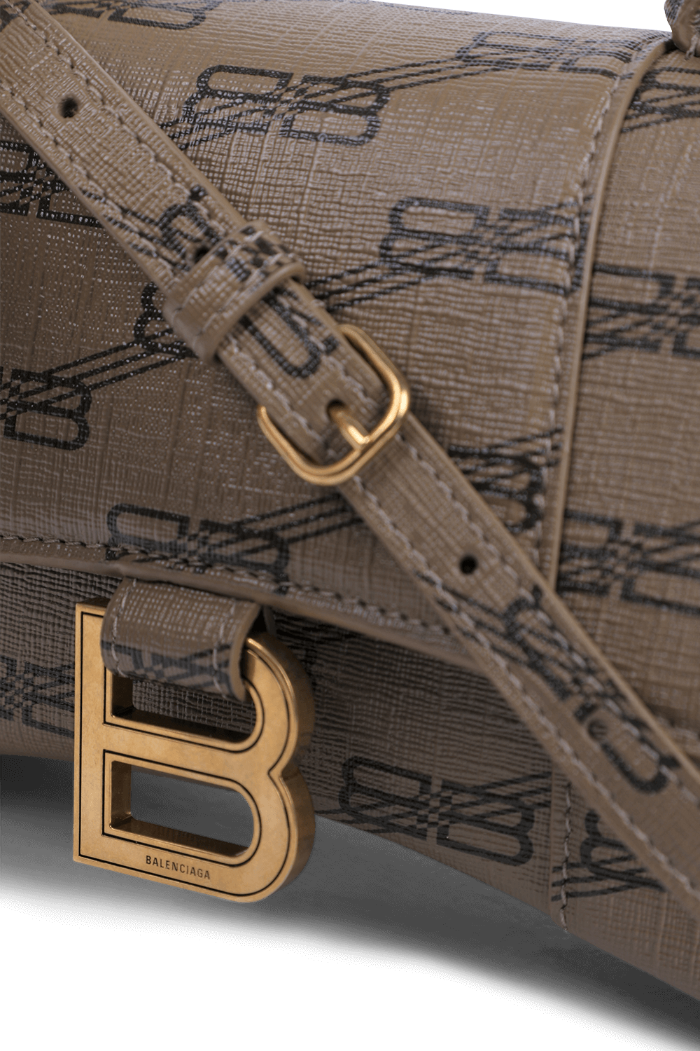 התיק מדגם Hourglass בעיצוב בית Blenciaga עשוי מבד קנבס בגימור מבריק לצד בטנת עור משובח, בעודו מציג צללית שעון- חול קשיחה עם ידית מעוגלת ורצועה ארוכה ונשלפת לצד עיצוב מונוגרמי בגווני בז'. לתיק רכיסה מגנטית המציגה אלמנט מטאלי זהוב בחיתוך B בחזיתו, וחלוקתו מציעה תא מרכזי שבתוכו תא מרוכסן.