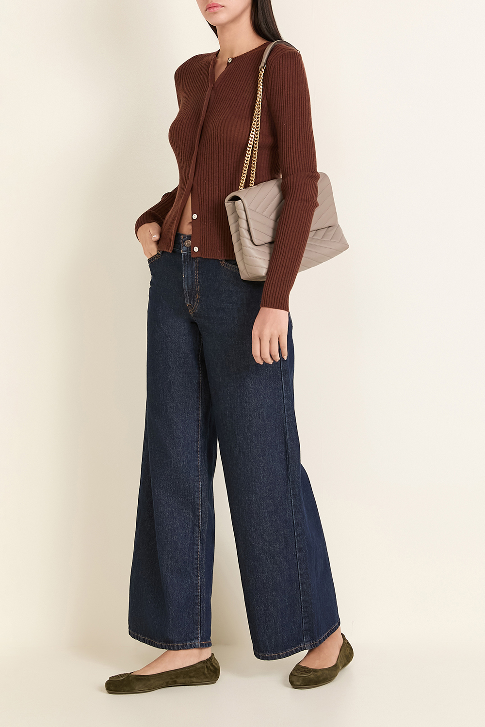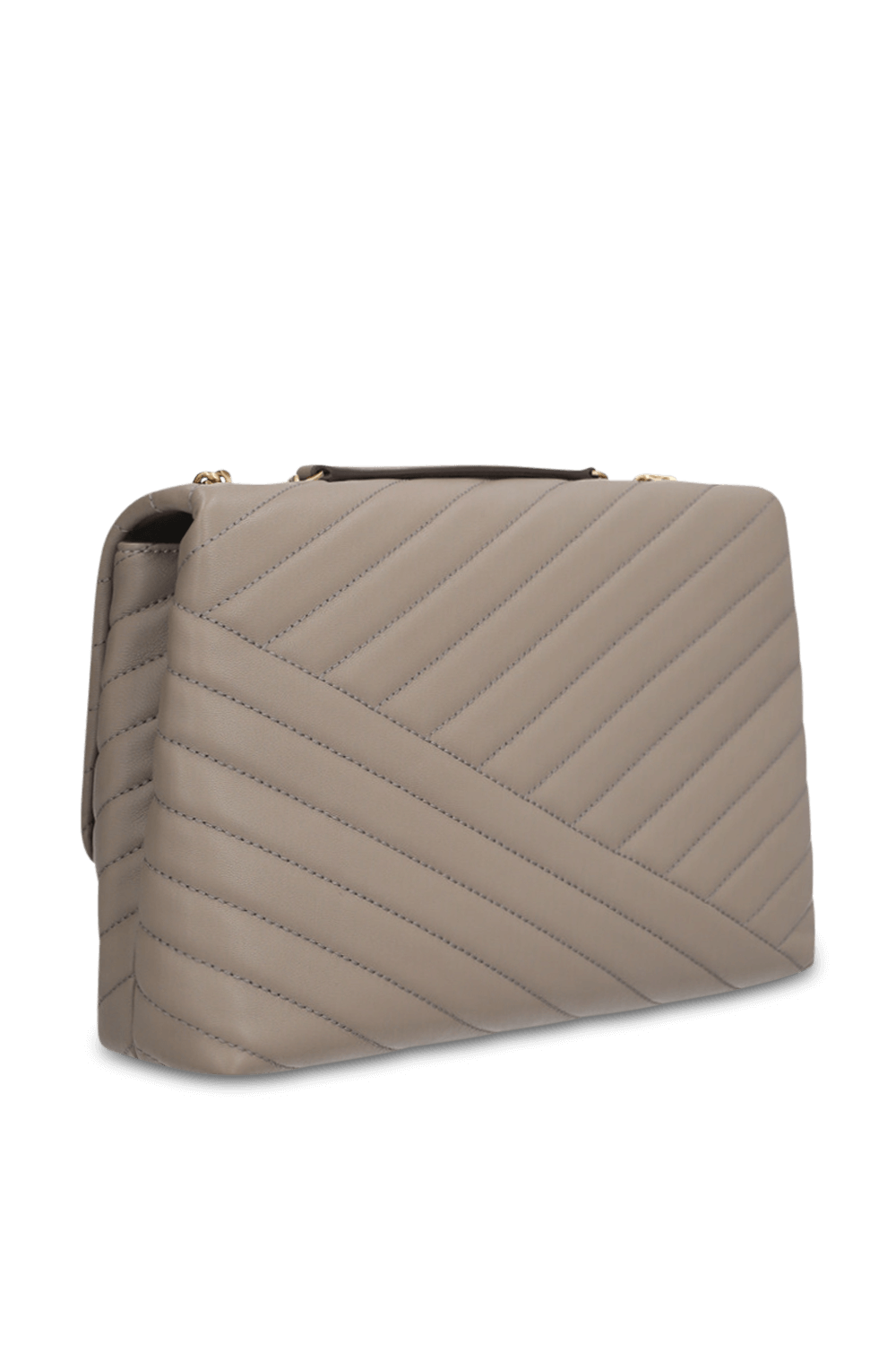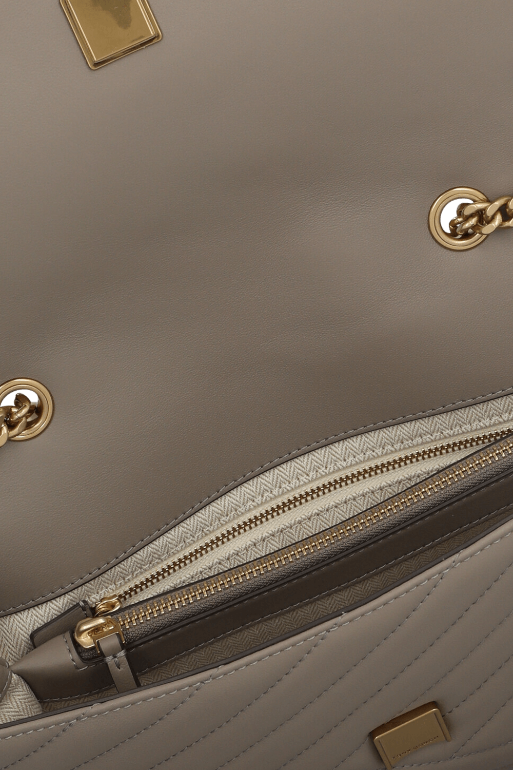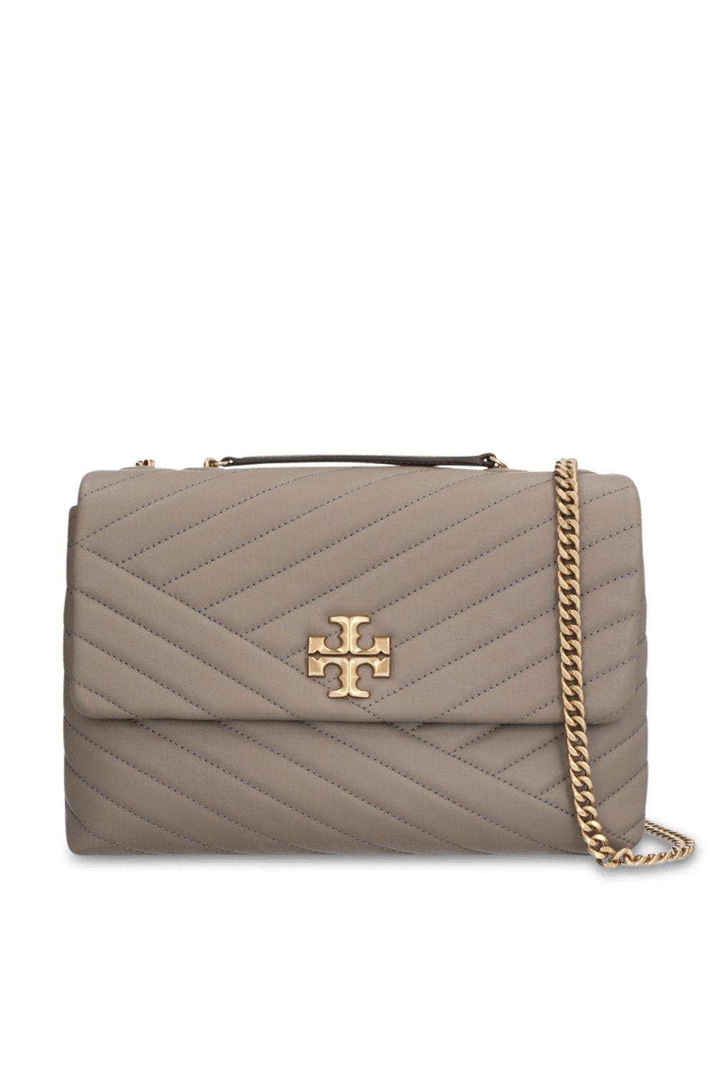 תיק מדגם Kira מבית Tory Burch, העשוי עור בצבע אפור עם תפרי קווילט אלכסוניים. לוגו המותג מצורף בחזית בחיתוך מטאלי מוזהב. לתיק שרשרת נשיאה זהובה וסגירת מתקפלת, עם תא מרכזי הכולל חלוקה לשני תאים ותא עם רוכסן.