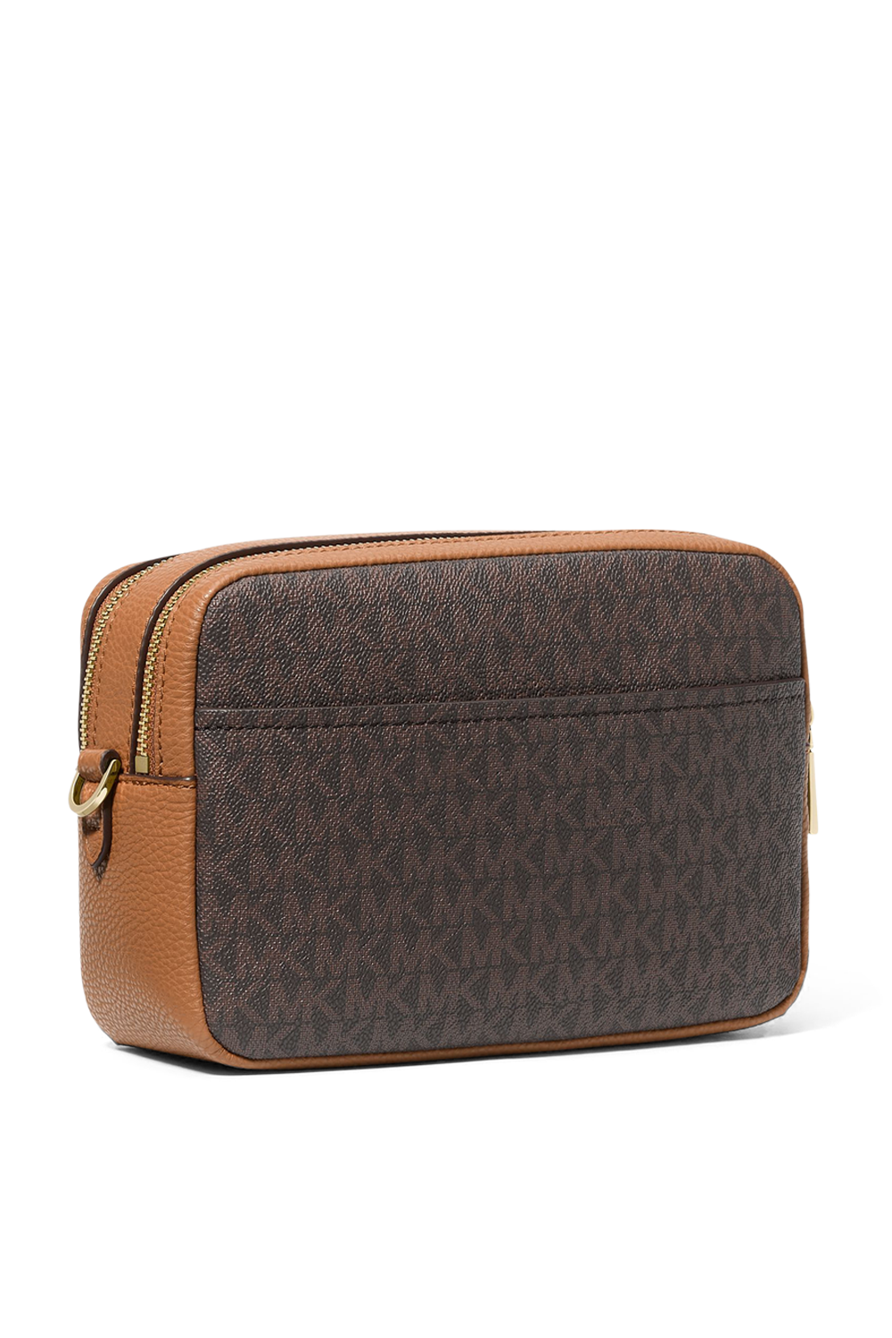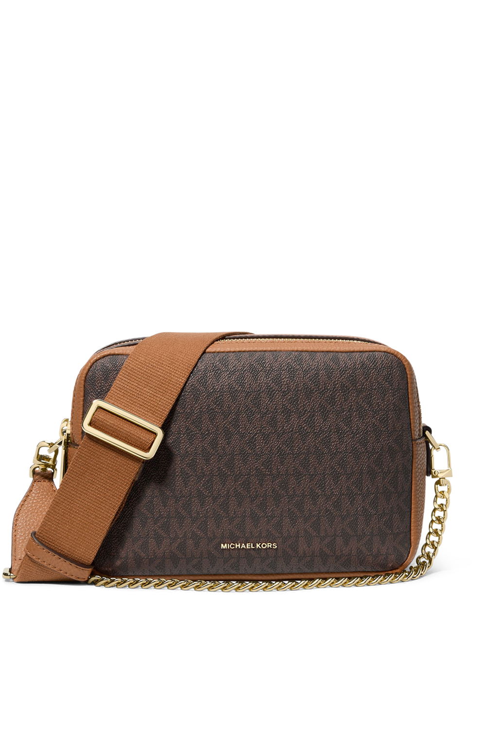 תיק קאמרה מדגם Bryant בגודל מדיום בעיצוב בית האופנה Michael Kors. הוא עשוי קנבס בצבע חום עם חלוקה לשני תאים הנסגרים כל אחד מהם ברוכסן, עם בטנת בד ותא פנימי. בנוסף, יש לו תא חיצוני והוא מגיע עם שרשרת זהובה ורצועת נשיאה ארוכה - שתיהן ניתנות להסרה.