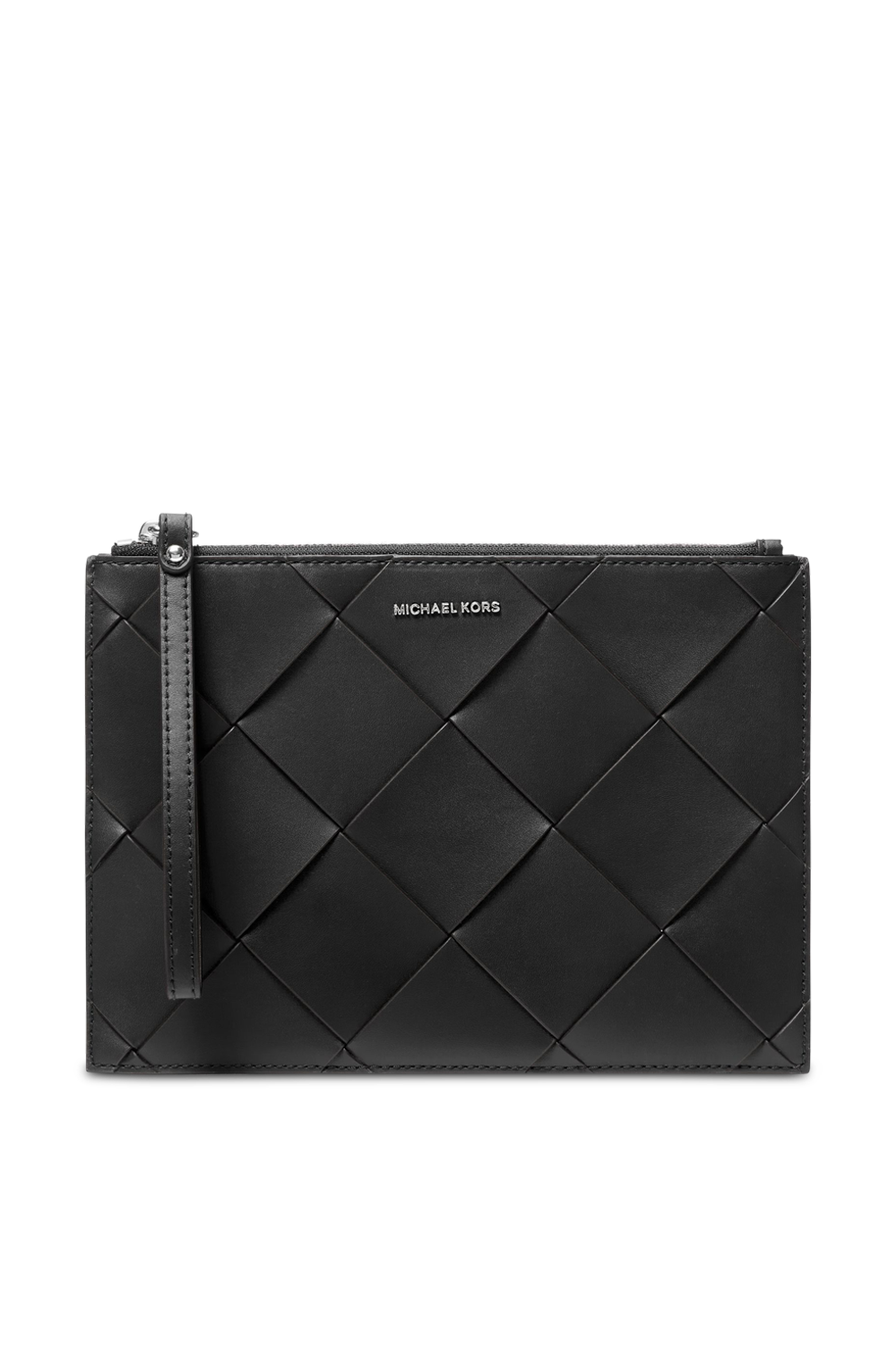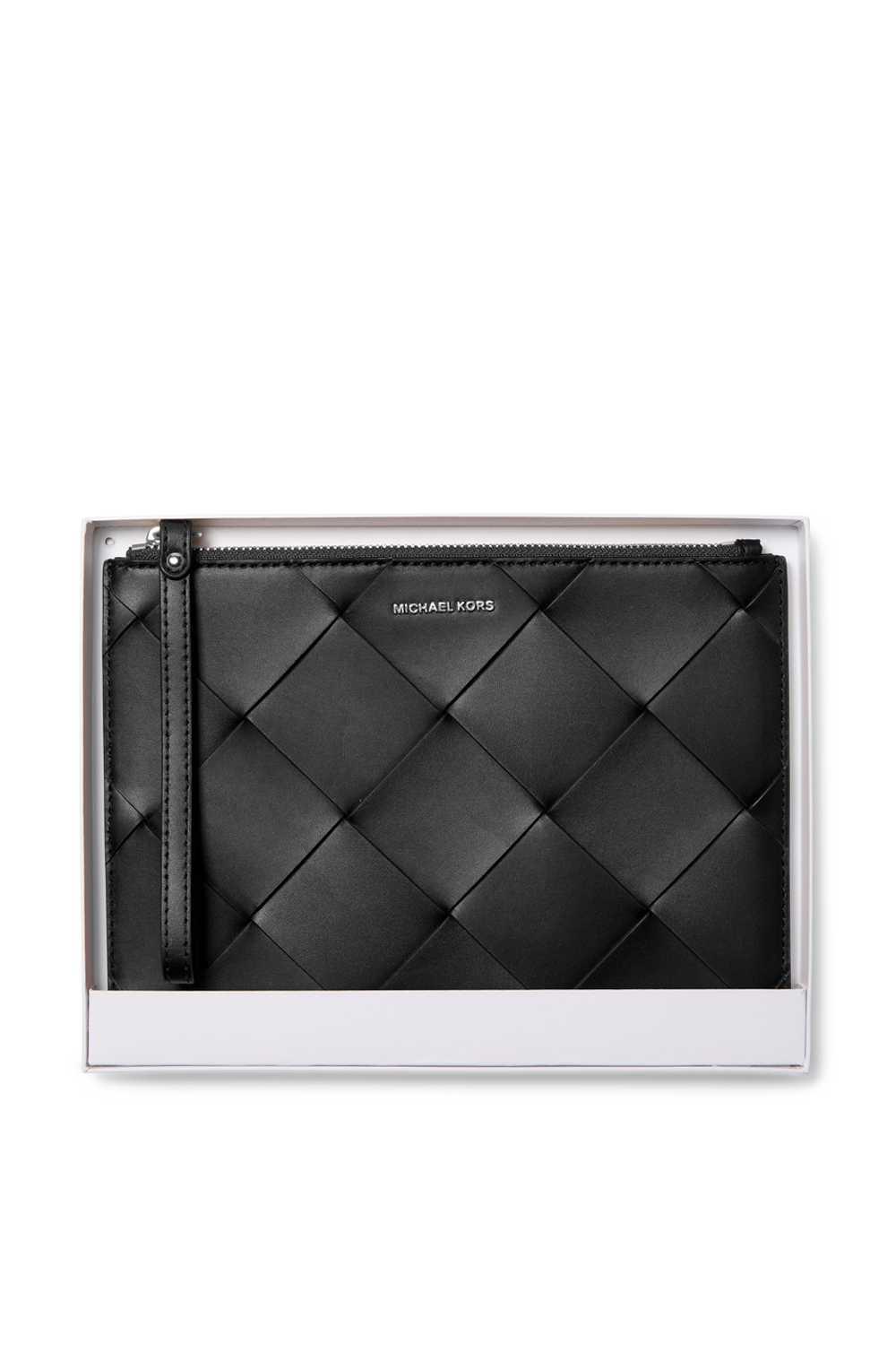 תיק קלאץ' Jet Set בגודל אקסטרה לארג' מבית Michael Kors - בגודל המדוייק כדי להכיל את כל חפצייך החיוניים, אך גם קטן מספיק כדי להשתלב בתיק היומימי שלך. הוא עשוי בעבודת יד מעור קלוע בצבע שחור בסגירת רוכסן, עם ידית נשיאה לפרק כף היד. מגיע בקופסת מתנה מבית המותג.