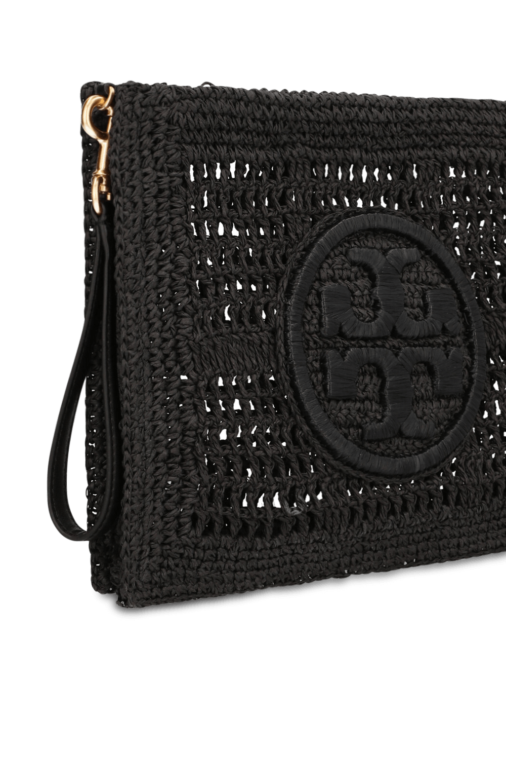 תיק קלאץ' מבית Tory Burch, בסריגת קרושה בצבע שחור עם לוגו פאץ'. מגיע עם רצועת אחיזה לפרק כף היד עשויה עור טבעוני בצבע שחור.