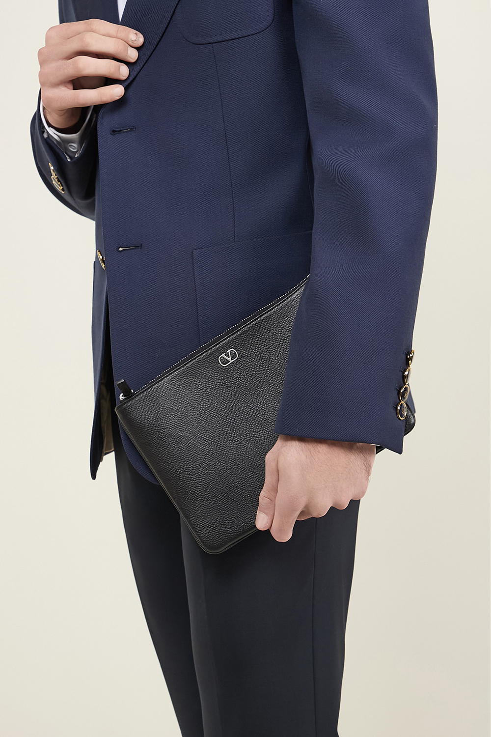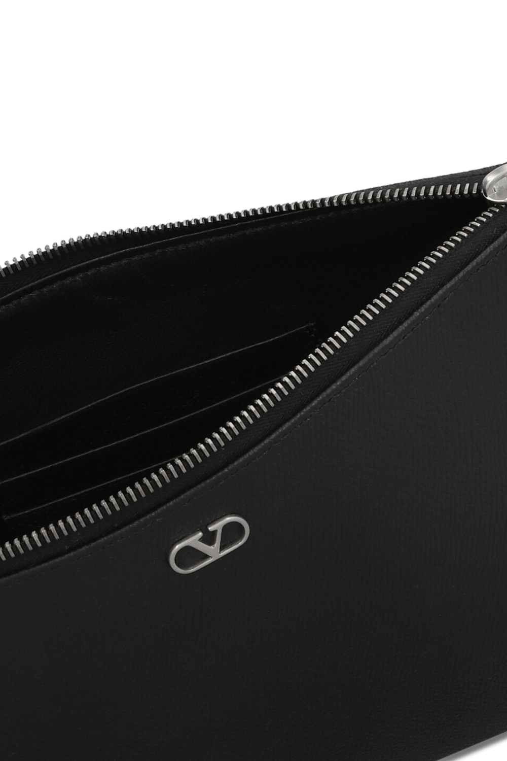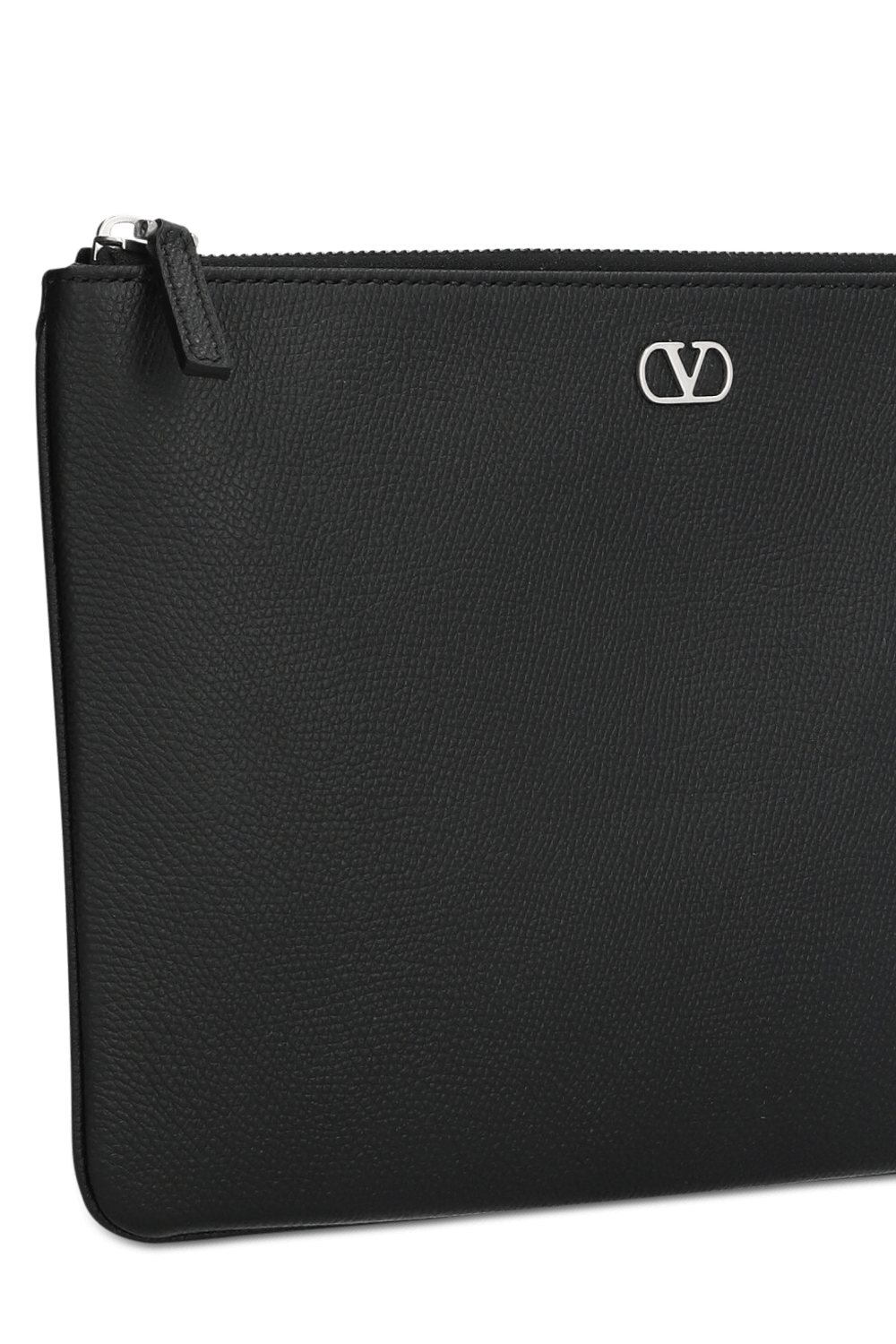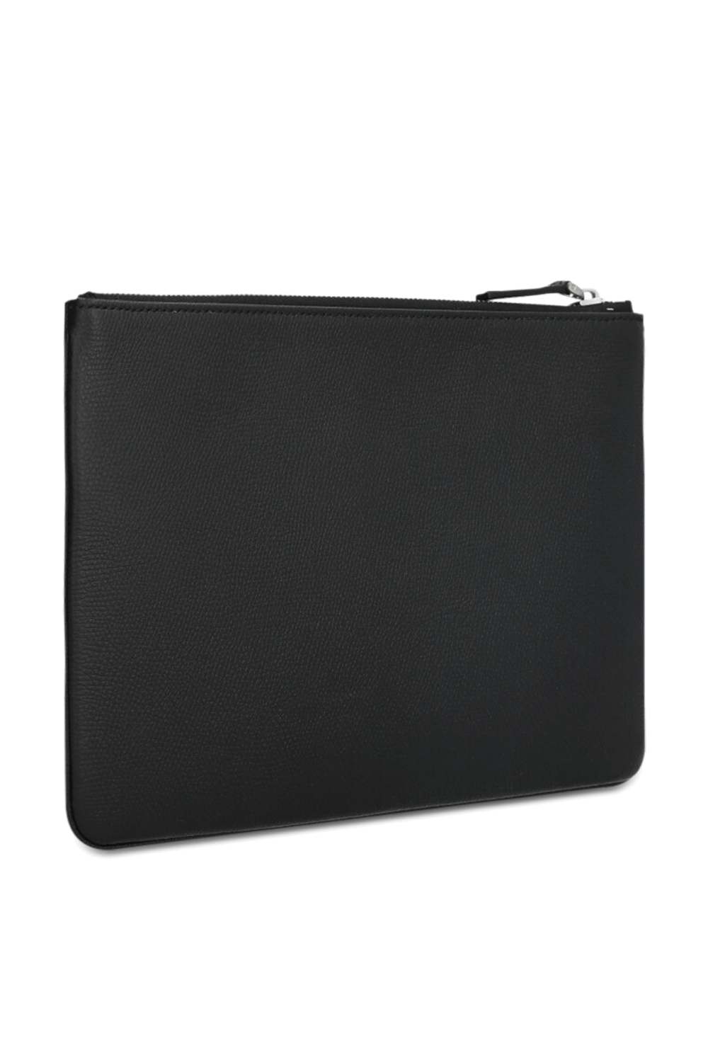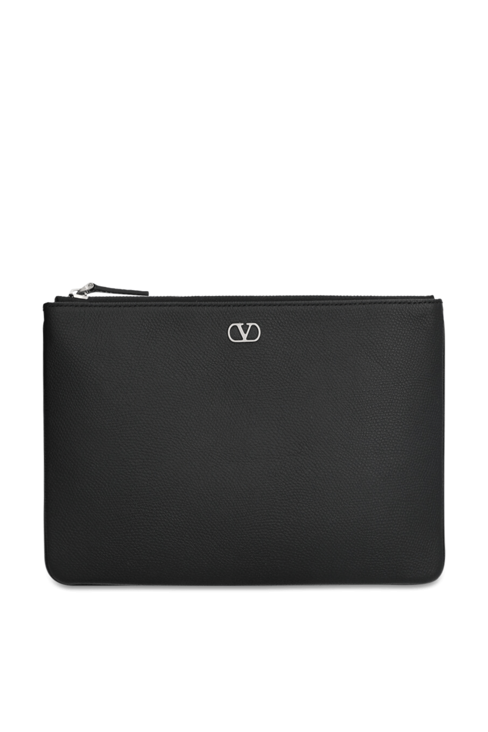 תיק קלאץ' מבית Valentino, עשוי עור מגורען בצבע שחור. יש לו ביטנת עור שחורה חלקה עם שלושה חריצים לכרטיס. נסגר ברוכסן.