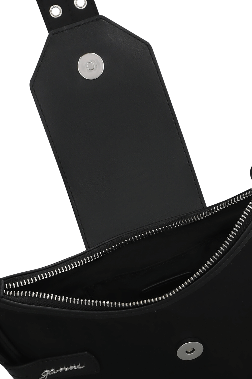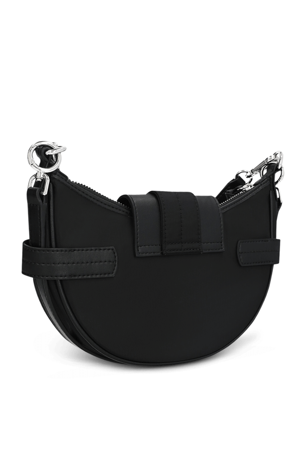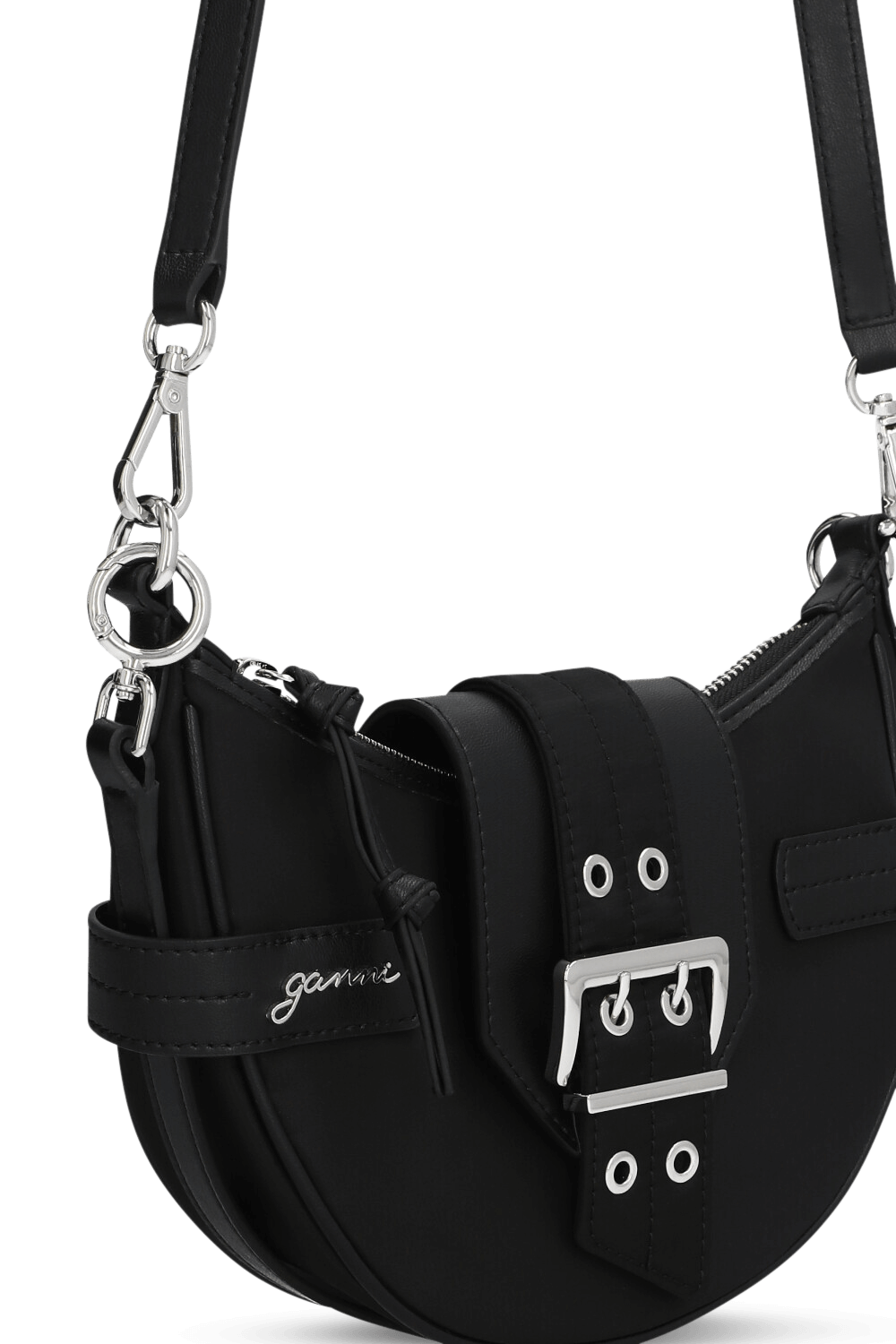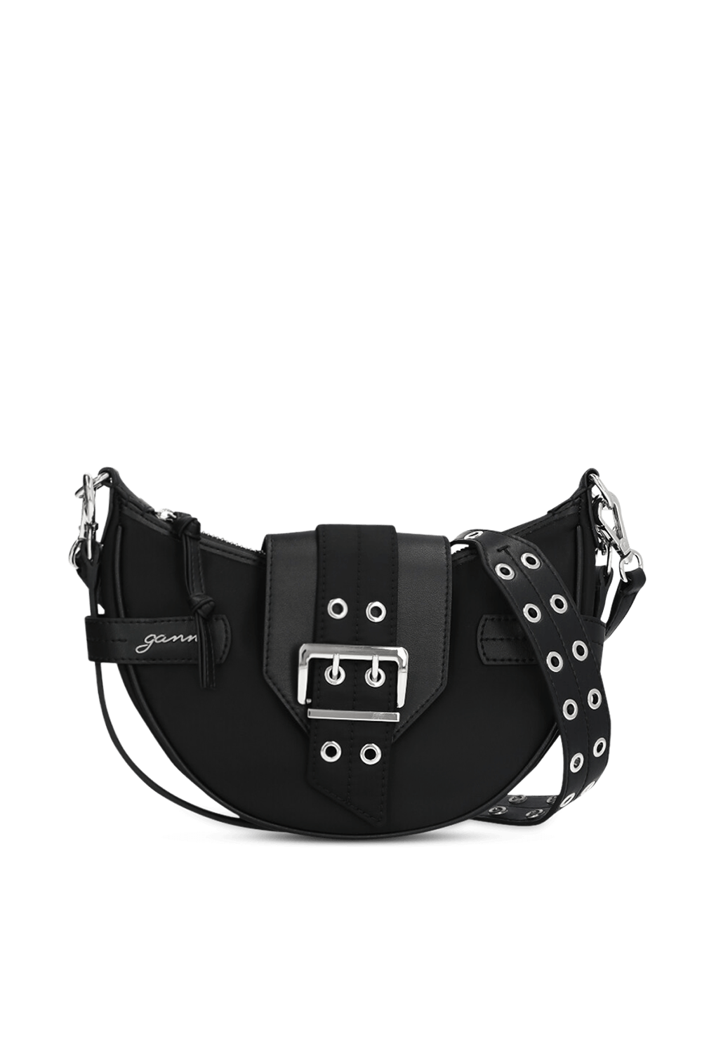 תיק קרוסבודי Bucky בגודל סמול ובעיצוב יחודי מבית Ganni. הוא עשוי ניילון ממוחזר בצבע שחור בצורת חצי ירח, עם ביטנת ניילון שחורה וכיס פנימי לכרטיס. התיק נסגר ברוכסן וברצועת עור הנסגרת במגנט בעיצוב אבזם רחב. התיק מגיע עם שתי רצועות נשיאה מעור - רצועה ארוכה הניתנת להתאמה אישית ולהסרה, ורצועת כתף דקה שאפשר להסיר או להשאיר ולשלב בחלק התחתון של התיק.