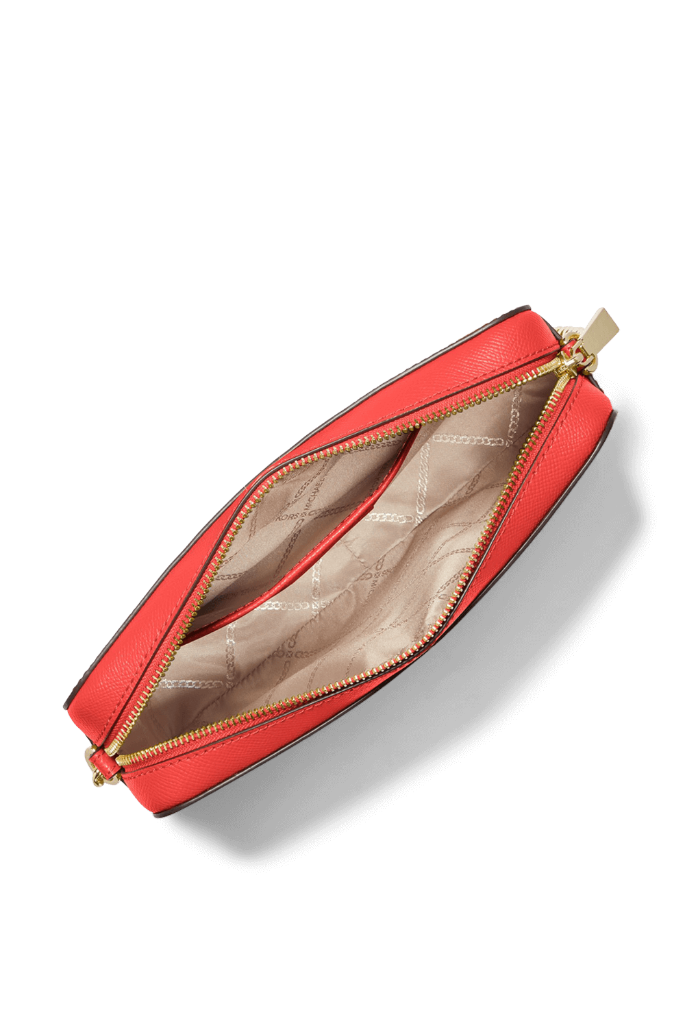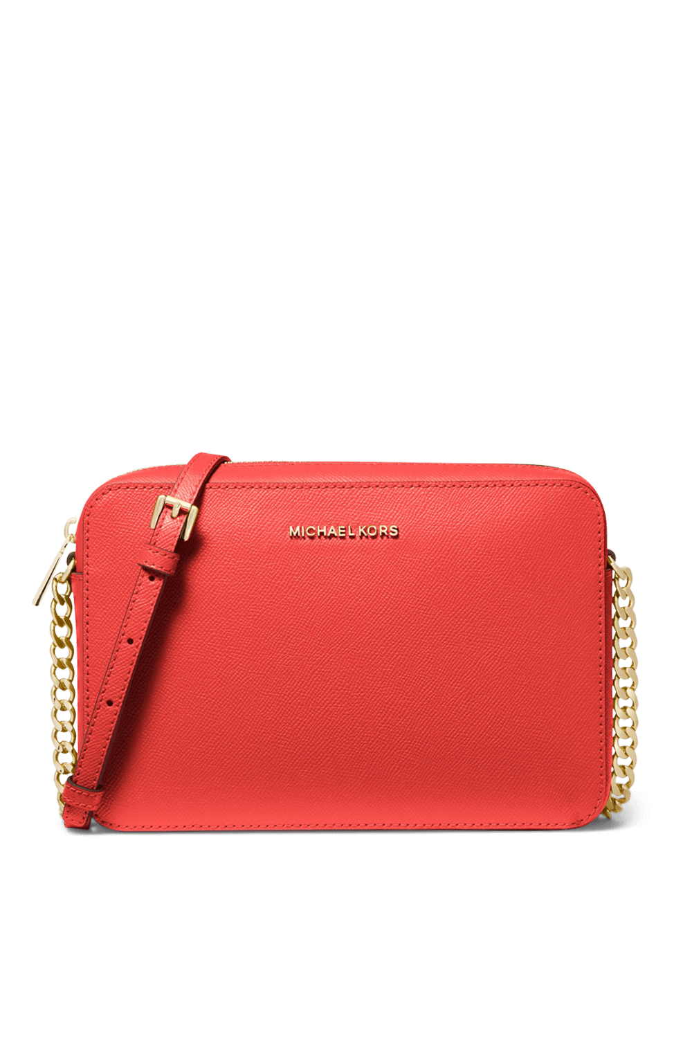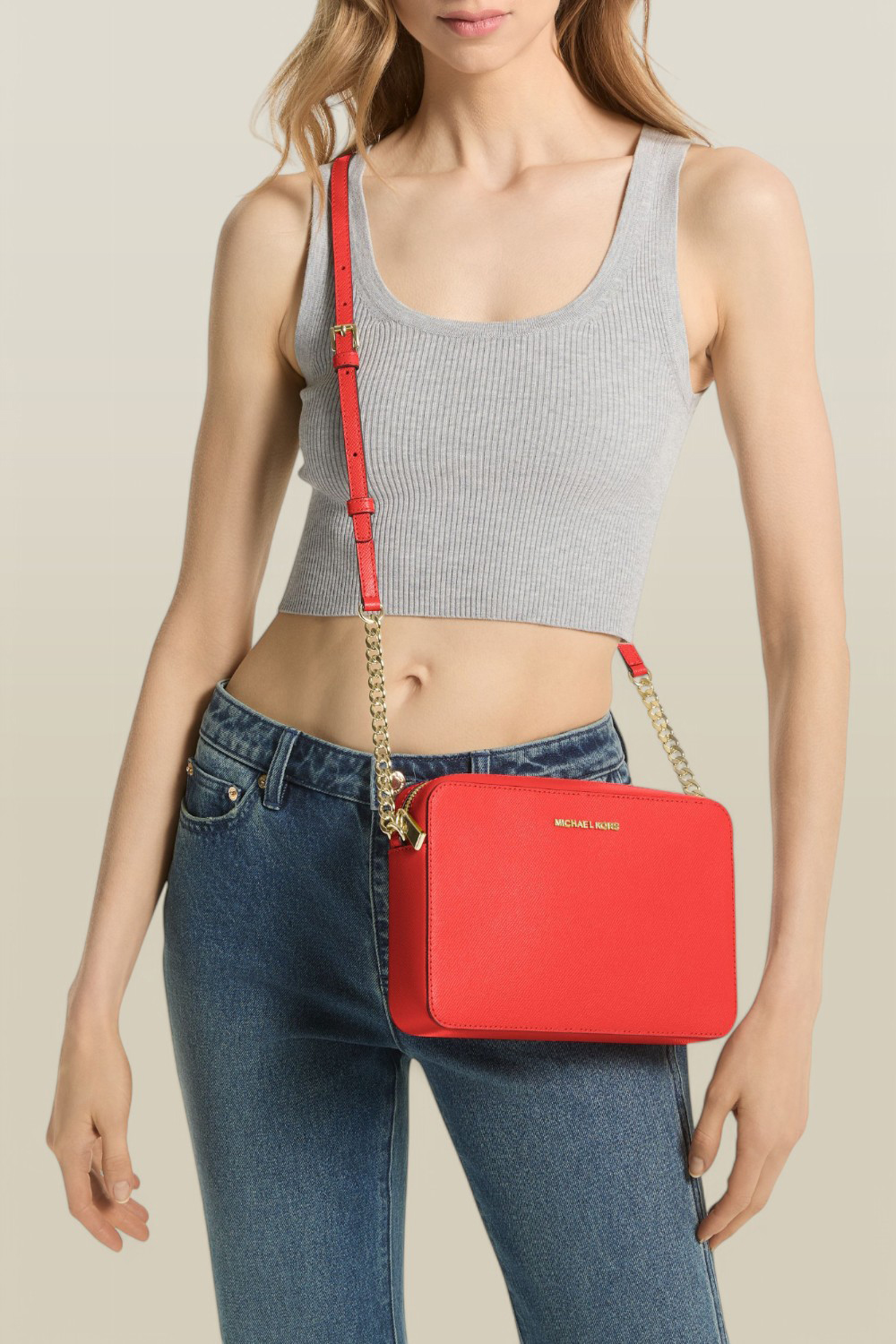 תיק קרוסבודי Jet Set בגודל לארג' מבית Michael Kors, עשוי עור ספיאנו בצבע קורל. יש לו תא אחסון מרכזי עם שני כיסים פנימיים והוא נסגר ברוכסן וכן רצועת קרוסבודי מתכווננת עשויה עור ושרשרת זהובה.