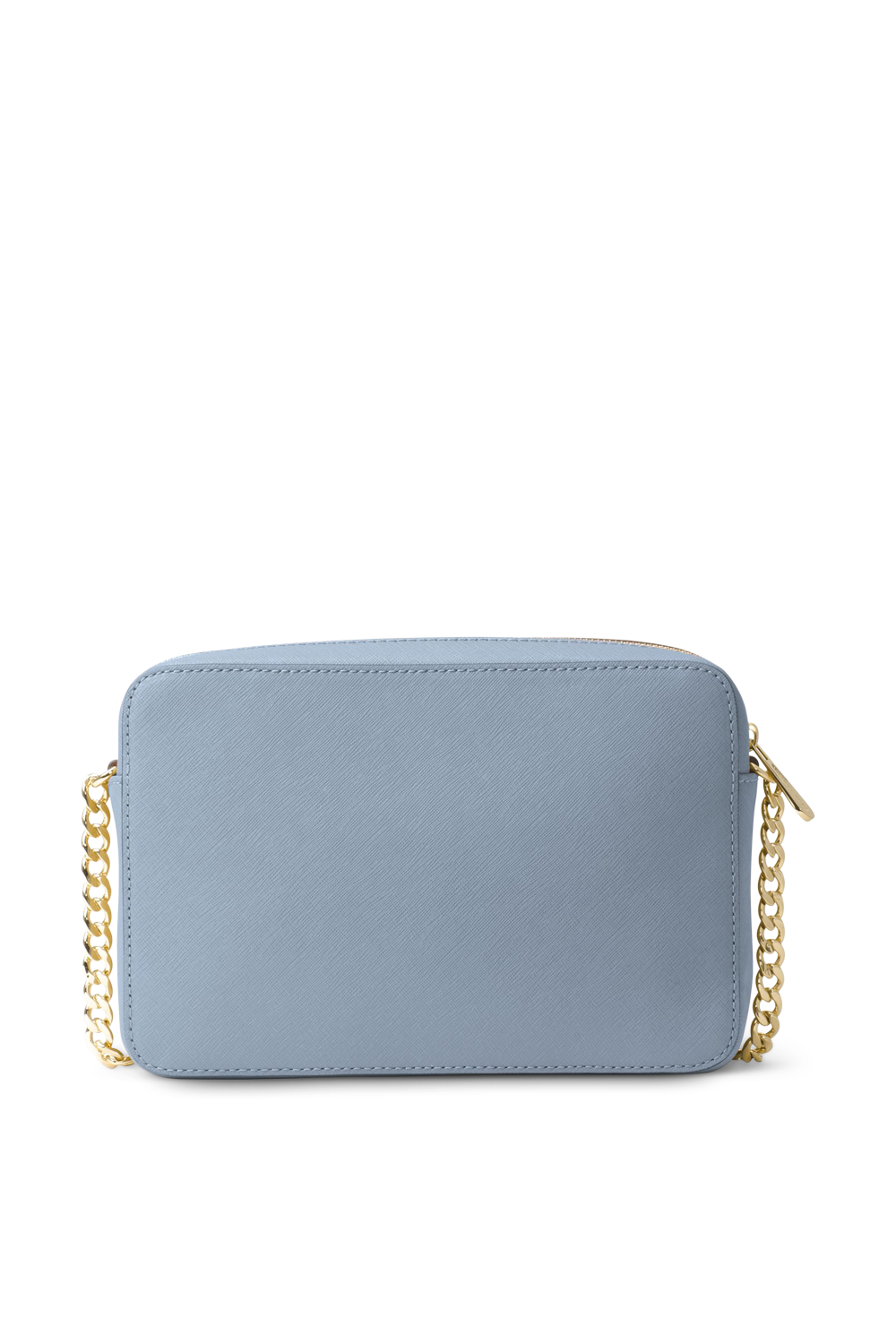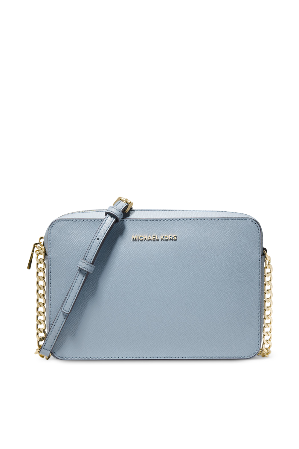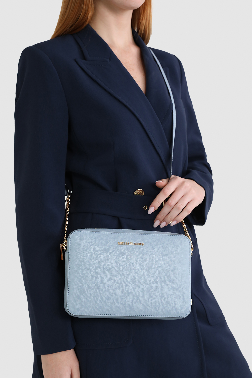 תיק מדגם Jet Set מבית Michael Kors, עשוי עור בצבע תכלת בשילוב תא אחסון מרכזי בסגירת רוכסן עם רצועת נשיאה עשויה שרשראות מטאליות זהובות.
