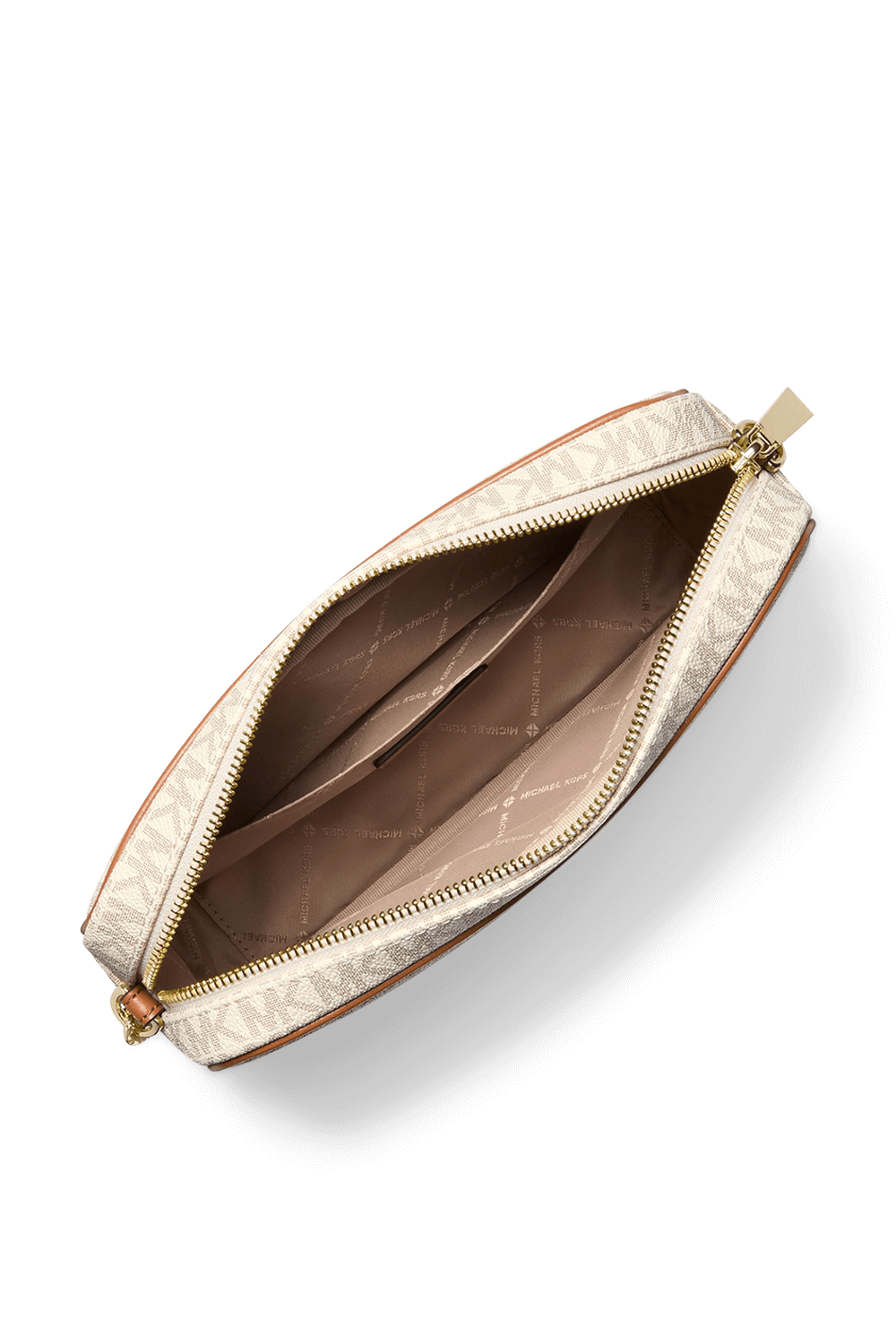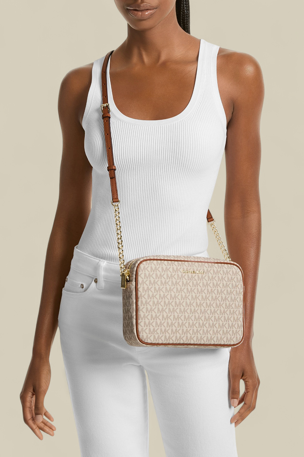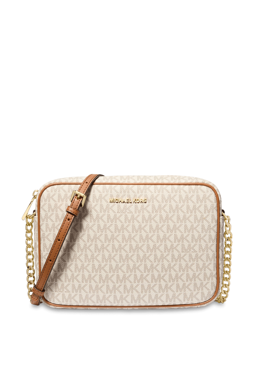 תיק קרוסבודי מדגם Jet Set בגודל לארג' מבית Michael Kors, עשוי קנבס בצבע לבן ובדוגמת מונוגרמת MK האהובה, עם גימורים מעור. לתיק תא מרכזי עם כיס פנימי ויש לו רצועת קרוסבודי מתכווננת, המשלבת בין עור ושרשרת זהובה. נסגר ברוכסן.