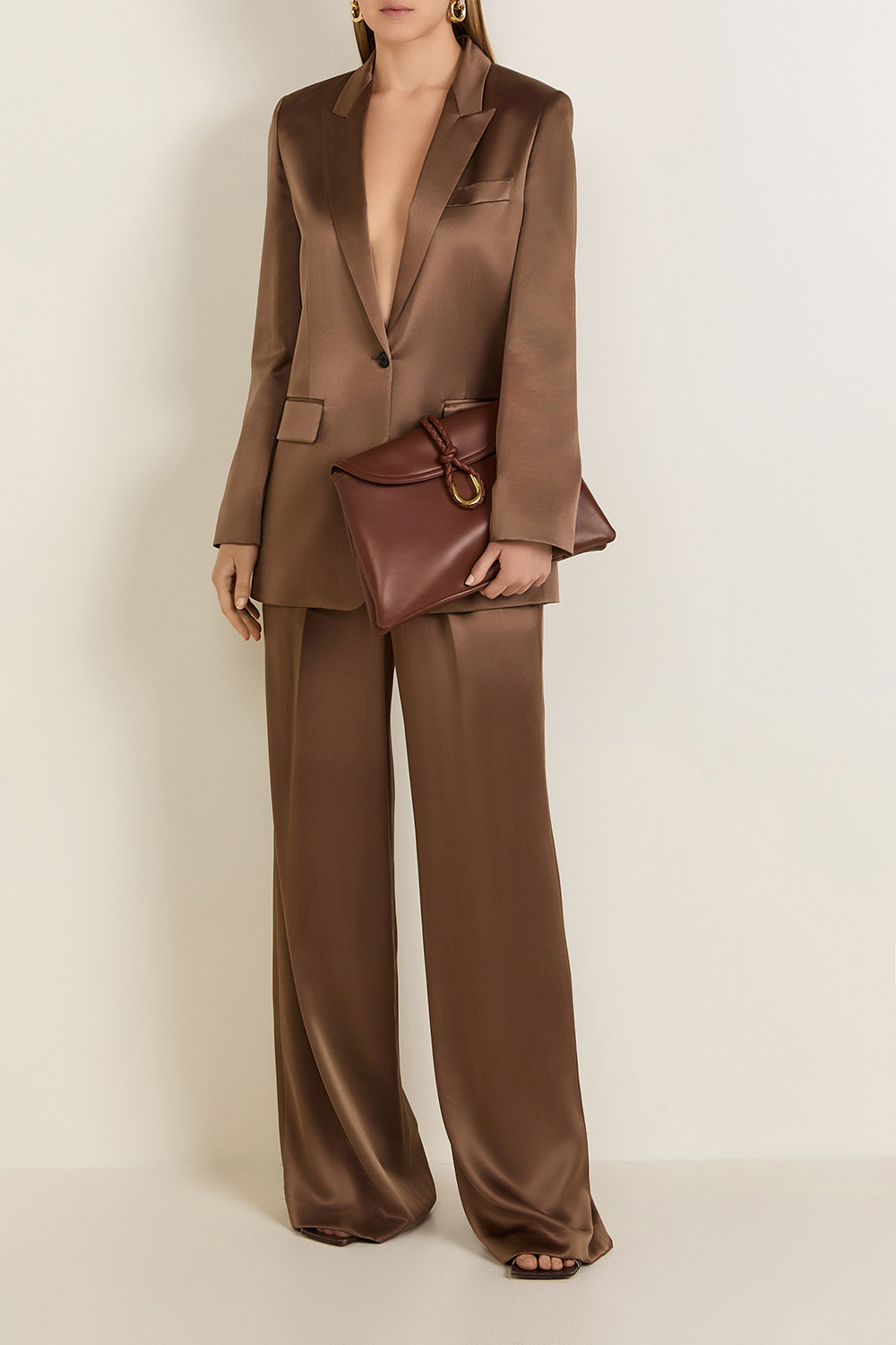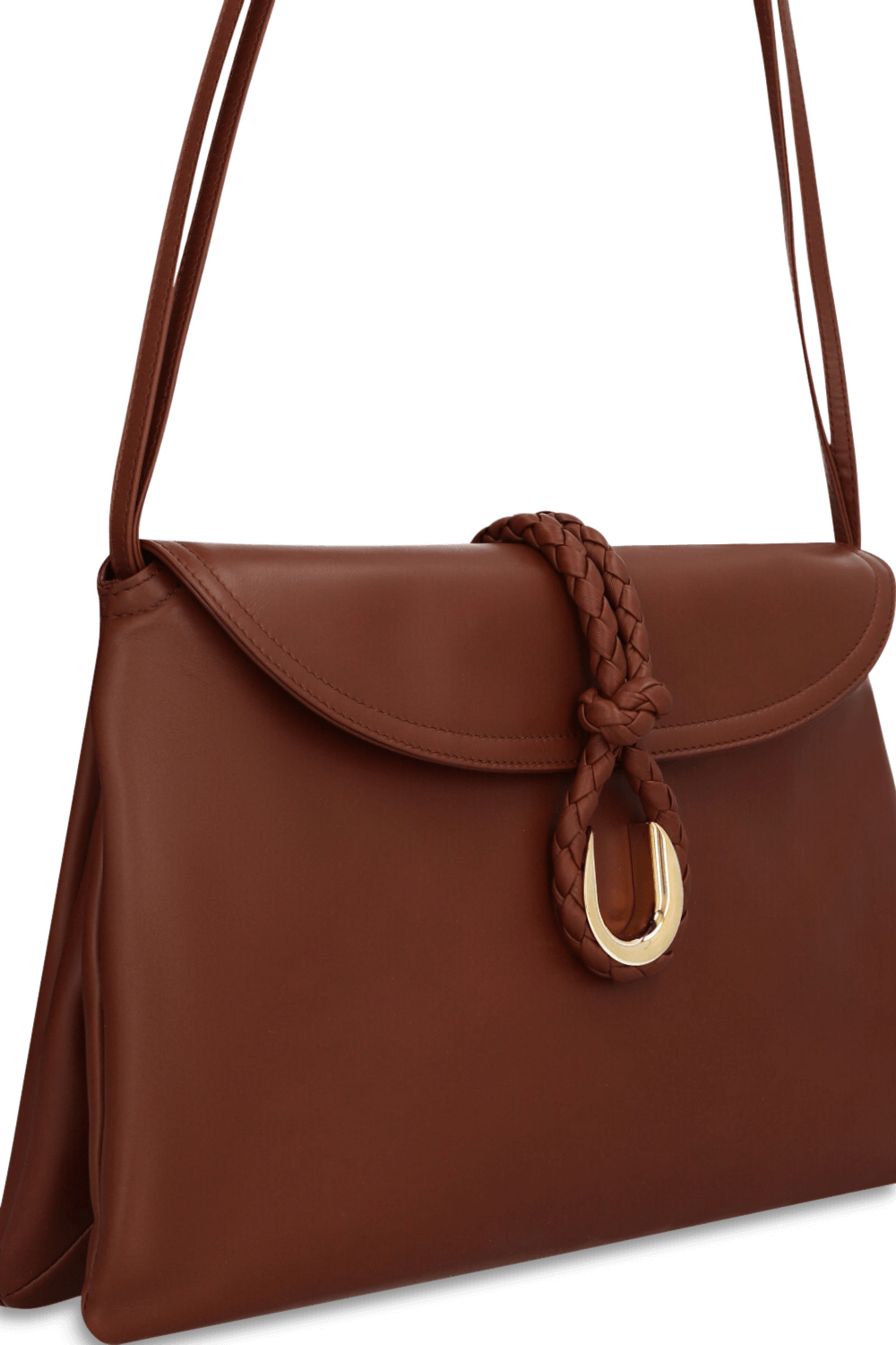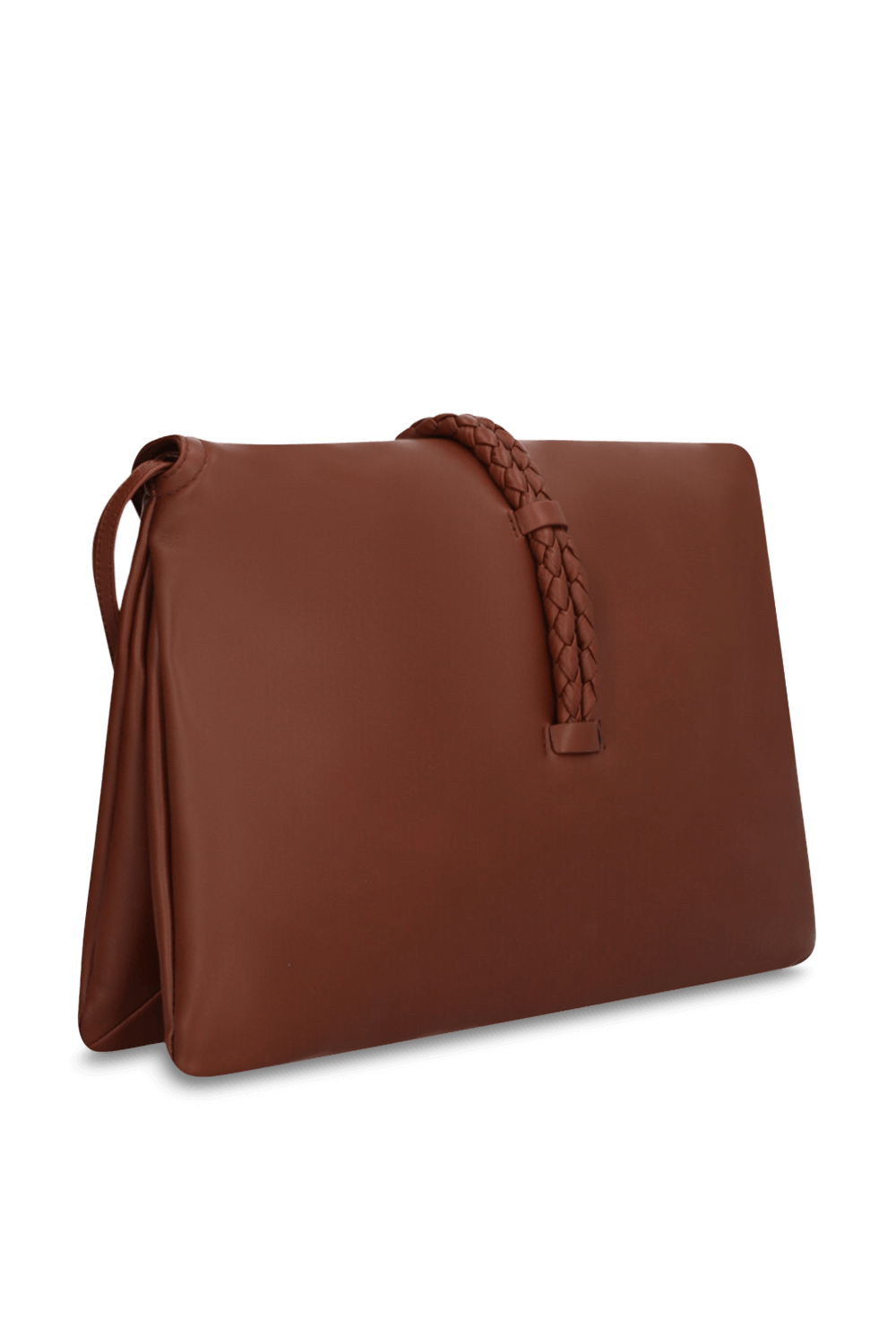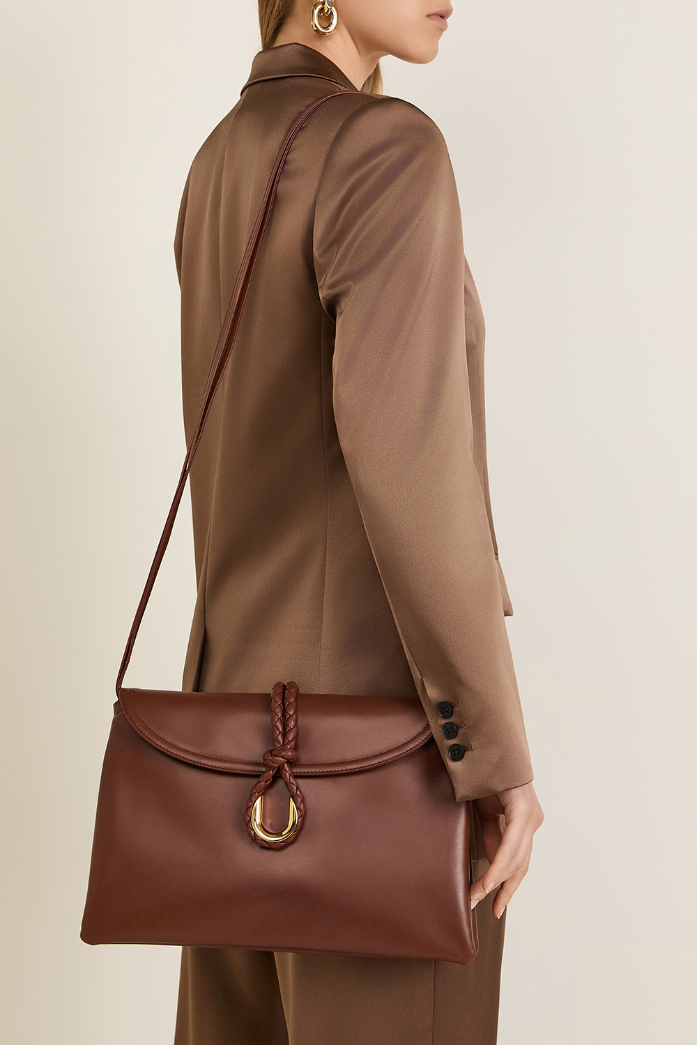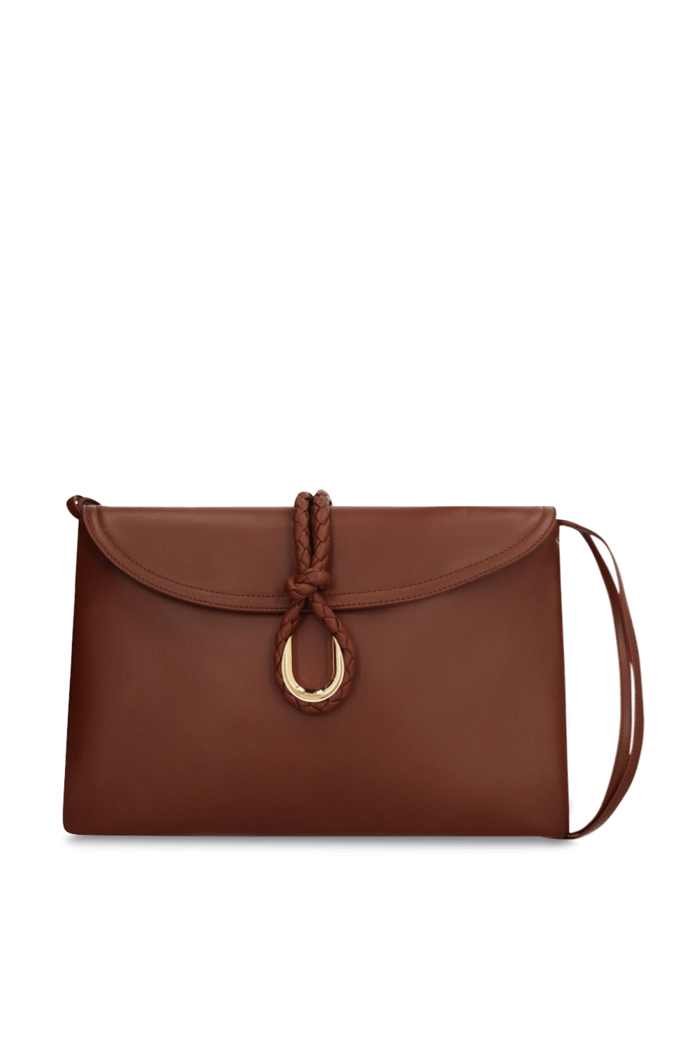 תיק נשיאה Liberta מבית Bottega Veneta, עשוי עור חלק ורך בצבע חום. יש לו בטנת זמש עם כיס פנימי בסגירת רוכסן והוא נסגר בלולאה. ניתן להכניס את רצועת הנשיאה אל תוך התיק ולשאת אותו כקלאץ'.