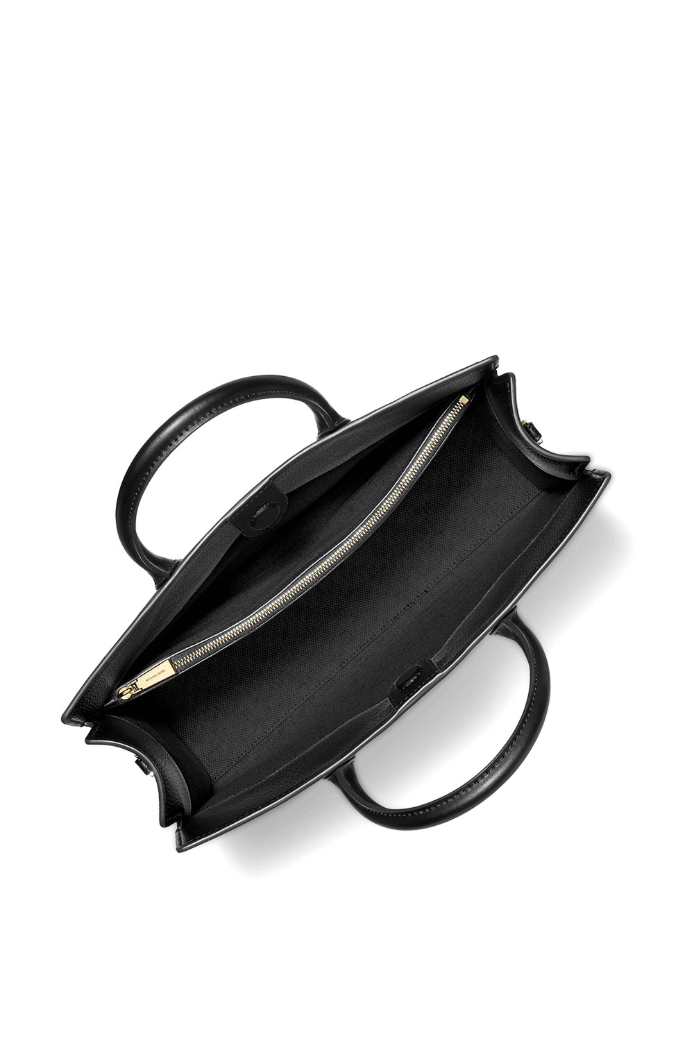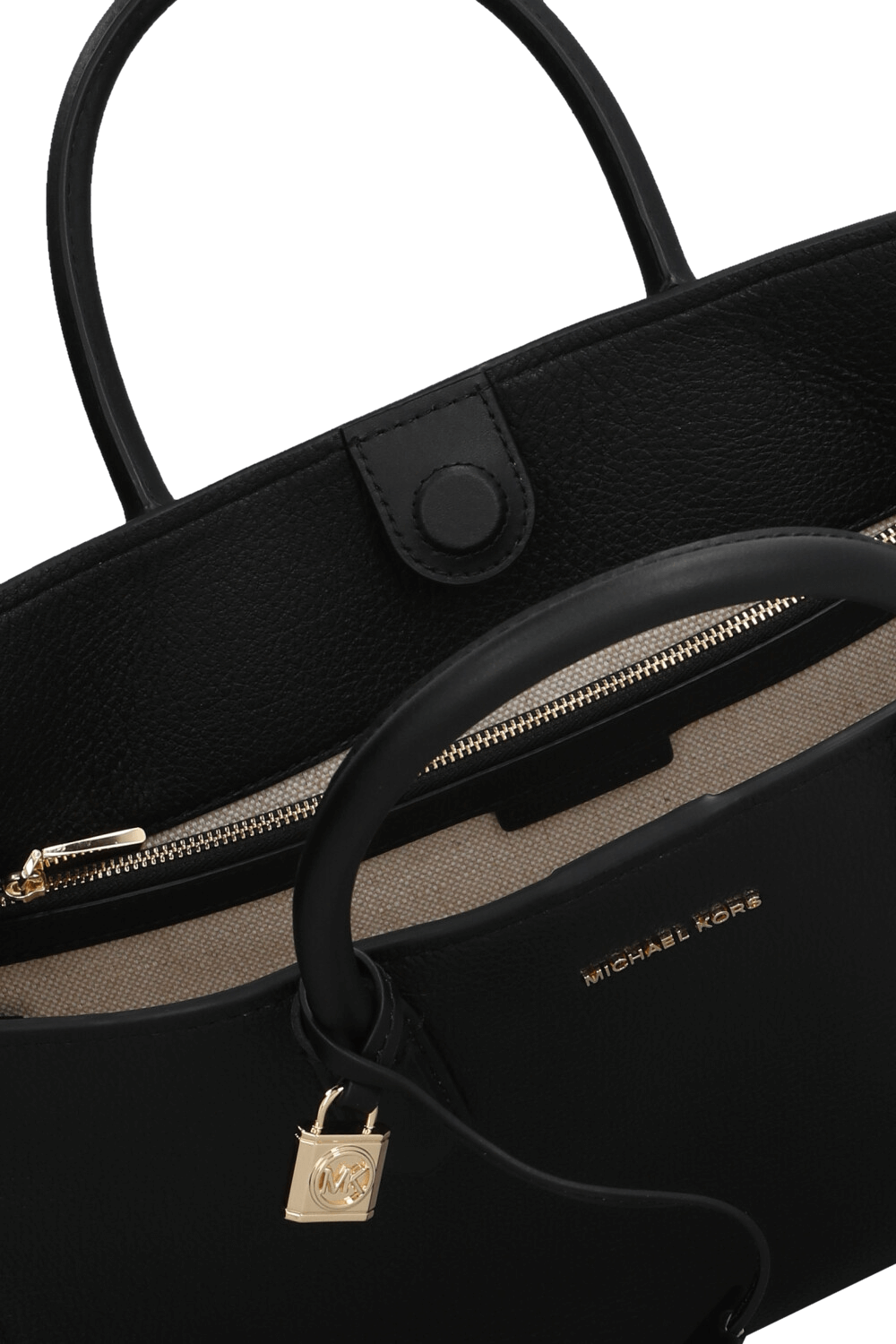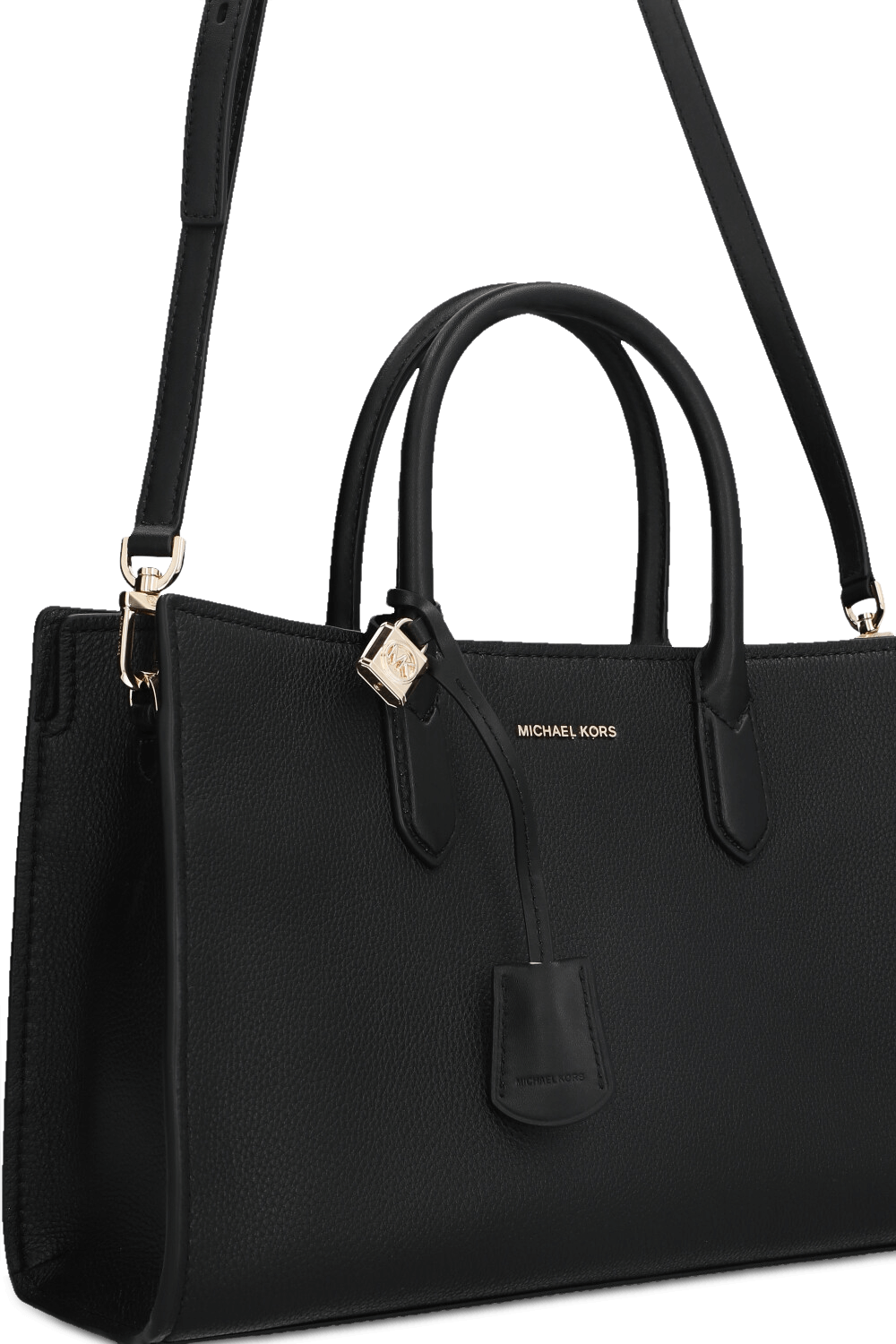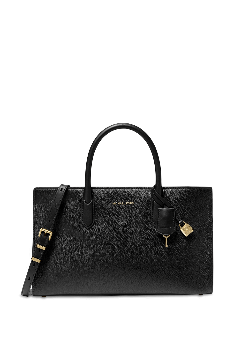 תיק קרוסבודי Scarlett בגודל מדיום מבית Michael Kors, עשוי עור בצבע שחור ובעיצוב מנעול לוגו זהוב בחזית. לתיק תא מרכזי בסגירת כפתור מגנט, בשילוב כיס פנימי קטן. לתיק ידיות אחיזה ורצועת נשיאה מתכווננת.