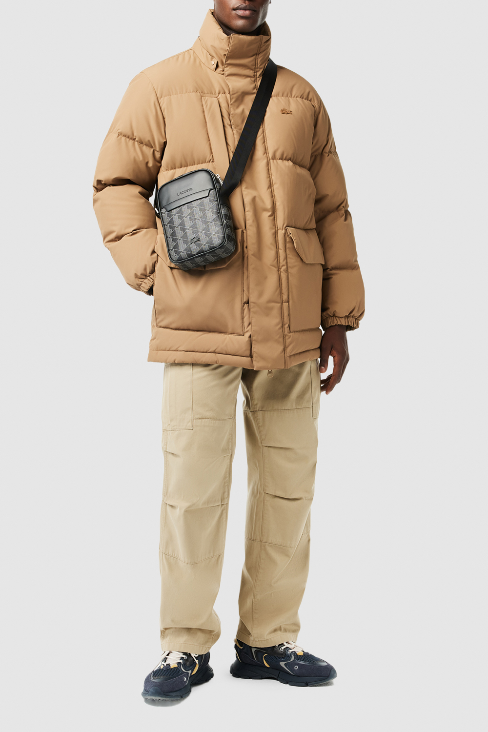 תיק צד מבית Lacoste, עשוי PVC בצבע שחור עם הדפס מונוגרמי לבן והטבעת לוגו. לתיק תא עם כיס פנימי ורצועת קרוס מתכווננת.