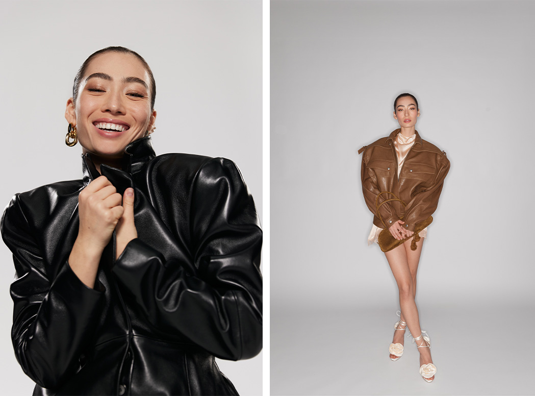 פריטי עור הוא על־זמניים, כאלה שמעולם לא באמת יוצאים מהאופנה, והחורף הזה מעמדו רק מתחזק. העונה אנחנו רואים פריטי עור שמדברים חזק לחורף: ג'קטים במגוון גזרות ופינשים, שמוסיפים נוכחות ואופי לכל מראה. זהו הפריט שהופך במהירות למוסכם כחובה בכל מלתחה: קלאסי, נועז ובטוח בעצמו, בדיוק כמו שטרנד אמיתי צריך להיות. בשני הלוקים, אמה לובשת פריטי עור מהקולקציה החדשה של MAGDA BUTRYM, אחד בצבע שחור עם גימור מבריק וגזרת כתפיים רחבות שמוסיפה נוכחות דרמטית, והשני ג'קט אוברסייז בגוון חום, עם אבזם חגורה שמדגיש את הקו ומוסיף טאץ' מודרני ואייקוני. לצד ג'קט האוברסייז ולהשלמת הטוטאל לוק של המותג, תיק כתף דגם Brigitte trapeze עשוי זמש בשילוב צ'ארם שני ורדים שנעשו בעבודת יד, סנדלי עקב עשויים סאטן, גם הם מעוטרים בשני פרחים תלת מימדים.