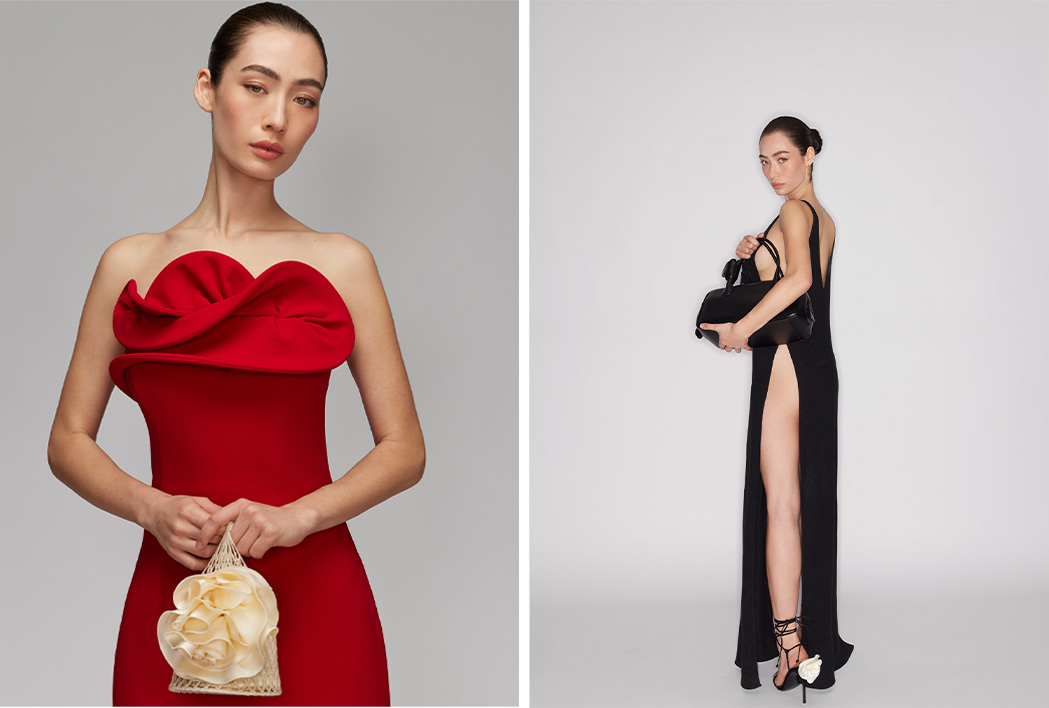 לקראת הוולנטיין, חג האהבה, הרכבנו לאמה 4 לוקים בגווני אדום ושחור קלאסיים, שבהם סילואט הפרח האייקוני של מגדה הופך לסמל של רומנטיקה ונשיות. הפרחים בבגדים מדגישים את החיבור בין עיצוב מודרני למוטיבים רומנטיים, והופכים כל הופעה לאלגנטית, נוכחת ומלאת קסם. בלוקים האדומים: שתי שמלות אדומות- מיני כיווצים מודרנית ומידיי סטרפלס קלאסית, שמביאות את הצבע לידי ביטוי עז ונוכח, ומסמלות את תשוקת האהבה והחגיגה של הוולנטיין. לצד הלוקים האדומים, אמה לובשת שני לוקים שחורים: אחד שמלת שסע אלגנטית, המלווה בתיק עור קלאסי מהקולקציה, והשני סט תואם של גופיה ומכנסיים.