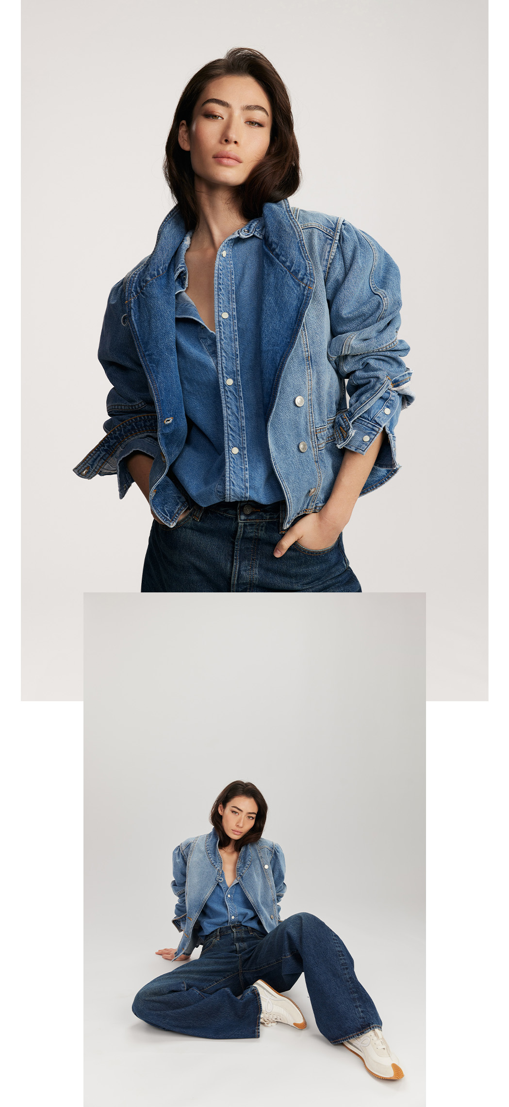 DENIM ON DENIM הקלאסיקה שלא מתיישנת, הג'ינס מעבר לפריט בסיסי הופך לשפה שלמה של שכבות, גזרות וצבעים שונים. מהטון הקלאסי ועד הגוונים המודרניים, שילוב נכון של אאוטפיטים מג'ינס מאפשר ליצור מראה עשיר, רב־ממדי ובעל נוכחות. בלוק של אמה ניתן לראות בדיוק את זה: לבושה בג'קט ג'ינס של ISABEL MARANT מתחתיו חולצה ג'ינס מכופתרת קלאסית של FRAME, ומכנס ג'ינס בגזרה נוחה של FRAME. להשלמת הלוק, אמה נועלת נעלי סניקרס דגם Flow runner מבית LOEWE.