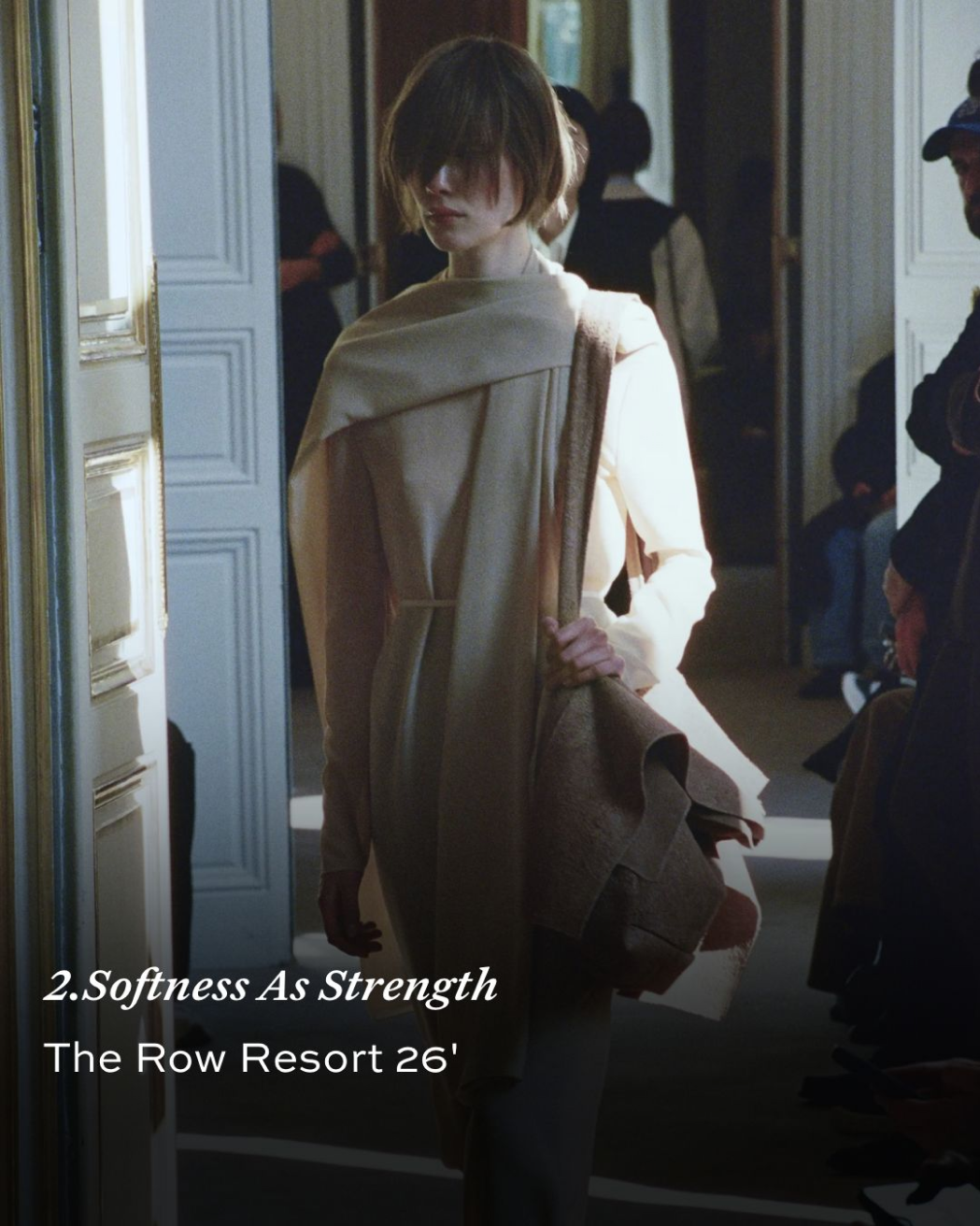 בדים רכים וסילואטות מעוגלות בצבעים רכים מבטאים עוצמה שקטה, נינוחה ורגשית, שמאתגרת את תפיסת הכוח המסורתית.