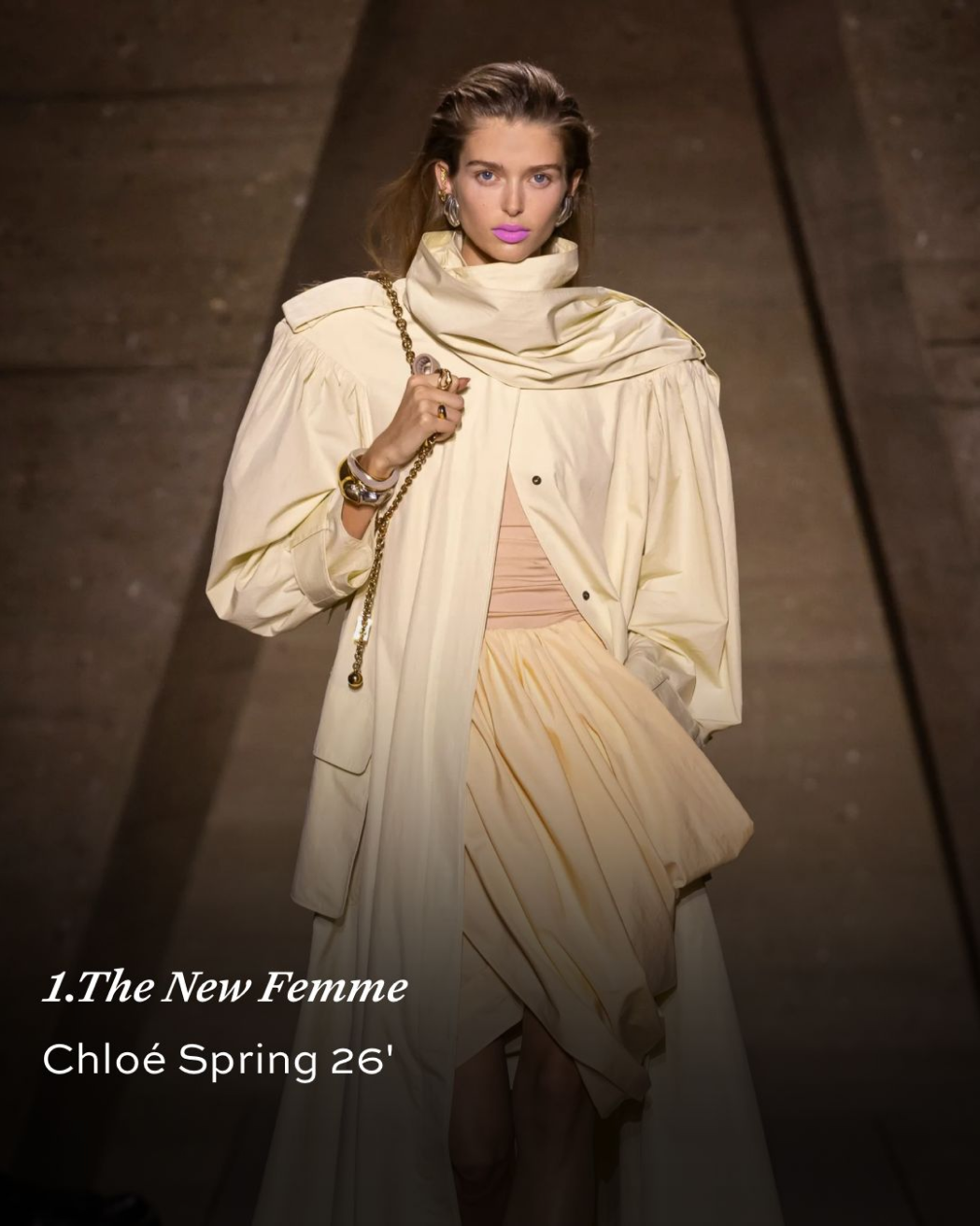 נשיות חדשה כוח ורוך: גזרות מחויטות לצד בדים זורמים ואלמנטים רומנטיים, ליצירת דמות נשית, בטוחה ומודרנית.