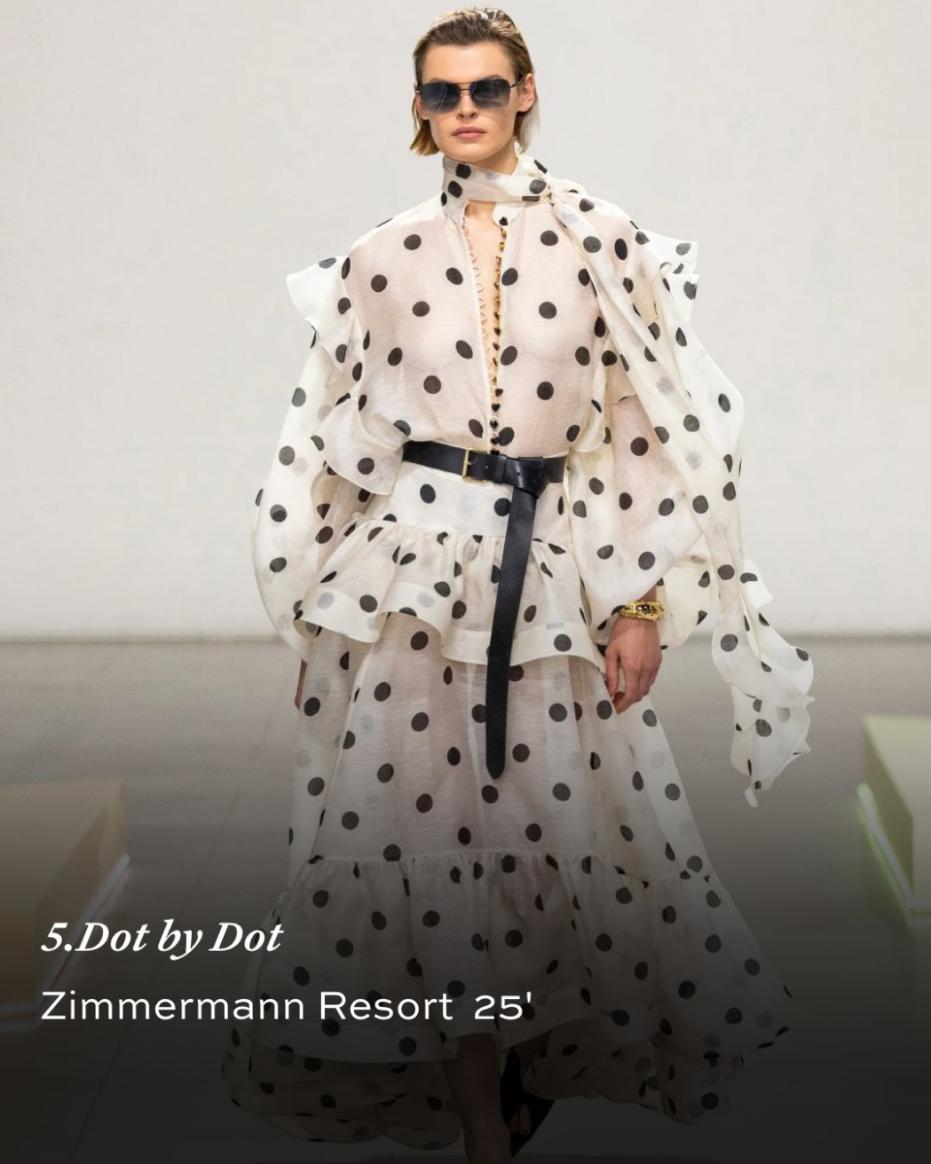 פולקה דוט חוזר כהדפס דומיננטי, עם פרשנות מודרנית, משחקי קנה מידה ונוכחות גרפית.