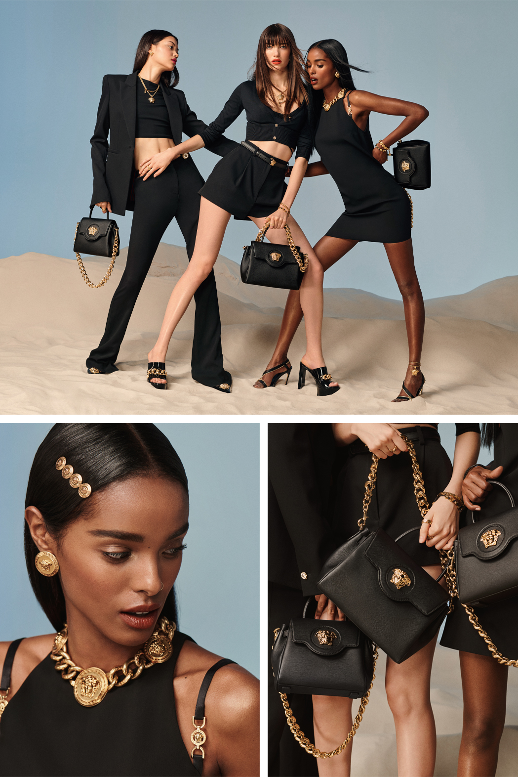 לצד אלו משתלבים נפלא גם סדרת דגמים על טהרת השחור, ביניהם חצאית מידי א-סימטרית עם קאט-אאוט מדויק בצד האגן, הנחתם בחגורה בעלת אבזם מתכת זהוב בדמות המדוזה האייקונית. אין ספק שזהו אחד מפריטי המפתח של העונה, ויש גם גרסת מכנסיים. החלק העליון התואם מציג טופ שחור ללא שרוולים שנראה תמים לכאורה עד שעוברים לגב ומגלים מחשוף מעוגל הנרכס באותו אלמנט מוזהב בדמות אבזם המדוזה. בשורה התחתונה, מדובר בחגיגה רצינית שפשוט אסור לפספס. קולקציית מדוזה של ורסצ'ה נמכרת בחנות פקטורי 54 ברמת אביב וכמובן גם באתר.
