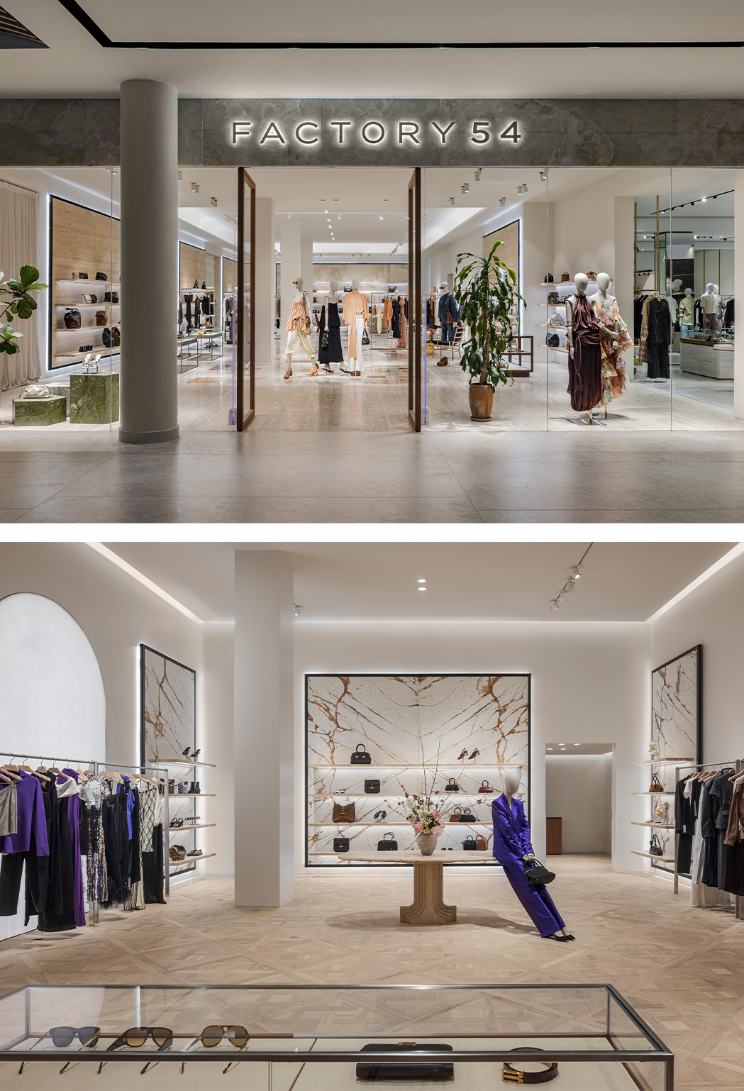מתחם הדגל החדש של Factory 54 נפתח בקניון רמת אביב, ומתרחב לכדי חלל כולל של כ-2,000 מ״ר לצד החנות הקיימת. המתחם בנוי סביב שדרה מרכזית, שלאורכה רצף חללים מובחנים. כל אחד מהם מתייחס לשפה אחרת, בין מוזיאונים עכשוויים לבתי אופנה בינלאומיים ויחד הם מייצרים תנועה, לא רק מעבר. זה אינו חלל אחיד, אלא מערכת של רגעים. פרספקטיבות משתנות, קצב, שכבות.