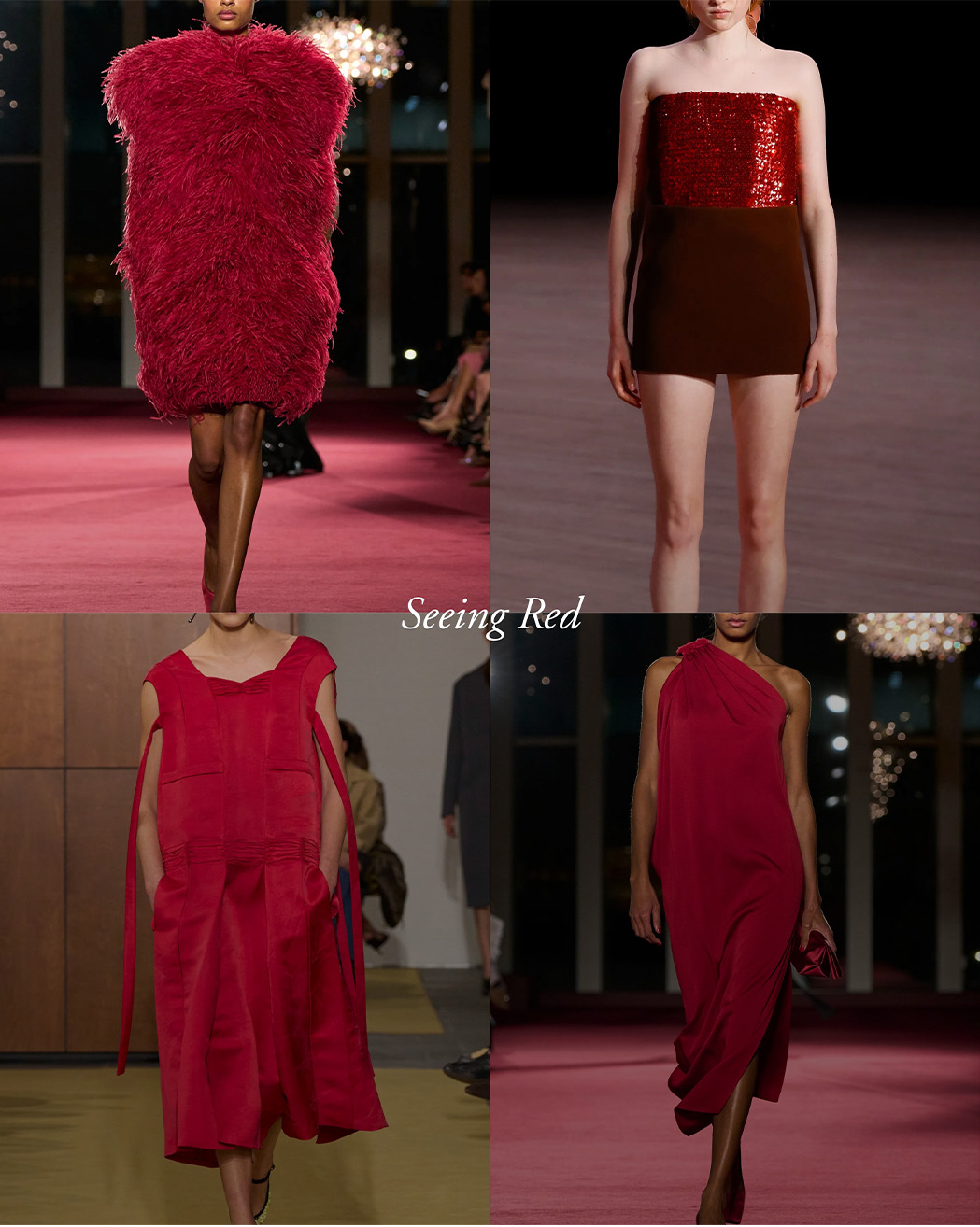 האדום של ‘FW26 הופיע בגווני Cherry Red, Ruby, Burgundy, Wine, Garnet במגוון פריטים על המסלול, החל ממחוך פייטים בגזרת סטרפלס של מארק ג’ייקובס, לשמלה אה סימטרית מבד נשפך של מייקל קורס ועד למעיל טרנץ’ עור של קלווין קליין. הבחירה בגווני אדום מסמל באופן אוניברסלי את השילוב בין תשוקה, אהבה ותעוזה, ומסב תשומת לב מיידית אל מי שלובשת אותו.