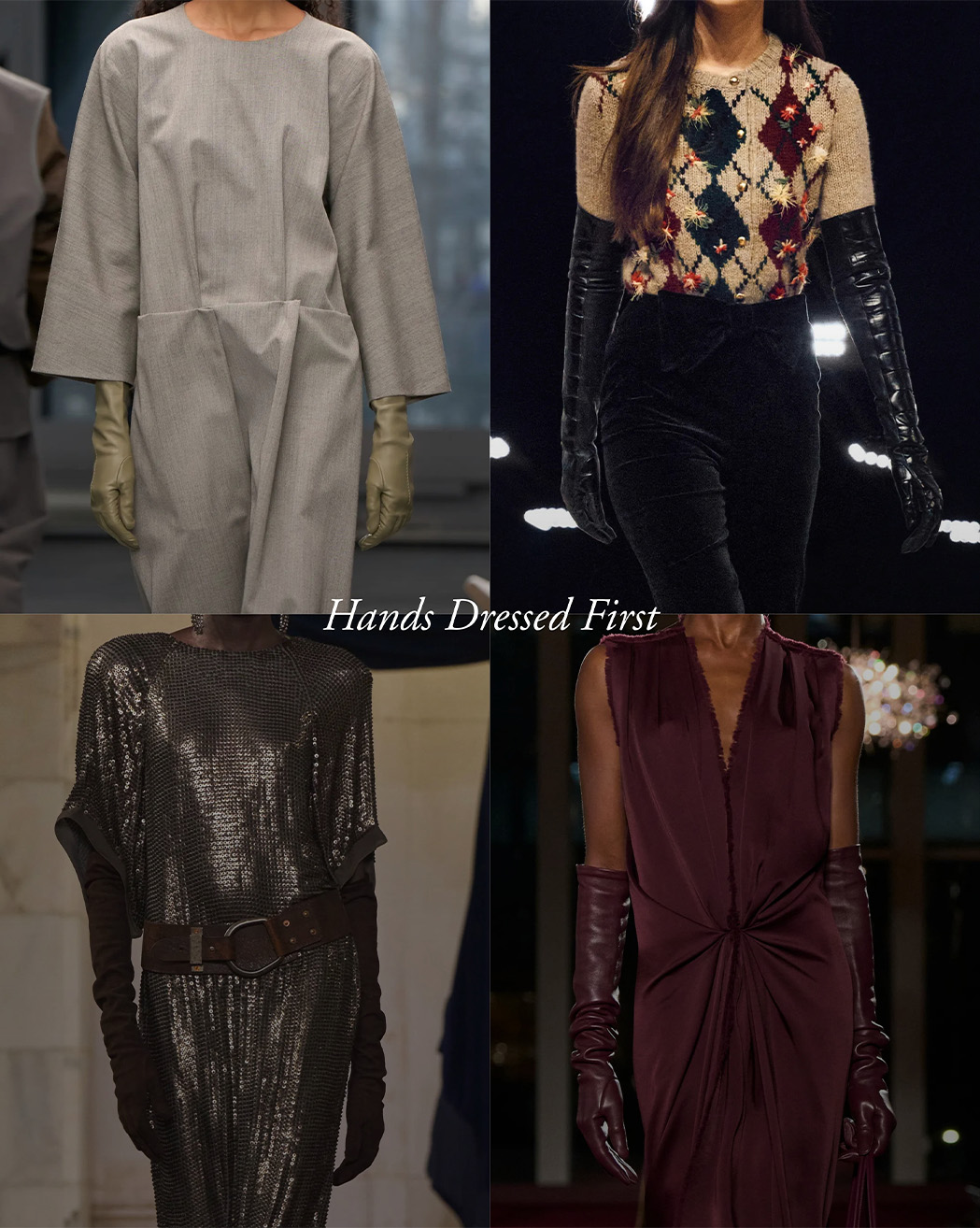 הכפפות עושות קאמבק היסטורי וקיבלו השנה תפקיד ומקום מובהק על המסלולים השונים. ראינו כפפות במגוון אורכים, טקסטורות ומרקמים. החזרה לככפות מתקשר באופן טבעי למחזוריות האופנה ולחיפוש השראה בעשורים קודמים, במיוחד בשנות ה-60 וה-70. זה חלק מהתנועה הרחבה יותר של חזרה למקורות, לערכי ה-vintage וה-retro שמשפיעים על העיצובים העכשוויים ומחברים בין העבר לפנטזיה של העתיד.