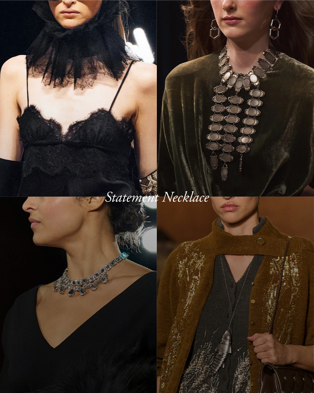 שרשראות סטייטמנט הופיעו בכל מקום אליו הסטתם את המבט כנקודת הפוקוס של הלוק. לעיתים מעל בגדים נקיים ומינימליים ולעתים כדובדבן מעל קצפת ללוקים מקסימליסטיים. הבחירה להדגיש את הצוואר והחזה יצרה איזון בין פשטות לאמירה נשית שלא מתנצלת על תשומת הלב שהיא מקבלת.