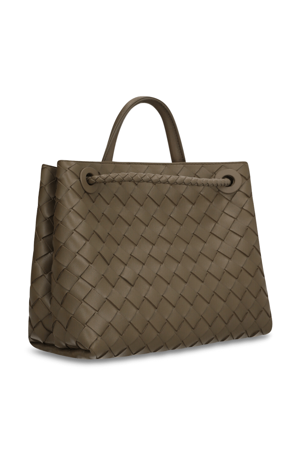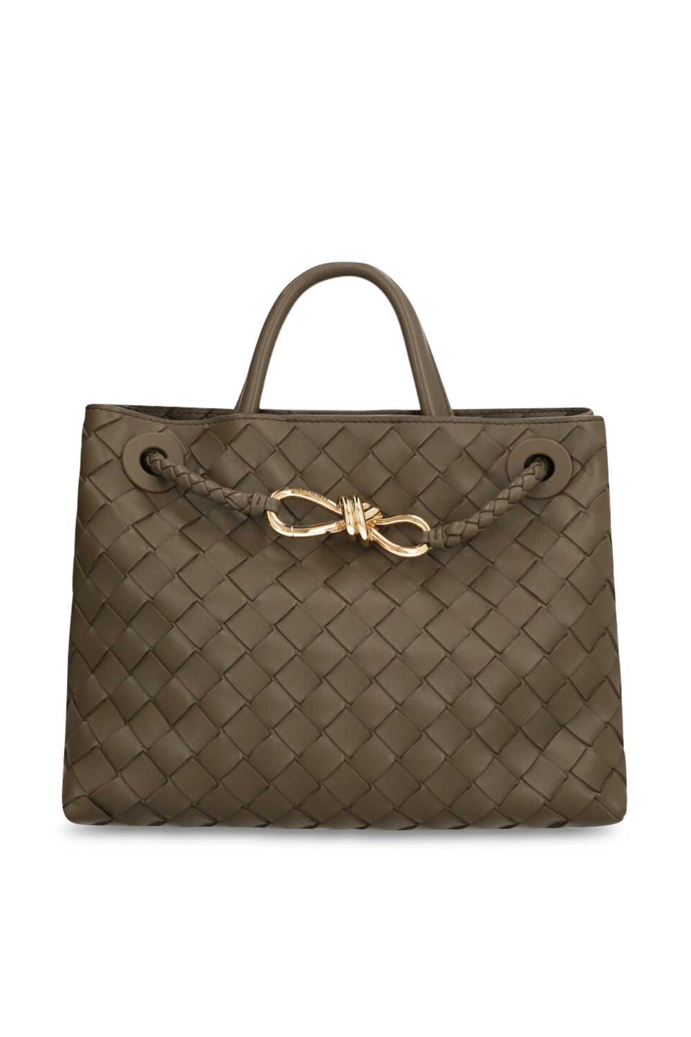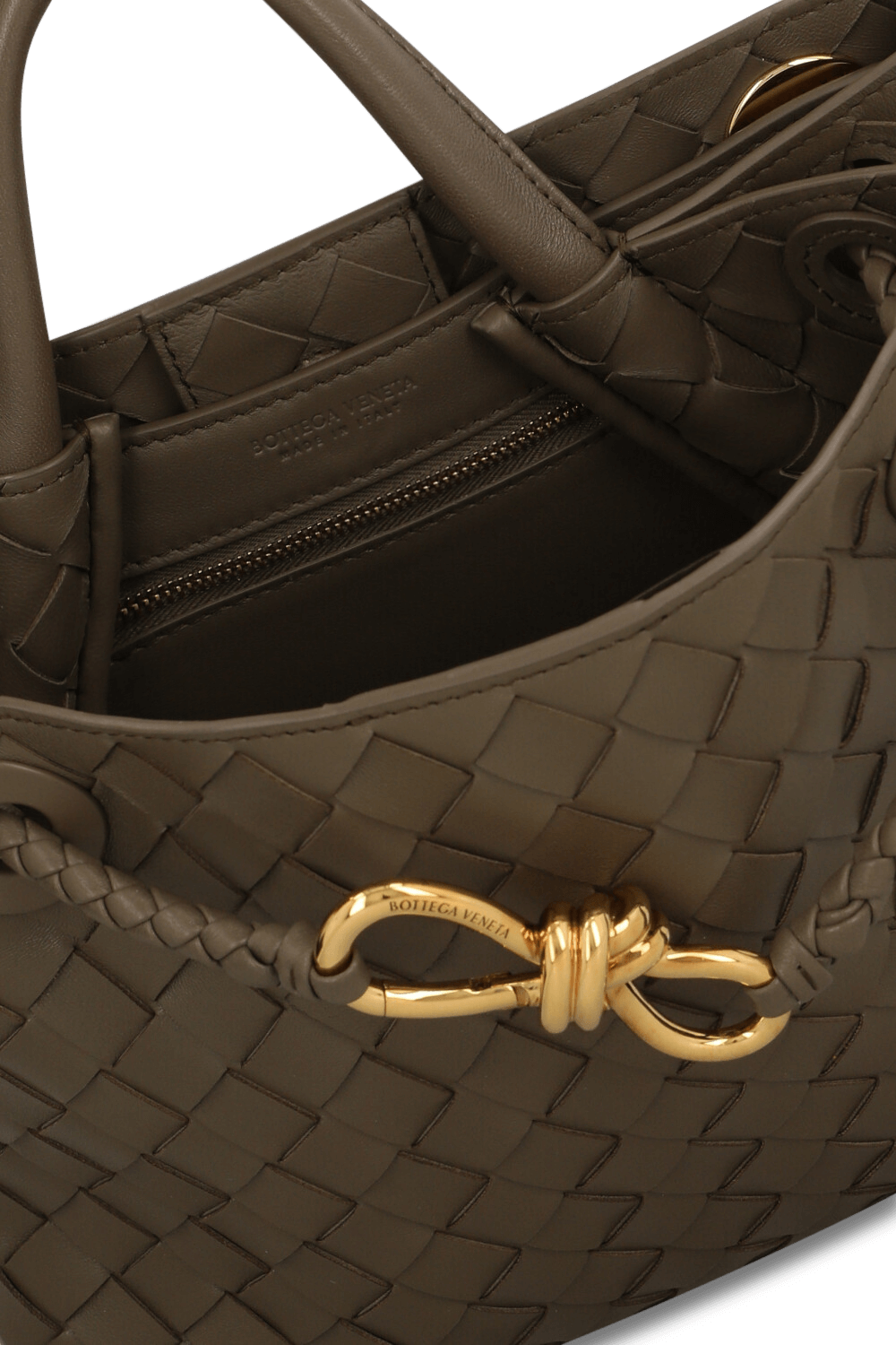 תיק Andiamo בגודל סמול מבית Bottega Veneta, עשוי עור רך בצבע חאקי, באריגת שתי וערב האייקונית של המותג האהוב. בחלוקתו הפנימית כיס בסגירת רוכסן וכיס פתוח נוסף. ברצועת הנשיאה משולב אלמנט מטאלי מוזהב הקשירה המזוהה עם המותג, וניתן לשאת אותו על הכתף או כקרוסבודי. נסגר במגנט.