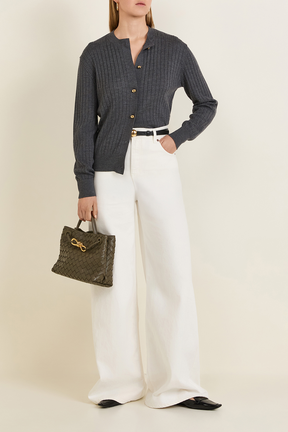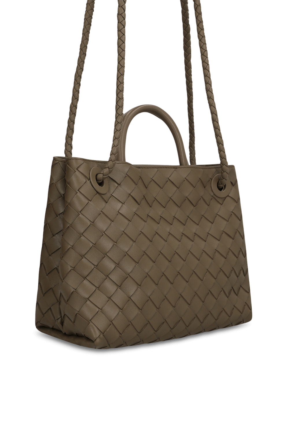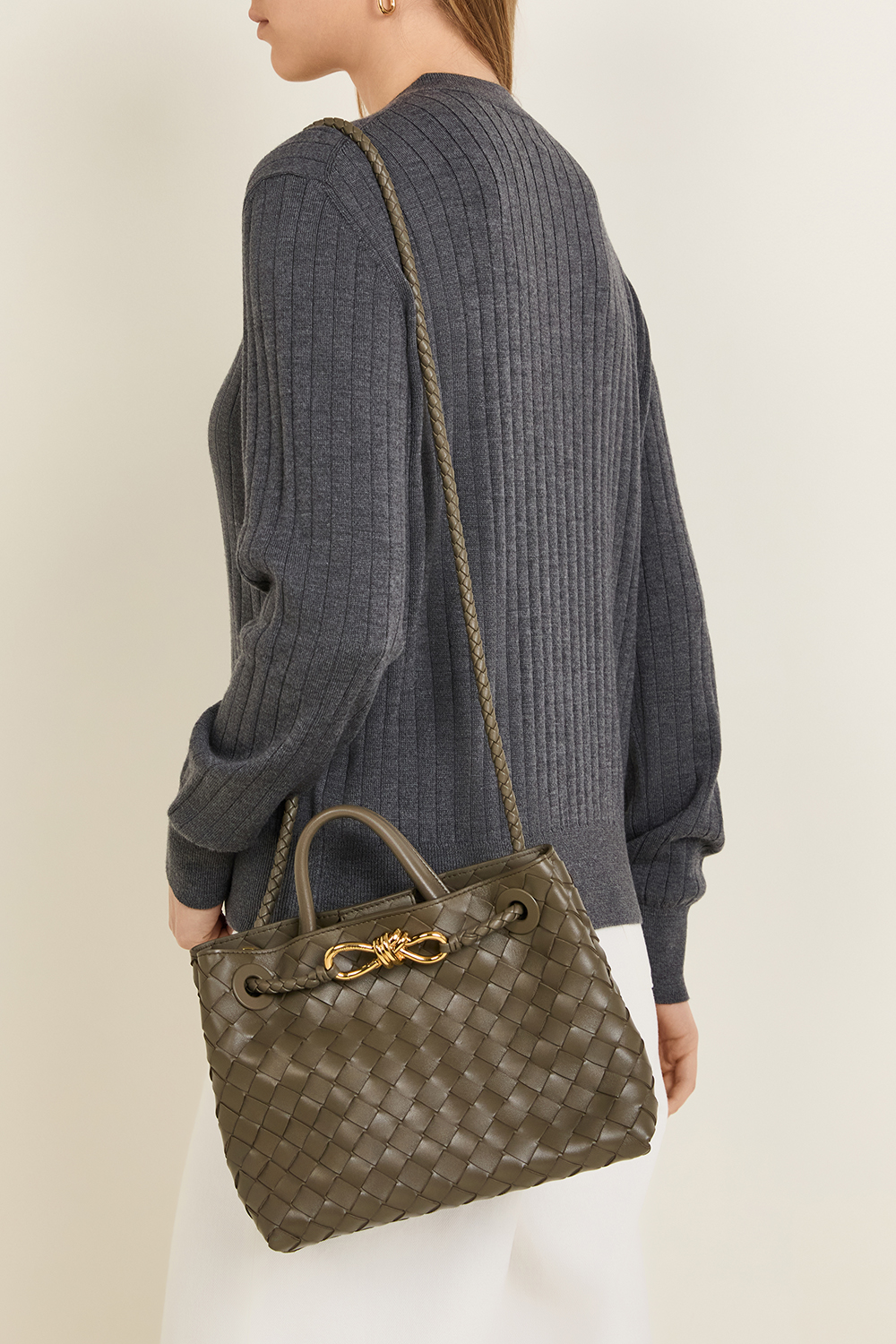 תיק Andiamo בגודל סמול מבית Bottega Veneta, עשוי עור רך בצבע חאקי, באריגת שתי וערב האייקונית של המותג האהוב. בחלוקתו הפנימית כיס בסגירת רוכסן וכיס פתוח נוסף. ברצועת הנשיאה משולב אלמנט מטאלי מוזהב הקשירה המזוהה עם המותג, וניתן לשאת אותו על הכתף או כקרוסבודי. נסגר במגנט.