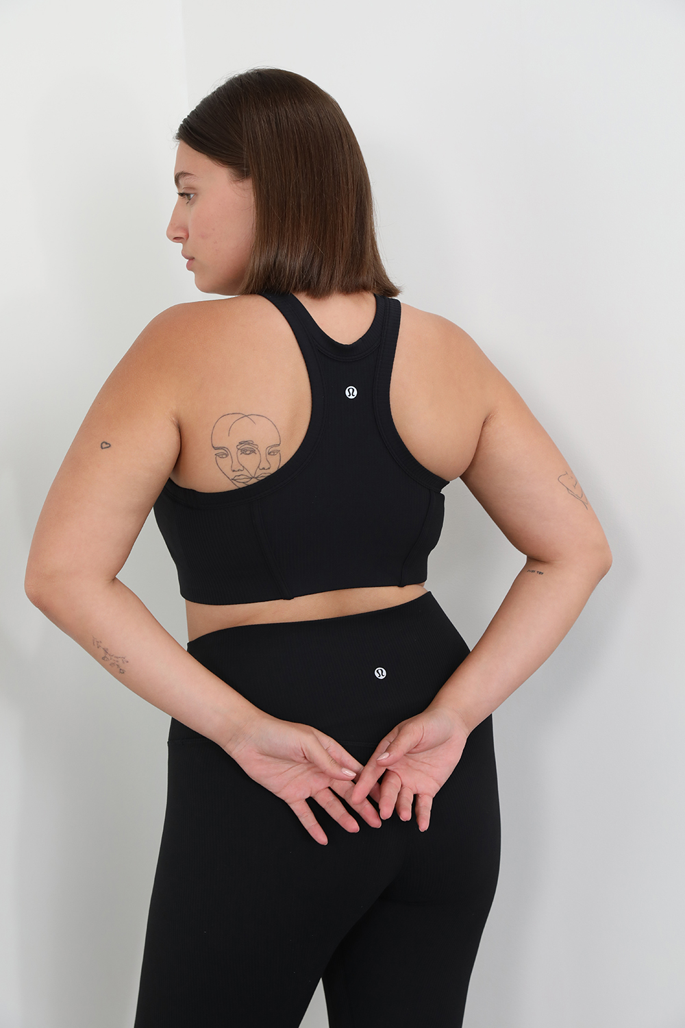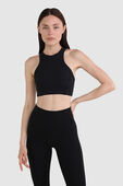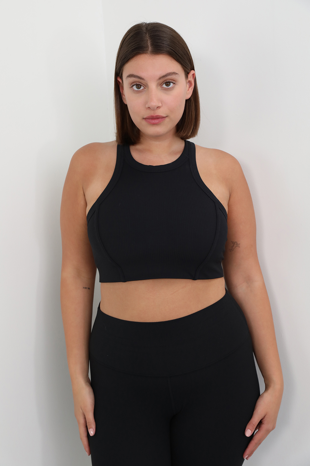 טופ ריב עשוי מבד Nulu הידוע כרך ועדין המתאים ליוגה ובעל צווארון גבוה. טכנולוגיה מנדף זיעה, מתייבש במהירות ותוספת סיבי Lycra לשימור הצורה ועבור מתיחה.